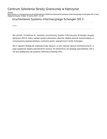 Centrum Szkolenia Straży Granicznej w Kętrzynie Źródło: http://www.cs.strazgraniczna.pl/cs/aktualnosci/1929,Uruchomienie-Systemu-Informacyjnego-Schengen-SIS-2.html Wygenerowano: Środa, 8 marca 2017, 21:36 Uruchomienie Systemu Informacyjnego Schengen SIS 2 Autor: We wtorek, 9 kwietnia br. zostanie uruchomiony System Informacyjny Schengen drugiej generacji (SIS II), który zastąpi system stosowany obecnie. Będzie jeszcze skuteczniejszy w utrzymywaniu bezpieczeństwa i ochronie granic zewnętrznych strefy Schengen. SIS II zapewni dostęp do większej liczby danych, w tym również danych biometrycznych, a jego wydajność będzie pięciokrotnie wyższa. W odróżnieniu od swojego poprzednika, SIS II ma być podłączony do systemu informacji wizowej (VIS). klikając w obrazek możesz pobrać ulotkę informacyjną w formacie PDF System Informacyjny Schengen to system informatyczny zawierający wpisy dotyczące osób zaginionych lub poszukiwanych oraz skradzionych przedmiotów, pojazdów czy dokumentów. To największa w Europie baza danych, która ułatwia wymianę informacji pomiędzy instytucjami państw w obszarze Schengen, kompensująca zniesienie kontroli na jej wewnętrznych granicach. Dostęp do systemu mają organy ścigania i wymiaru sprawiedliwości, w tym służby graniczne, celne i policyjne. Straż Graniczna uzyskała uprawnienie dostępu do danych wpisanych do Systemu Informacyjnego Schengen na podstawie Decyzji Rady Unii Europejskiej z dnia 12 czerwca 2007r. w sprawie stosowania przepisów dorobku Schengen dotyczącego Systemu Informacyjnego Schengen w nowych państwach członkowskich (2007/471/WE) oraz zgodnie z delegacją art. 3 ustawy z dnia 24 sierpnia 2007r. o udziale Rzeczypospolitej Polskiej w Systemie Informacyjnym Schengen i Systemie Informacji Wizowej (Dz. U. Nr 165, poz. 1170) od dnia 1 września 2007r. Więcej informacji:www.ec.europa.eu/dgs/home-affairs/sisiiwww.europa.eu