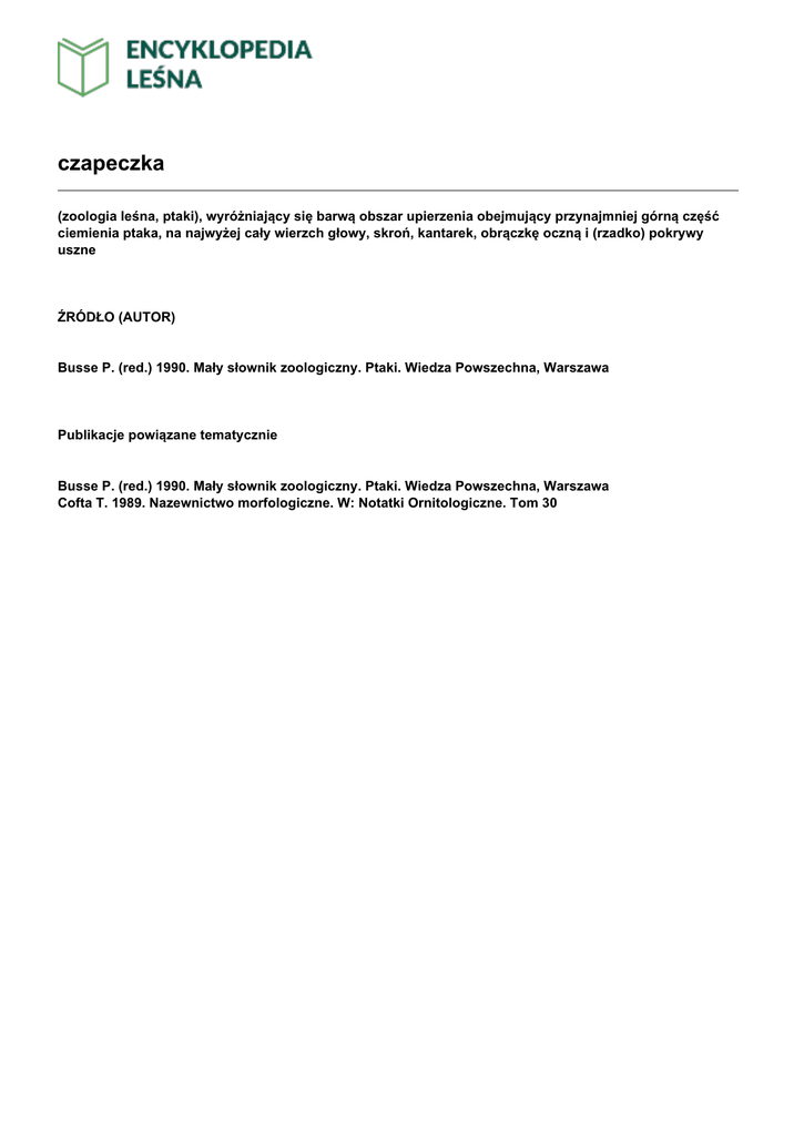 czapeczka (zoologia leśna, ptaki), wyróżniający się barwą obszar upierzenia obejmujący przynajmniej górną część ciemienia ptaka, na najwyżej cały wierzch głowy, skroń, kantarek, obrączkę oczną i (rzadko) pokrywy uszne ŹRÓDŁO (AUTOR) Busse P. (red.) 1990. Mały słownik zoologiczny. Ptaki. Wiedza Powszechna, Warszawa Publikacje powiązane tematycznie Busse P. (red.) 1990. Mały słownik zoologiczny. Ptaki. Wiedza Powszechna, Warszawa Cofta T. 1989. Nazewnictwo morfologiczne. W: Notatki Ornitologiczne. Tom 30
