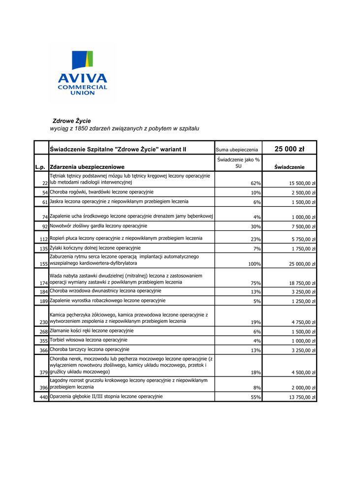 Zdrowe śycie wyciąg z 1850 zdarzeń związanych z pobytem w szpitalu Świadczenie Szpitalne "Zdrowe śycie" wariant II L.p. Zdarzenia ubezpieczeniowe Suma ubepieczenia Świadczenie jako % SU 25 000 zł Świadczenie Tętniak tętnicy podstawnej mózgu lub tętnicy kręgowej leczony operacyjnie 22 lub metodami radiologii interwencyjnej 62% 15 500,00 zł 54 Choroba rogówki, twardówki leczone operacyjnie 10% 2 500,00 zł 61 Jaskra leczona operacyjnie z niepowikłanym przebiegiem leczenia 6% 1 500,00 zł 74 Zapalenie ucha środkowego leczone operacyjnie drenaŜem jamy bębenkowej 4% 1 000,00 zł 30% 7 500,00 zł 23% 5 750,00 zł 7% 1 750,00 zł 100% 25 000,00 zł Wada nabyta zastawki dwudzielnej (mitralnej) leczona z zastosowaniem 174 operacji wymiany zastawki z powikłanym przebiegiem leczenia 75% 18 750,00 zł 184 Choroba wrzodowa dwunastnicy leczona operacyjnie 13% 3 250,00 zł 5% 1 250,00 zł 92 Nowotwór złośliwy gardła leczony operacyjnie 112 Ropień płuca leczony operacyjnie z niepowikłanym przebiegiem leczenia 135 śylaki kończyny dolnej leczone operacyjnie Zaburzenia rytmu serca leczone operacją implantacji automatycznego 155 wszepialnego kardiowertera-dyfibrylatora 189 Zapalenie wyrostka robaczkowego leczone operacyjnie Kamica pęcherzyka Ŝółciowego, kamica przewodowa leczone operacyjnie z 230 wytworzeniem zespolenia z niepowikłanym przebiegiem leczenia 19% 4 750,00 zł 268 Złamanie kości ręki leczone operacyjnie 6% 1 500,00 zł 355 Torbiel włosowa leczona operacyjnie 4% 1 000,00 zł 366 Choroba tarczycy leczona operacyjnie 13% 3 250,00 zł Choroba nerek, moczowodu lub pęcherza moczowego leczone operacyjnie (z wyłączeniem nowotworu złośliwego, kamicy układu moczowego, przetok i 379 gruźlicy układu moczowego) 18% 4 500,00 zł 8% 2 000,00 zł 55% 13 750,00 zł Łagodny rozrost gruczołu krokowego leczony operacyjnie z niepowiklanym 396 przebiegiem leczenia 440 Oparzenia głębokie II/III stopnia leczone operacyjnie