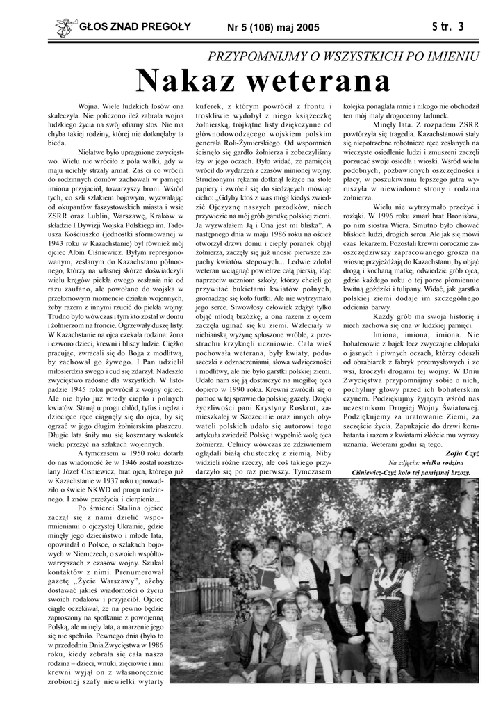 GŁOS ZNAD PREGOŁY Str. 3 Nr 5 (106) maj 2005 PRZYPOMNIJMY O WSZYSTKICH PO IMIENIU Nakaz weterana Wojna. Wiele ludzkich losów ona skaleczyła. Nie policzono ileż zabrała wojna ludzkiego życia na swój ofiarny stos. Nie ma chyba takiej rodziny, której nie dotknęłaby ta bieda. Niełatwe było upragnione zwycięstwo. Wielu nie wróciło z pola walki, gdy w maju ucichły strzały armat. Zaś ci co wrócili do rodzinnych domów zachowali w pamięci imiona przyjaciół, towarzyszy broni. Wśród tych, co szli szlakiem bojowym, wyzwalając od okupantów faszystowskich miasta i wsie ZSRR oraz Lublin, Warszawę, Kraków w składzie I Dywizji Wojska Polskiego im. Tadeusza Kościuszko (jednostki sformowanej w 1943 roku w Kazachstanie) był również mój ojciec Albin Ciśniewicz. Byłym represjonowanym, zesłanym do Kazachstanu północnego, którzy na własnej skórze doświadczyli wielu kręgów piekła owego zesłania nie od razu zaufano, ale powołano do wojska w przełomowym momencie działań wojennych, żeby razem z innymi rzucić do piekła wojny. Trudno było wówczas i tym kto został w domu i żołnierzom na froncie. Ogrzewały duszę listy. W Kazachstanie na ojca czekała rodzina: żona i czworo dzieci, krewni i bliscy ludzie. Ciężko pracując, zwracali się do Boga z modlitwą, by zachował go żywego. I Pan udzielił miłosierdzia swego i cud się zdarzył. Nadeszło zwycięstwo radosne dla wszystkich. W listopadzie 1945 roku powrócił z wojny ojciec. Ale nie było już wtedy ciepło i polnych kwiatów. Stanął u progu chłód, tyfus i nędza i dziecięce ręce ciągnęły się do ojca, by się ogrzać w jego długim żołnierskim płaszczu. Długie lata śniły mu się koszmary wskutek wielu przeżyć na szlakach wojennych. A tymczasem w 1950 roku dotarła do nas wiadomość że w 1946 został rozstrzelany Józef Ciśniewicz, brat ojca, którego już w Kazachstanie w 1937 roku uprowadziło o świcie NKWD od progu rodzinnego. I znów przeżycia i cierpienia... Po śmierci Stalina ojciec zaczął się z nami dzielić wspomnieniami o ojczystej Ukrainie, gdzie minęły jego dzieciństwo i młode lata, opowiadał o Polsce, o szlakach bojowych w Niemczech, o swoich współtowarzyszach z czasów wojny. Szukał kontaktów z nimi. Prenumerował gazetę „Życie Warszawy”, ażeby dostawać jakieś wiadomości o życiu swoich rodaków i przyjaciół. Ojciec ciągle oczekiwał, że na pewno będzie zaproszony na spotkanie z powojenną Polską, ale minęły lata, a marzenie jego się nie spełniło. Pewnego dnia (było to w przededniu Dnia Zwycięstwa w 1986 roku, kiedy zebrała się cała nasza rodzina – dzieci, wnuki, zięciowie i inni krewni wyjął on z własnoręcznie zrobionej szafy niewielki wytarty kuferek, z którym powrócił z frontu i troskliwie wydobył z niego książeczkę żołnierską, trójkątne listy dziękczynne od głównodowodzącego wojskiem polskim generała Roli-Żymierskiego. Od wspomnień ścisnęło się gardło żołnierza i zobaczyliśmy łzy w jego oczach. Było widać, że pamięcią wrócił do wydarzeń z czasów minionej wojny. Strudzonymi rękami dotknął leżące na stole papiery i zwrócił się do siedzących mówiąc cicho: „Gdyby ktoś z was mógł kiedyś zwiedzić Ojczyznę naszych przodków, niech przywiezie na mój grób garstkę polskiej ziemi. Ja wyzwalałem Ją i Ona jest mi bliska”. A następnego dnia w maju 1986 roku na oścież otworzył drzwi domu i ciepły poranek objął żołnierza, zaczęły się już unosić pierwsze zapachy kwiatów stepowych... Ledwie zdołał weteran wciągnąć powietrze całą piersią, idąc naprzeciw uczniom szkoły, którzy chcieli go przywitać bukietami kwiatów polnych, gromadząc się koło furtki. Ale nie wytrzymało jego serce. Siwowłosy człowiek zdążył tylko objąć młodą brzózkę, a ona razem z ojcem zaczęła uginać się ku ziemi. Wzleciały w niebiańską wyżynę spłoszone wróble, z przestrachu krzyknęli uczniowie. Cała wieś pochowała weterana, były kwiaty, poduszeczki z odznaczeniami, słowa wdzięczności i modlitwy, ale nie było garstki polskiej ziemi. Udało nam się ją dostarczyć na mogiłkę ojca dopiero w 1990 roku. Krewni zwrócili się o pomoc w tej sprawie do polskiej gazety. Dzięki życzliwości pani Krystyny Roskrut, zamieszkałej w Szczecinie oraz innych obywateli polskich udało się autorowi tego artykułu zwiedzić Polskę i wypełnić wolę ojca żołnierza. Celnicy wówczas ze zdziwieniem oglądali białą chusteczkę z ziemią. Niby widzieli różne rzeczy, ale coś takiego przydarzyło się po raz pierwszy. Tymczasem kolejka ponaglała mnie i nikogo nie obchodził ten mój mały drogocenny ładunek. Minęły lata. Z rozpadem ZSRR powtórzyła się tragedia. Kazachstanowi stały się niepotrzebne robotnicze ręce zesłanych na wieczyste osiedlenie ludzi i zmuszeni zaczęli porzucać swoje osiedla i wioski. Wśród wielu podobnych, pozbawionych oszczędności i płacy, w poszukiwaniu lepszego jutra wyruszyła w niewiadome strony i rodzina żołnierza. Wielu nie wytrzymało przeżyć i rozłąki. W 1996 roku zmarł brat Bronisław, po nim siostra Wiera. Smutno było chować bliskich ludzi, drogich sercu. Ale jak się mówi czas lekarzem. Pozostali krewni corocznie zaoszczędziwszy zapracowanego grosza na wiosnę przyjeżdżają do Kazachstanu, by objąć drogą i kochaną matkę, odwiedzić grób ojca, gdzie każdego roku o tej porze płomiennie kwitną goździki i tulipany. Widać, jak garstka polskiej ziemi dodaje im szczególnego odcienia barwy. Każdy grób ma swoja historię i niech zachowa się ona w ludzkiej pamięci. Imiona, imiona, imiona. Nie bohaterowie z bajek lecz zwyczajne chłopaki o jasnych i piwnych oczach, którzy odeszli od obrabiarek z fabryk przemysłowych i ze wsi, kroczyli drogami tej wojny. W Dniu Zwycięstwa przypomnijmy sobie o nich, pochylmy głowy przed ich bohaterskim czynem. Podziękujmy żyjącym wśród nas uczestn