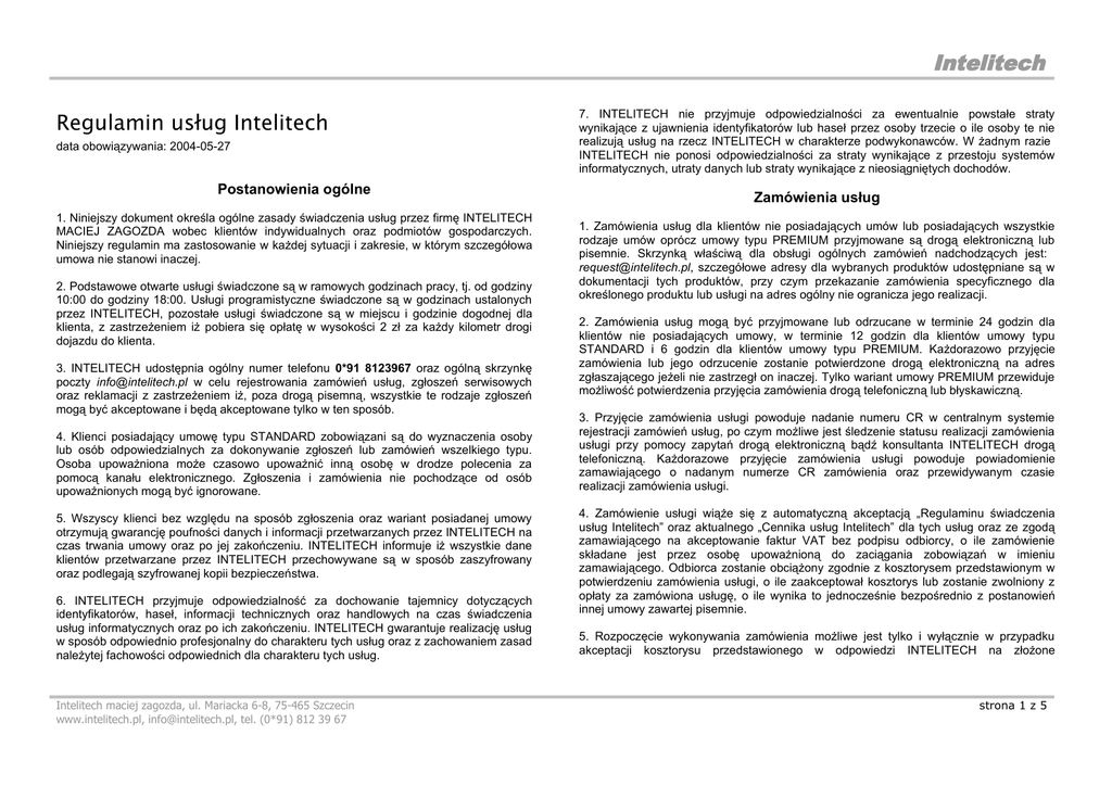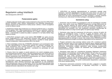 Intelitech Regulamin usług Intelitech data obowiązywania: 2004-05-27 Postanowienia ogólne 1. Niniejszy dokument określa ogólne zasady świadczenia usług przez firmę INTELITECH MACIEJ ZAGOZDA wobec klientów indywidualnych oraz podmiotów gospodarczych. Niniejszy regulamin ma zastosowanie w każdej sytuacji i zakresie, w którym szczegółowa umowa nie stanowi inaczej. 2. Podstawowe otwarte usługi świadczone są w ramowych godzinach pracy, tj. od godziny 10:00 do godziny 18:00. Usługi programistyczne świadczone są w godzinach ustalonych przez INTELITECH, pozostałe usługi świadczone są w miejscu i godzinie dogodnej dla klienta, z zastrzeżeniem iż pobiera się opłatę w wysokości 2 zł za każdy kilometr drogi dojazdu do klienta. 3. INTELITECH udostępnia ogólny numer telefonu 0*91 8123967 oraz ogólną skrzynkę poczty [email protected] w celu rejestrowania zamówień usług, zgłoszeń serwisowych oraz reklamacji z zastrzeżeniem iż, poza drogą pisemną, wszystkie te rodzaje zgłoszeń mogą być akceptowane i będą akceptowane tylko w ten sposób. 4. Klienci posiadający umowę typu STANDARD zobowiązani są do wyznaczenia osoby lub osób odpowiedzialnych za dokonywanie zgłoszeń lub zamówień wszelkiego typu. Osoba upoważniona może czasowo upoważnić inną osobę w drodze polecenia za pomocą kanału elektronicznego. Zgłoszenia i zamówienia nie pochodzące od osób upoważnionych mogą być ignorowane. 5. Wszyscy klienci bez względu na sposób zgłoszenia oraz wariant posiadanej umowy otrzymują gwarancję poufności danych i informacji przetwarzanych przez INTELITECH na czas trwania umowy oraz po jej zakończeniu. INTELITECH informuje iż wszystkie dane klientów przetwarzane przez INTELITECH przechowywane są w sposób zaszyfrowany oraz podlegają szyfrowanej kopii bezpieczeństwa. 6. INTELITECH przyjmuje odpowiedzialność za dochowanie tajemnicy dotyczących identyfikatorów, haseł, informacji technicznych oraz handlowych na czas świadczenia usług informatycznych oraz po ich zakończeniu. INTELITECH gwarantuje realizację usług w sposób odpowiednio profesjonalny do charakteru tych usług oraz z zachowaniem zasad należytej fachowości odpowiednich dla charakteru tych usług. Intelitech maciej zagozda, ul. Mariacka 6-8, 75-465 Szczecin www.intelitech.pl, [email protected], tel. (0*91) 812 39 67 7. INTELITECH nie przyjmuje odpowiedzialności za ewentualnie powstałe straty wynikające z ujawnienia identyfikatorów lub haseł przez osoby trzecie o ile osoby te nie realizują usług na rzecz INTELITECH w charakterze podwykonawców. W żadnym razie INTELITECH nie ponosi odpowiedzialności za straty wynikające z przestoju systemów informatycznych, utraty danych lub straty wynikające z nieosiągniętych dochodów. Zamówienia usług 1. Zamówienia usług dla klientów nie posiadających umów lub posiadających wszystkie rodzaje umów oprócz umowy typu PREMIUM przyjmowane są drogą elektroniczną lub pisemnie. Skrzynką właściwą dla obsługi ogólnych zamówień nadchodzących jest: [email protected], szczegółowe adresy dla wybranych produktów udostępniane są w dokumentacji tych produktów, przy czym przekazanie zamówienia specyficznego dla określonego produktu lub usługi na adres ogólny nie ogranicza jego realizacji. 2. Zamówienia usług mogą być przyjmowane lub odrzucane w terminie 24 godzin dla klientów nie posiadających umowy, w terminie 12 godzin dla klientów umowy typu STANDARD i 6 godzin dla klientów umowy typu PREMIUM. Każdorazowo przyjęcie zamówienia lub jego odrzucenie zostanie potwierdzone drogą elektroniczną na adres zgłaszającego jeżeli nie zastrzegł on inaczej. Tylko wariant umowy PREMIUM przewiduje możliwość potwierdzenia przyjęcia zamówienia drogą telefoniczną lub błyskawiczną. 3. Przyjęcie zamówienia usługi powoduje nadanie numeru CR w centralnym systemie rejestracji zamówień usług, po czym możliwe jest śledzenie statusu realizacji zamówienia usługi przy pomocy zapytań drogą elektroniczną bądź konsultanta INTELITECH drogą telefoniczną. Każdorazowe przyjęcie zamówienia usługi powoduje powiadomienie zamawiającego o nadanym numerze CR zamówienia oraz przewidywanym czasie realizacji zamówienia usługi. 4. Zamówienie usługi wiąże się z automatyczną akceptacją „Regulaminu świadczenia usług Intelitech” oraz aktualnego „Cennika usług Intelitech” dla tych usług oraz ze zgodą zamawiającego na akceptowanie faktur VAT bez podpisu odbiorcy, o ile zamówienie składane jest przez osobę upoważnioną do zaciągania zobowiązań w imieniu zamawiającego. Odbiorca zostanie obciążony zgodnie z kosztorysem przedstawionym w potwierdzeniu zamówienia usługi, o ile zaakceptował kosztorys lub zostanie zwolniony z opłaty za zamówiona usługę, o ile wynika to jednocześnie bezpośrednio z postanowień innej umowy zawartej pisemnie. 5. Rozpoczęcie wykonywania zamówienia możliwe jest tylko i wyłącznie w przypadku akceptacji kosztorysu przedstawionego w odpowiedzi INTELITECH na złożone strona 1 z 5 Intelitech zamówienie, a czas realizacji zamówienia liczony jest od dnia dokonania takiej akceptacji i otrzymania jej przez INTELITECH w formie pisemnej. Ogólne usługi informatyczne 1. Usługi serwisowania sprzętu komputerowego świadczone są tylko i wyłącznie w siedzibie INTELITECH jeżeli ogólny przewidywany czas realizacji usługi informatycznej przekracza jedną godzinę lub wymaga modyfikacji komponentów sprzętowych komputera. Koszty transportu sprzętu komputerowego do i z siedziby INTELITECH ponosi zamawiający. 2. Konfiguracja i instalacja oprogramowania na komputerach osobistych odbywa się na podstawie nośników i licencji dostarczonych przez klienta. Tylko przekazanie kompletu nośników z oprogramowaniem lub sterownikami gwarantuje poprawne wykonanie usługi instalacji oprogramowania. 3. INTELITECH nie ponosi odpowiedzialności (zarówno cywilnej