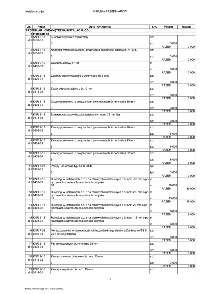 Instalacja co jar KSIĄŻKA PRZEDMIARÓW Lp. Podst Opis i