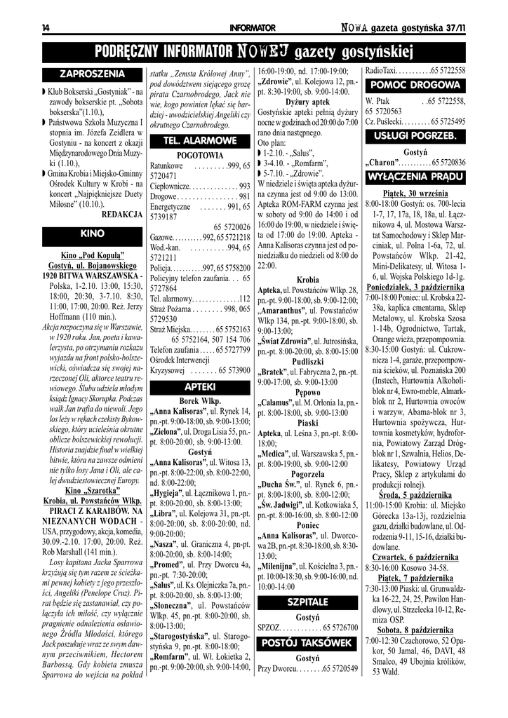 14 INFORMATOR NOWA gazeta gostyñska 37/11 PODRÊCZNY INFORMATOR NOWEJ gazety gostyñskiej ZAPROSZENIA statku Zemsta Królowej Anny, pod dowództwem siej¹cego grozê w Klub Bokserski Gostyniak - na pirata Czarnobrodego, Jack nie zawody bokserskie pt. Sobota wie, kogo powinien lêkaæ siê barbokserska(1.10.), dziej - uwodzicielskiej Angeliki czy w Pañstwowa Szko³a Muzyczna I okrutnego Czarnobrodego. stopnia im. Józefa Zeidlera w TEL. ALARMOWE Gostyniu - na koncert z okazji Miêdzynarodowego Dnia MuzyPOGOTOWIA ki (1.10.), Ratunkowe . . . . . . . . .999, 65 w Gmina Krobia i Miejsko-Gminny 5720471 Orodek Kultury w Krobi - na Ciep³ownicze. . . . . . . . . . . . . . 993 koncert Najpiêkniejsze Duety Drogowe . . . . . . . . . . . . . . . . 981 Mi³osne (10.10.). Energetyczne . . . . . . . 991, 65 REDAKCJA 5739187 65 5720026 KINO Gazowe. . . . . . . . . . 992, 65 5721218 Wod.-kan. . . . . . . . . . .994, 65 Kino Pod Kopu³¹ 5721211 Gostyñ, ul. Bojanowskiego Policja. . . . . . . . . . .997, 65 5758200 1920 BITWA WARSZAWSKA - Policyjny telefon zaufania. . . 65 Polska, 1-2.10. 13:00, 15:30, 5727864 18:00, 20:30, 3-7.10. 8:30, Tel. alarmowy. . . . . . . . . . . . . .112 11:00, 17:00, 20:00. Re¿. Jerzy Stra¿ Po¿arna . . . . . . . . 998, 065 Hoffmann (110 min.). 5729530 Akcja rozpoczyna siê w Warszawie, Stra¿ Miejska. . . . . . . . 65 5752163 w 1920 roku. Jan, poeta i kawa65 5752164, 507 154 706 lerzysta, po otrzymaniu rozkazu Telefon zaufania . . . . . 65 5727799 wyjazdu na front polsko-bolsze- Orodek Interwencji wicki, owiadcza siê swojej na- Kryzysowej . . . . . . . 65 573900 rzeczonej Oli, aktorce teatru reAPTEKI wiowego. lubu udziela m³odym ksi¹dz Ignacy Skorupka. Podczas Borek Wlkp. walk Jan trafia do niewoli. Jego Anna Kalisoras, ul. Rynek 14, los le¿y w rêkach czekisty Bykow- pn.-pt. 9:00-18:00, sb. 9:00-13:00; skiego, który ucielenia okrutne Zielona, ul. Droga Lisia 55, pn.oblicze bolszewickiej rewolucji. pt. 8:00-20:00, sb. 9:00-13:00. Historia znajdzie fina³ w wielkiej Gostyñ bitwie, która na zawsze odmieni Anna Kalisoras, ul. Witosa 13, nie tylko losy Jana i Oli, ale ca- pn.-pt. 8:00-22:00, sb. 8:00-22:00, ³ej dwudziestowiecznej Europy. nd. 8:00-22:00; Kino Szarotka Hygieja, ul. £¹cznikowa 1, pn.Krobia, ul. Powstañców Wlkp. pt. 8:00-20:00, sb. 8:00-13:00; PIRACI Z KARAIBÓW. NA Libra, ul. Kolejowa 31, pn.-pt. NIEZNANYCH WODACH - 8:00-20:00, sb. 8:00-20:00, nd. USA, przygodowy, akcja, komedia, 9:00-20:00; 30.09.-2.10. 17:00, 20:00. Re¿. Nasza, ul. Graniczna 4, pn-pt. Rob Marshall (141 min.). 8:00-20:00, sb. 8:00-14:00; Losy kapitana Jacka Sparrowa Promed, ul. Przy Dworcu 4a, krzy¿uj¹ siê tym razem ze cie¿ka- pn.-pt. 7:30-20:00; mi pewnej kobiety z jego przesz³o- Salus, ul. Ks. Olejniczka 7a, pn.ci, Angeliki (Penelope Cruz). Pi- pt. 8:00-20:00, sb. 8:00-13:00; rat bêdzie siê zastanawia³, czy po- S³oneczna, ul. Powstañców ³¹czy³a ich mi³oæ, czy wy³¹cznie Wlkp. 45, pn.-pt. 8:00-20:00, sb. pragnienie odnalezienia os³awio- 8:00-13:00; nego ród³a M³odoci, którego Starogostyñska, ul. StarogoJack poszukuje wraz ze swym daw- styñska 9, pn.-pt. 8:00-18:00; nym przeciwnikiem, Hectorem Romfarm, ul. W³. £okietka 2, Barboss¹. Gdy kobieta zmusza pn.-pt. 9:00-20:00, sb. 9:00-14:00, Sparrowa do wejcia na pok³ad 16:00-19:00, nd. 17:00-19:00; Zdrowie, ul. Kolejowa 12, pn.pt. 8:30-19:00, sb. 9:00-14:00. Dy¿ury aptek Gostyñskie apteki pe³ni¹ dy¿ury nocne w godzinach od 20:00 do 7:00 rano dnia nastêpnego. Oto plan: w 1-2.10. - Salus, w 3-4.10. - Romfarm, w 5-7.10. - Zdrowie. W niedziele i wiêta apteka dy¿urna czynna jest od 9:00 do 13:00. Apteka ROM-FARM czynna jest w soboty od 9:00 do 14:00 i od 16:00 do 19:00, w niedziele i wiêta od 17:00 do 19:00. Apteka Anna Kalisoras czynna jest od poniedzia³ku do niedzieli od 8:00 do 22:00. Krobia Apteka, ul. Powstañców Wlkp. 28, pn.-pt. 9:00-18:00, sb. 9:00-12:00; Amaranthus, ul. Powstañców Wlkp 134, pn.-pt. 9:00-18:00, sb. 9:00-13:00; wiat Zdrowia, ul. Jutrosiñska, pn.-pt. 8:00-20:00, sb. 8:00-15:00 Pudliszki Bratek, ul. Fabryczna 2, pn.-pt. 9:00-17:00, sb. 9:00-13:00 Pêpowo Calamus, ul. M. Or³onia 1a, pn.pt. 8:00-18:00, sb. 9:00-13:00 Piaski Apteka, ul. Lena 3, pn.-pt. 8:0018:00; Medica, ul. Warszawska 5, pn.pt. 8:00-19:00, sb. 9:00-12:00 Pogorzela Ducha w., ul. Rynek 6, pn.pt. 8:00-18:00, sb. 8:00-12:00; w. Jadwigi, ul. Kotkowiaka 5, pn.-pt. 8:00-16:00, sb. 8:00-12:00 Poniec Anna Kalisoras, ul. Dworcowa 2B, pn.-pt. 8:30-18:00, sb. 8:3013:00; Milenijna, ul. Kocielna 3, pn.pt. 10:00-18:30, sb. 9:00-16:00, nd. 10:00-14:00 SZPITALE Gostyñ SPZOZ. . . . . . . . . . . . 65 5726700 POSTÓJ TAKSÓWEK Gostyñ Przy Dworcu. . . . . . . .65 5720549 RadioTaxi. . . . . . . . . . .65 5722558 POMOC DROGOWA W. Ptak . .65 5722558, 65 5720563 Cz. Pulecki. . . . . . . . . 65 5725495 US£UGI POGRZEB. Gostyñ Charon. . . . . . . . . . . 65 5720836 WY£¥CZENIA PR¥DU Pi¹tek, 30 wrzenia 8:00-18:00 Gostyñ: os. 700-lecia 1-7, 17, 17a, 18, 18a, ul. £¹cznikowa 4, ul. Mostowa Warsztat Samochodowy i Sklep Marciniak, ul. Polna 1-6a, 72, ul. Powstañców Wlkp. 21-42, Mini-Delikatesy, ul. Witosa 16, ul. Wojska Polskiego 1d-1g. Poniedzia³ek, 3 padziernika 7:00-18:00 Poniec: ul. Krobska 2238a, kaplica cmentarna, Sklep Metalowy, ul. Krobska Szosa 1-14b, Ogrodnictwo, Tartak, Orange wie¿a, przepompownia. 8:30-15:00 Gostyñ: ul. Cukrownicza 1-4, gara¿e, przepompownia cieków, ul. Poznañska 200 (Instech, Hurtownia Alkoholiblok nr 4, Ewro-meble, Almarkblok nr 2, Hurtownia owoców i warzyw, Abama-blok nr 3, Hurtownia spo¿ywcza, Hurtownia kosmetyków, hydrofornia, Powiatowy Zarz¹d Drógblok nr 1, Szwalnia, Helios, Delikatesy, Powiatowy Urz¹d Pracy, Sklep z artyku³ami do produkcji rolnej). roda, 5 padziernika 11:00-15:00 Krobia: ul. Miejsko Górecka 13a-13j, rozdzielnia gazu, dzia³ki budowlane, ul. Odrodzenia 9-11, 15-16, dzia³ki budowlane. Czwartek, 6 padziernika 8:30-16:00 Kosowo 34-58. Pi¹tek, 7 padziernika 7:30-13:00 Pi