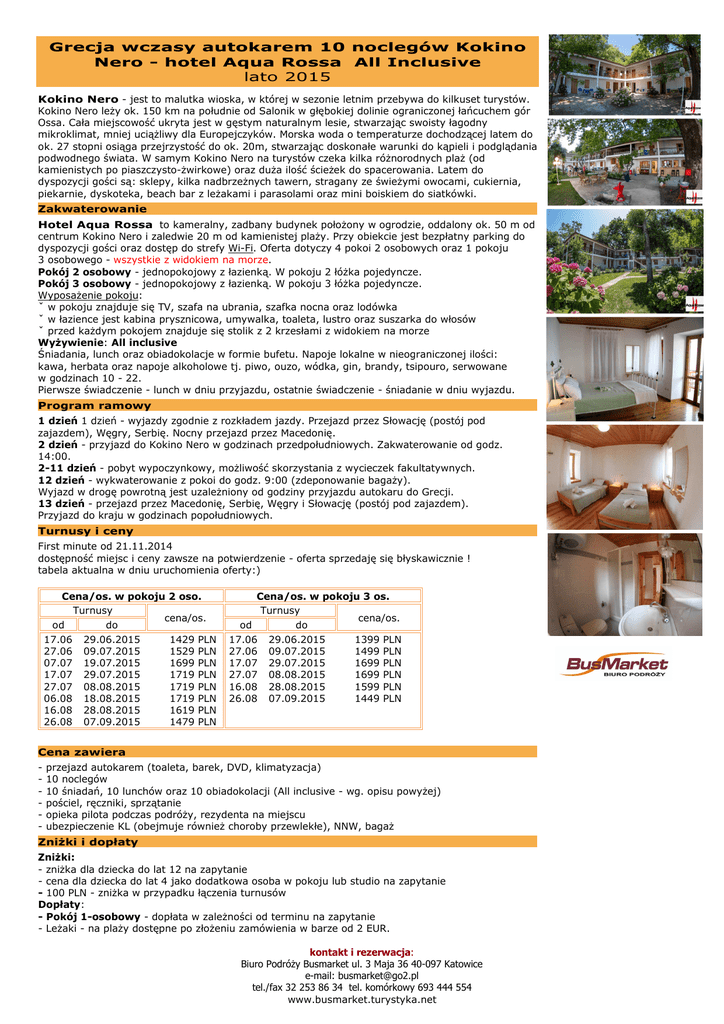 Grecja wczasy autokarem 10 noclegów Kokino Nero - hotel Aqua Rossa All Inclusive lato 2015 Kokino Nero - jest to malutka wioska, w której w sezonie letnim przebywa do kilkuset turystów. Kokino Nero leży ok. 150 km na południe od Salonik w głębokiej dolinie ograniczonej łańcuchem gór Ossa. Cała miejscowość ukryta jest w gęstym naturalnym lesie, stwarzając swoisty łagodny mikroklimat, mniej uciążliwy dla Europejczyków. Morska woda o temperaturze dochodzącej latem do ok. 27 stopni osiąga przejrzystość do ok. 20m, stwarzając doskonałe warunki do kąpieli i podglądania podwodnego świata. W samym Kokino Nero na turystów czeka kilka różnorodnych plaż (od kamienistych po piaszczysto-żwirkowe) oraz duża ilość ścieżek do spacerowania. Latem do dyspozycji gości są: sklepy, kilka nadbrzeżnych tawern, stragany ze świeżymi owocami, cukiernia, piekarnie, dyskoteka, beach bar z leżakami i parasolami oraz mini boiskiem do siatkówki. Zakwaterowanie Hotel Aqua Rossa to kameralny, zadbany budynek położony w ogrodzie, oddalony ok. 50 m od centrum Kokino Nero i zaledwie 20 m od kamienistej plaży. Przy obiekcie jest bezpłatny parking do dyspozycji gości oraz dostęp do strefy Wi-Fi. Oferta dotyczy 4 pokoi 2 osobowych oraz 1 pokoju 3 osobowego - wszystkie z widokiem na morze. Pokój 2 osobowy - jednopokojowy z łazienką. W pokoju 2 łóżka pojedyncze. Pokój 3 osobowy - jednopokojowy z łazienką. W pokoju 3 łóżka pojedyncze. Wyposażenie pokoju: ˇ w pokoju znajduje się TV, szafa na ubrania, szafka nocna oraz lodówka ˇ w łazience jest kabina prysznicowa, umywalka, toaleta, lustro oraz suszarka do włosów ˇ przed każdym pokojem znajduje się stolik z 2 krzesłami z widokiem na morze Wyżywienie: All inclusive Śniadania, lunch oraz obiadokolacje w formie bufetu. Napoje lokalne w nieograniczonej ilości: kawa, herbata oraz napoje alkoholowe tj. piwo, ouzo, wódka, gin, brandy, tsipouro, serwowane w godzinach 10 - 22. Pierwsze świadczenie - lunch w dniu przyjazdu, ostatnie świadczenie - śniadanie w dniu wyjazdu. Program ramowy 1 dzień 1 dzień - wyjazdy zgodnie z rozkładem jazdy. Przejazd przez Słowację (postój pod zajazdem), Węgry, Serbię. Nocny przejazd przez Macedonię. 2 dzień - przyjazd do Kokino Nero w godzinach przedpołudniowych. Zakwaterowanie od godz. 14:00. 2-11 dzień - pobyt wypoczynkowy, możliwość skorzystania z wycieczek fakultatywnych. 12 dzień - wykwaterowanie z pokoi do godz. 9:00 (zdeponowanie bagaży). Wyjazd w drogę powrotną jest uzależniony od godziny przyjazdu autokaru do Grecji. 13 dzień - przejazd przez Macedonię, Serbię, Węgry i Słowację (postój pod zajazdem). Przyjazd do kraju w godzinach popołudniowych. Turnusy i ceny First minute od 21.11.2014 dostępność miejsc i ceny zawsze na potwierdzenie - oferta sprzedaję się błyskawicznie ! tabela aktualna w dniu uruchomienia oferty:) Cena/os. w pokoju 2 oso. Turnusy cena/os. od do 17.06 29.06.2015 1429 PLN 27.06 09.07.2015 1529 PLN 07.07 19.07.2015 1699 PLN 17.07 29.07.2015 1719 PLN 27.07 08.08.2015 1719 PLN 06.08 18.08.2015 1719 PLN 16.08 28.08.2015 1619 PLN 26.08 07.09.2015 1479 PLN a Cena/os. w pokoju 3 os. Turnusy cena/os. od do 17.06 29.06.2015 1399 PLN 27.06 09.07.2015 1499 PLN 17.07 29.07.2015 1699 PLN 27.07 08.08.2015 1699 PLN 16.08 28.08.2015 1599 PLN 26.08 07.09.2015 1449 PLN Cena zawiera - przejazd autokarem (toaleta, barek, DVD, klimatyzacja) 10 noclegów 10 śniadań, 10 lunchów oraz 10 obiadokolacji (All inclusive - wg. opisu powyżej) pościel, ręczniki, sprzątanie opieka pilota podczas podróży, rezydenta na miejscu ubezpieczenie KL (obejmuje również choroby przewlekłe), NNW, bagaż Zniżki i dopłaty Zniżki: - zniżka dla dziecka do lat 12 na zapytanie - cena dla dziecka do lat 4 jako dodatkowa osoba w pokoju lub studio na zapytanie - 100 PLN - zniżka w przypadku łączenia turnusów Dopłaty: - Pokój 1-osobowy - dopłata w zależności od terminu na zapytanie - Leżaki - na plaży dostępne po złożeniu zamówienia w barze od 2 EUR. kontakt i rezerwacja: Biuro Podróży Busmarket ul. 3 Maja 36 40-097 Katowice e-mail: [email protected] tel./fax 32 253 86 34 tel. komórkowy 693 444 554 www.busmarket.turystyka.net - Wypożyczalnia rowerów - na telefon wypożyczenie roweru na 1 dzień 20 zł wypożyczenie roweru na 3 dni 35 zł wypożyczenie roweru na 6 dni 55 zł wypożyczenie roweru na 9 dni 70 zł wypożyczenie roweru na 10 dni 75 zł Informacje transportowe Gliwice :: Pl. Piastów obok sklepu "PIAST" :: 5.40 Zabrze :: Parking obok C.H. "KAUFLAND" ul. Korfantego 5 :: 6.00 Bytom :: Pl. Wolskiego za stacją paliw "BLISKA" :: 6.20 Katowice :: C.H. "BELG" ul. Przemysłowa 3 /stacja SHELL :: 7.00 Tychy :: Przystanek autobusowy vis a vis hotelu "TYCHY" :: 7.35 Pszczyna :: Przystanek obok sklepu "ALDI" ul. Broniewskiego 1 :: 7.55 Czechowice-Dziedzice :: Mc Donald's ul. Węglowa 15, przy DK 1 :: 8.05 Kraków :: ul. Kałuży za hotelem "CRACOVIA" :: 6.00 Kalwaria :: Dw. PKS :: 6.45 Wadowice :: Dw. PKP :: 7.00 Andrychów :: Zatoczka przy WSW Andoria :: 7.20 Kęty :: Dw. PKS :: 7.40 BIELSKO-BIAŁA :: DW. PKS (dolny plac) :: 8.30 Skoczów :: Stare targowisko przy Dw. PKS :: 8.50 Żory :: Dworzec autob. ul. Męczenników Oświęcimskich :: 7.00 Rybnik :: Stacja BP obok Mc Donald's ul. Budowlanych 4 :: 7.25 Wodzisław Śląski :: Stacja STATOIL przy Mc Donald's ul. Jastrzębska 2 :: 7.50 Jastrzębie-Zdrój :: Dworzec Arki Bożka ul. Podhalańska :: 8.25 Cieszyn-Boguszowice :: Przejście graniczne :: 9.15 Informujemy, że na trasie Gliwice-Bielsko, Kraków-Bielsko oraz Żory-Cieszyn przejazd może być realizowany innymi środkami transportu. W Bielsku-Białej lub Cieszynie istnieje możliwość przesiadki. kontakt i rezerwacja: Biuro Podróży Busmarket ul. 3 Maja 36 40-097 Katowice e-mail: [email protected] tel./fax 32 253 86 34 tel. komórkowy 693 444 554 www.busmarket.turystyka.net