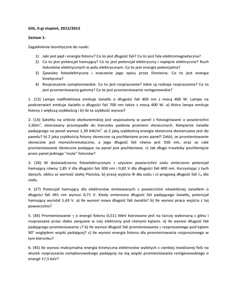 GIG, II-gi stopień, 2012/2013 Zestaw 1: Zagadnienia teoretyczne do nauki: 1) Jaki jest pęd i energia fotonu? Co to jest długość fali? Co to jest fala elektromagnetyczna? 2) Co to jest potencjał hamujący? Co to jest potencjał elektryczny i napięcie elektryczne? Ruch ładunków elektrycznych w polu elektrycznym. Co to jest energia potencjalna? 3) Zjawisko fotoelektryczne i znaczenie jego opisu przez Einsteina. Co to jest energia kinetyczna? 4) Rozpraszanie comptonowskie. Co to jest rozpraszanie? Jakie są rodzaje rozpraszania? Co to jest promieniowania gamma? Co to jest promieniowanie rentgenowskie? 1. (13) Lampa nadfioletowa emituje światło o długości fali 400 nm z mocą 400 W. Lampa na podczerwień emituje światło o długości fali 700 nm także z mocą 400 W. a) Która lampa emituje fotony z większą szybkością i b) ile ta szybkość wynosi? 2. (14) Satelita na orbicie okołoziemskiej jest wyposażony w panel z fotoogniwami o powierzchni 2,60m2, skierowany prostopadle do kierunku padania promieni słonecznych. Natężenie światła padającego na panel wynosi 1,39 kW/m2. a) Z jaką szybkością energia słoneczna dostarczana jest do panelu? b) Z jaką szybkością fotony słoneczne są pochłaniane przez panel? Załóż, ze promieniowanie słoneczne jest monochromatyczne, a jego długość fali równa jest 550 nm, oraz ze całe promieniowanie słoneczne padające na panel jest pochłaniane. c) Jak długo trwałoby pochłonięcie przez panel jednego "mola" fotonów? 3. (26) W doświadczeniu fotoelektrycznym z użyciem powierzchni sodu zmierzono potencjał hamujący równy 1,85 V dla długości fali 300 nm i 0,82 V dla długości fali 400 nm. Korzystając z tych danych, oblicz a) wartość stałej Plancka, b) pracę wyjścia dla sodu i c) progową długość fali 0 dla sodu. 4. (27) Potencjał hamujący dla elektronów emitowanych z powierzchni oświetlonej światłem o długości fali 491 nm wynosi 0,71 V. Kiedy zmieniono długość fali padającego światła, potencjał hamujący wyniósł 1,43 V. a) Ile wynosi nowa długość fali światła? b) Ile wynosi praca wyjścia z tej powierzchni? 5. (36) Promieniowanie o energii fotonu 0,511 MeV kierowane jest na tarczę wykonaną z glinu i rozpraszane przez słabo związane w niej elektrony pod różnymi kątami. a) Ile wynosi długość fali padającego promieniowania ? b) Ile wynosi długość fali promieniowania rozproszonego pod kątem 90° względem wiązki padającej? c) Ile wynosi energia fotonu dla promieniowania rozproszonego w tym kierunku? 6. (45) Ile wynosi maksymalna energia kinetyczna elektronów wybitych z cienkiej miedzianej folii na skutek rozpraszania comptonowskiego padającej na nią wiązki promieniowania rentgenowskiego o energii 17,5 keV?