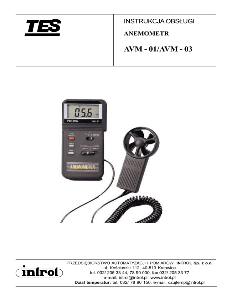INSTRUKCJA OBS£UGI ANEMOMETR AVM - 01/AVM - 03 PRZEDSIÊBIORSTWO AUTOMATYZACJI I POMIARÓW INTROL Sp. z o.o. ul. Kociuszki 112, 40-519 Katowice tel. 032/ 205 33 44, 78 90 000, fax 032/ 205 33 77 e-mail: [email protected], www.introl.pl Dzia³ temperatur: tel. 032/ 78 90 150, e-mail: [email protected] INTROL Sp. z o.o., ul. Kociuszki 112, 40-519 Katowice, tel. 032/ 78 90 150, fax 032/ 205 33 77, e-mail: [email protected], www.introl.pl SPIS TRECI 1.W³aciwoci ................................................................................... 3 2. Opis strony frontowej ................................................................... 3 3. Instrukcja dzia³ania. ..................................................................... 4 4. Specyfikacja (23± 5° C) ................................................................. 5 5.Wymiana baterii ............................................................................. 6 2 INTROL Sp. z o.o., ul. Kociuszki 112, 40-519 Katowice, tel. 032/ 78 90 150, fax 032/ 205 33 77, e-mail: [email protected], www.introl.pl 1.W³aciwoci * * * * * * * * Czu³oæ i dok³adnoæ (ultra niskie tarcie); Ergonomicznoæ i ³atwoæ u¿ytkowania; Mo¿liwoæ odczytu w czasie pomiaru; Du¿y wywietlacz 17mm, 3 1/2 cyfry LCD (ciek³okrystaliczny); 2 metrowy spiralny kabel, mo¿liwoæ montowania wysiêgnika; Niskie zu¿ycie energii Funkcja utrzymania danych; Wbudowany wskanik zu¿ycia baterii. 2. Opis strony frontowej 2-10 2-11 2-9 2-8 2-7 2-4 (AVM-03) 2-1 2-2 2-5 2-3 (AVM-03) Rysunek 1 Opisy do rysunku nr 1 2-1 przycisk za³¹czania/ wy³¹czania 2-2 przycisk utrzymania danych 2-3 przycisk utrzymania wartoci maksymalnej 2-4 prze³¹cznik wyboru funkcji 2-5 prze³¹cznik wyboru jednostek 2-6 symbole jednostek prêdkoci 2-7 symbole jednostek 2-8 symbol zu¿ycia baterii 2-9 symbol utrzymania/ max 2-10 symbol utrzymania danych 2-11 symbol b³êdów 3 INTROL Sp. z o.o., ul. Kociuszki 112, 40-519 Katowice, tel. 032/ 78 90 150, fax 032/ 205 33 77, e-mail: [email protected], www.introl.pl 3. Instrukcja dzia³ania. rysunek nr 2 A. 1. 2. 3. 4. 5. Mierzenie prêdkoci wiatru. Za³¹czyæ anemometr przez naciniêcie przycisku ON/OFF. Wybraæ funkcjê anemometra przez przesuniêcie prze³¹cznika. Wybraæ ¿¹dan¹ jednostkê przez przesuniêcie prze³¹cznika. Okreliæ kierunek wiatru. Przytrzymaæ anemometr tak, aby przep³ywaj¹ce powietrze przep³ywa³o przez wiatraczek od ty³u do przodu. 6. Poczekaæ 4 sek. aby siê odczyt siê ustabilizowa³. 7. Aby osi¹gn¹æ dok³adny rezultat, nale¿y utrzymaæ k¹t wynosz¹cy 20 pomiêdzy osi¹ wiatraczka a kierunkiem wiatru. B. 1. 2. 3. Mierzenie temperatury wiatru/ powietrza (AVM-03) Za³¹czyæ termo-anemometr przez naciniêcie przycisku ON/OFF. Wybraæ C lub F przez przesuniêcie prze³¹cznika. Pozwoliæ aby wiatr przep³ywa³ przez wiatraczek (termoelement A jest wbudowany w rodek wiatraczka). 4. Odczytaæ napis z wywietlacza. 4 INTROL Sp. z o.o., ul. Kociuszki 112, 40-519 Katowice, tel. 032/ 78 90 150, fax 032/ 205 33 77, e-mail: [email protected], www.introl.pl C. Utrzymanie odczytu Nacisn¹æ przycisk "HOLD" aby utrzymaæ wynik pomiaru prêdkoci wiatru lub temperatury. D.Funkcja znajdywania maksymalnej temperatury (AVM-03) Nale¿y nacisn¹æ przycisk "MAX" , maksymalna temperatura mierzona podczas pomiarów, bêdzie wywietlana na wywietlaczu. 4. Specyfikacja (23± 5 °C) Zakres prêdkoci wiatru: Zakres 0,0 - 45,0 0,0 - 8800 0,0 - 88,0 0,0 - 140,0 0,0 - 100 Jednostki m. / s ft / min knots Km / hr mph opcja Rozdzielczoæ n 0,1 10,0 0,1 0,1 0,1 Dok³adnoæ ±3 % ± 0,1 ± 3 % ± 10 ± 3 % ± 0,1 ± 3 % ± 0,1 ± 3 % ± 0,1 Próg 0,3 60,0 0,6 1,0 0,7 Tabela przeliczeniowa jednostek 1 m. / s 1 ft / min. 1 Knot 1 Km / hr 1 mph m. / s 1 0,00508 0,5144 0,2778 0,4464 ft / min. 196,87 1 101,27 54,69 87,89 knots 1,944 0,00987 1 0,54 0,8679 Km ./ hr 3,60 0,01829 1,8519 1 1,6071 mph 2,24 0,01138 1,1523 0,6222 1 Zakres temperatur °C °F Zakres 0 - 60,0 32,0 - 140,0 Rozdzielczoæ 0,1 0,1 5 Dok³adnoæ ± 0,8 ± 1,5 INTROL Sp. z o.o., ul. Kociuszki 112, 40-519 Katowice, tel. 032/ 78 90 150, fax 032/ 205 33 77, e-mail: [email protected], www.introl.pl Element nony : Czujnik temperatury : Zamocowanie : Temperatura pracy: miernik: wiatraczek: Wilgotnoæ pracy: Cinienie pracy Temperatura zapamiêtana: Zu¿ycie energii : Typ baterii: Czas u¿ytkowania baterii: Przeciêtny okres pomiaru prêdkoci wiatru: Wymiary: miernik: wiatraczek: Waga ( z bateri¹) : Akcesoria: ³o¿ysko szafirowe termoelement typu "K" ruba 1/4" x 20 ° C ~50 °C (32° F ~122° F) °C ~ 60° C (32° F ~140° F) mniej ni¿ 80% RH 500mB ~2 bar -40° C ~ 60° C (-40° F ~140° F) oko³o 6mA 9V 50 godzin m/s -0,6 sek km/ h - 2,2 sek. 88 x 168 x 26,2 mm 66 x 132 x 29,2 mm 350g instrukcja obs³ugi, bateria, obudowa. 5.Wymiana baterii Je¿eli zasilanie nie bêdzie wystarczaj¹ce , wywietli siê komunikat to znaczy, ¿e wymagana jest wymiana baterii. a) Nale¿y wy³¹czyæ anemometr przez przycisk ON/ OFF b) Nale¿y odkrêciæ rubê w przykrywce baterii i zdj¹æ przykrywkê. c) Wyj¹æ bateriê z przyrz¹du i w³o¿yæ now¹ bateriê 9V, a nastêpnie przykrêciæ rub¹ przykrywkê na swoje miejsce. 6
