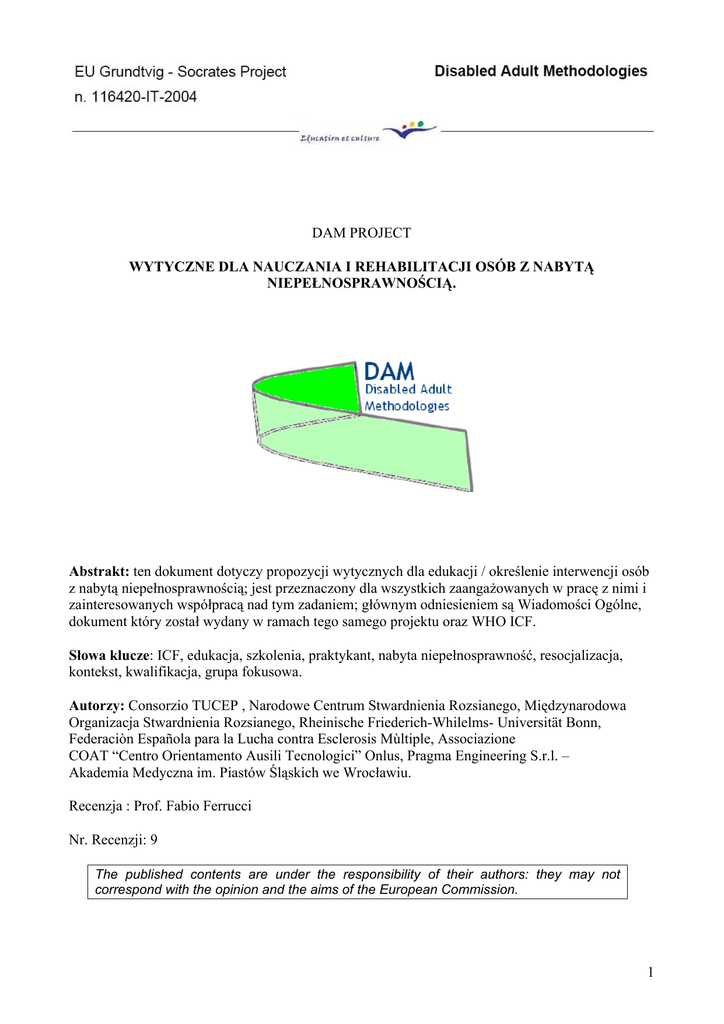 DAM PROJECT WYTYCZNE DLA NAUCZANIA I REHABILITACJI OSÓB Z NABYTĄ NIEPEŁNOSPRAWNOŚCIĄ. Abstrakt: ten dokument dotyczy propozycji wytycznych dla edukacji / określenie interwencji osób z nabytą niepełnosprawnością; jest przeznaczony dla wszystkich zaangażowanych w pracę z nimi i zainteresowanych współpracą nad tym zadaniem; głównym odniesieniem są Wiadomości Ogólne, dokument który został wydany w ramach tego samego projektu oraz WHO ICF. Słowa klucze: ICF, edukacja, szkolenia, praktykant, nabyta niepełnosprawność, resocjalizacja, kontekst, kwalifikacja, grupa fokusowa. Autorzy: Consorzio TUCEP , Narodowe Centrum Stwardnienia Rozsianego, Międzynarodowa Organizacja Stwardnienia Rozsianego, Rheinische Friederich-Whilelms- Universität Bonn, Federaciòn Española para la Lucha contra Esclerosis Mùltiple, Associazione COAT “Centro Orientamento Ausili Tecnologici” Onlus, Pragma Engineering S.r.l. – Akademia Medyczna im. Piastów Śląskich we Wrocławiu. Recenzja : Prof. Fabio Ferrucci Nr. Recenzji: 9 The published contents are under the responsibility of their authors: they may not correspond with the opinion and the aims of the European Commission. 1 Spis treści: 1. 2. 3. 4. 5. 6. 7. 8. Wstęp ………………………………………………………………………………… Cele Wytycznnych …………………………………………………………………... Odbiocy do których skierowane są wytyczne ……………………………..……… Kiedy można używać Wytycznych? …………………………………………………... Podstawowe założenie: odzyskanie tożsamości …………..............................……… Ocena osoby niepełnosprawnej, sytuacji rodzinnej, warunków środowiskowych …... Ocena osoby niepełnosprawnej ............................................................................... Wiedza ......................................................................................................................... Nastawienie ................................................................................................................ Zdolności zawodowe .................................................................................................... .......................................................................................................... Ocena rodziny Wiedza ......................................................................................................................... Nastawienie ................................................................................................................ Ocena kontekstu społecznego .................................................................................. Kontekst publiczny ....................................................................................................... Kontekst pracodawcy .............................................................................................. Kontekst pracowniczy (analiza zadania) ...................................................................... Kontekst Sąsiedztwa .................................................................................................... Kwestionariusz do oceny osoby niepełnosprawnej, jej rodziny i warunków ................ społecznych Trener – doskonały program rehabilitacyjny ................................................................ Wiedza Trenera ............................................................................................................. Nastawienie Trenera ....................................................................................................... Doświadczenie zawodowe trenera ............................................................................... Faza programu treningowego ........................................................................................ Ocena programu treningowego ..................................................................................... Społeczna adekwatność programu ............................................................................ Kontekst społeczny – Wskaźniki widzy ..................................................................... Kontekst społeczny – Wskaźniki Podejścia ............................................................... Kontekst społeczny – Wskaźniki Zachowania ............................................................. Ocena Efektywności Programu ................................................................................. 3 4 4 5 6 9 12 13 14 14 14 14 15 15 15 15 16 16 16 17 17 18 18 19 23 23 23 23 23 25 Wstęp 2 Wytyczne są wynikiem pracy Grundvig Project “DAM” (Disabled Adult Methodologies): zostały tak skonstruowane aby służyć jako narzędzie do rozwijania właściwych programów edukacyjnych i rehabilitacyjnych dla osób z nabytą niepełnosprawnością zakładających przywrócenie tych osób życiu społecznemu lub pracy. Wytyczne powstały w oparciu o następujące materiały: ¾ Treść i odnośniki teoretyczne przedstawione w Background Document, będącym częścią szerszego projektu DAM Project. ¾ Informacje zawarte w badaniach grup studyjnych, z których dwie prowadziły badania w Hiszpanii i dwie we Włoszech; grupy studyjne były skierowane do badania osób niepełnosprawnych, ich rodzin oraz do pracowników zajmujących się rehabilitacją oraz mających nabytą niepełnosprawność. ¾ Wymianę doświadczeń oraz podejść metodologicznych między uczestnikami DAM Project, którymi są: Consorzio TUCEP (Perugia, Włochy) NMSC - Nationaal Multiple Sclerosis Centrum v.z.w. - (Melsbroek, Belgia) IMSO – Internatinal Multiple Sclerosis Organisation – (Melsbroek, Belgia) Rheinische Friederich-Whilelms- Univesität Bonn (Bonn, Niemcy) FELEM – Federaciòn Española para la Lucha contra Esclerosis Mùltiple – (Madrid, Hiszpania) COAT -Associazione COAT “Centro Orientame