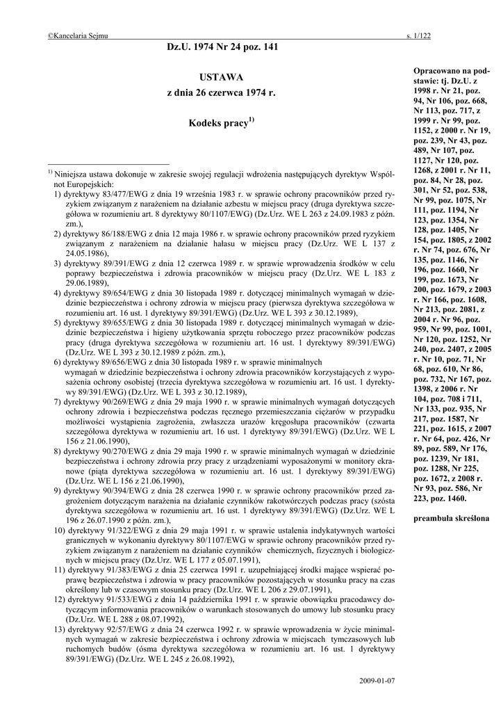 ©Kancelaria Sejmu s. 1/122 Dz.U. 1974 Nr 24 poz. 141 USTAWA z dnia 26 czerwca 1974 r. Kodeks pracy1) 1) Niniejsza ustawa dokonuje w zakresie swojej regulacji wdrożenia następujących dyrektyw Wspólnot Europejskich: 1) dyrektywy 83/477/EWG z dnia 19 września 1983 r. w sprawie ochrony pracowników przed ryzykiem związanym z narażeniem na działanie azbestu w miejscu pracy (druga dyrektywa szczegółowa w rozumieniu art. 8 dyrektywy 80/1107/EWG) (Dz.Urz. WE L 263 z 24.09.1983 z późn. zm.), 2) dyrektywy 86/188/EWG z dnia 12 maja 1986 r. w sprawie ochrony pracowników przed ryzykiem związanym z narażeniem na działanie hałasu w miejscu pracy (Dz.Urz. WE L 137 z 24.05.1986), 3) dyrektywy 89/391/EWG z dnia 12 czerwca 1989 r. w sprawie wprowadzenia środków w celu poprawy bezpieczeństwa i zdrowia pracowników w miejscu pracy (Dz.Urz. WE L 183 z 29.06.1989), 4) dyrektywy 89/654/EWG z dnia 30 listopada 1989 r. dotyczącej minimalnych wymagań w dziedzinie bezpieczeństwa i ochrony zdrowia w miejscu pracy (pierwsza dyrektywa szczegółowa w rozumieniu art. 16 ust. 1 dyrektywy 89/391/EWG) (Dz.Urz. WE L 393 z 30.12.1989), 5) dyrektywy 89/655/EWG z dnia 30 listopada 1989 r. dotyczącej minimalnych wymagań w dziedzinie bezpieczeństwa i higieny użytkowania sprzętu roboczego przez pracowników podczas pracy (druga dyrektywa szczegółowa w rozumieniu art. 16 ust. 1 dyrektywy 89/391/EWG) (Dz.Urz. WE L 393 z 30.12.1989 z późn. zm.), 6) dyrektywy 89/656/EWG z dnia 30 listopada 1989 r. w sprawie minimalnych wymagań w dziedzinie bezpieczeństwa i ochrony zdrowia pracowników korzystających z wyposażenia ochrony osobistej (trzecia dyrektywa szczegółowa w rozumieniu art. 16 ust. 1 dyrektywy 89/391/EWG) (Dz.Urz. WE L 393 z 30.12.1989), 7) dyrektywy 90/269/EWG z dnia 29 maja 1990 r. w sprawie minimalnych wymagań dotyczących ochrony zdrowia i bezpieczeństwa podczas ręcznego przemieszczania ciężarów w przypadku możliwości wystąpienia zagrożenia, zwłaszcza urazów kręgosłupa pracowników (czwarta szczegółowa dyrektywa w rozumieniu art. 16 ust. 1 dyrektywy 89/391/EWG) (Dz.Urz. WE L 156 z 21.06.1990), 8) dyrektywy 90/270/EWG z dnia 29 maja 1990 r. w sprawie minimalnych wymagań w dziedzinie bezpieczeństwa i ochrony zdrowia przy pracy z urządzeniami wyposażonymi w monitory ekranowe (piąta dyrektywa szczegółowa w rozumieniu art. 16 ust. 1 dyrektywy 89/391/EWG) (Dz.Urz. WE L 156 z 21.06.1990), 9) dyrektywy 90/394/EWG z dnia 28 czerwca 1990 r. w sprawie ochrony pracowników przed zagrożeniem dotyczącym narażenia na działanie czynników rakotwórczych podczas pracy (szósta dyrektywa szczegółowa w rozumieniu art. 16 ust. 1 dyrektywy 89/391/EWG) (Dz.Urz. WE L 196 z 26.07.1990 z późn. zm.), 10) dyrektywy 91/322/EWG z dnia 29 maja 1991 r. w sprawie ustalenia indykatywnych wartości granicznych w wykonaniu dyrektywy 80/1107/EWG w sprawie ochrony pracowników przed ryzykiem związanym z narażeniem na działanie czynników chemicznych, fizycznych i biologicznych w miejscu pracy (Dz.Urz. WE L 177 z 05.07.1991), 11) dyrektywy 91/383/EWG z dnia 25 czerwca 1991 r. uzupełniającej środki mające wspierać poprawę bezpieczeństwa i zdrowia w pracy pracowników pozostających w stosunku pracy na czas określony lub w czasowym stosunku pracy (Dz.Urz. WE L 206 z 29.07.1991), 12) dyrektywy 91/533/EWG z dnia 14 października 1991 r. w sprawie obowiązku pracodawcy dotyczącym informowania pracowników o warunkach stosowanych do umowy lub stosunku pracy (Dz.Urz. WE L 288 z 08.07.1992), 13) dyrektywy 92/57/EWG z dnia 24 czerwca 1992 r. w sprawie wprowadzenia w życie minimalnych wymagań w zakresie bezpieczeństwa i ochrony zdrowia w miejscach tymczasowych lub ruchomych budów (ósma dyrektywa szczegółowa w rozumieniu art. 16 ust. 1 dyrektywy 89/391/EWG) (Dz.Urz. WE L 245 z 26.08.1992), 2009-01-07 Opracowano na podstawie: tj. Dz.U. z 1998 r. Nr 21, poz. 94, Nr 106, poz. 668, Nr 113, poz. 717, z 1999 r. Nr 99, poz. 1152, z 2000 r. Nr 19, poz. 239, Nr 43, poz. 489, Nr 107, poz. 1127, Nr 120, poz. 1268, z 2001 r. Nr 11, poz. 84, Nr 28, poz. 301, Nr 52, poz. 538, Nr 99, poz. 1075, Nr 111, poz. 1194, Nr 123, poz. 1354, Nr 128, poz. 1405, Nr 154, poz. 1805, z 2002 r. Nr 74, poz. 676, Nr 135, poz. 1146, Nr 196, poz. 1660, Nr 199, poz. 1673, Nr 200, poz. 1679, z 2003 r. Nr 166, poz. 1608, Nr 213, poz. 2081, z 2004 r. Nr 96, poz. 959, Nr 99, poz. 1001, Nr 120, poz. 1252, Nr 240, poz. 2407, z 2005 r. Nr 10, poz. 71, Nr 68, poz. 610, Nr 86, poz. 732, Nr 167, poz. 1398, z 2006 r. Nr 104, poz. 708 i 711, Nr 133, poz. 935, Nr 217, poz. 1587, Nr 221, poz. 1615, z 2007 r. Nr 64, poz. 426, Nr 89, poz. 589, Nr 176, poz. 1239, Nr 181, poz. 1288, Nr 225, poz. 1672, z 2008 r. Nr 93, poz. 586, Nr 223, poz. 1460. preambuła skreślona ©Kancelaria Sejmu s. 2/122 14) dyrektywy 92/58/EWG z dnia 24 czerwca 1992 r. w sprawie minimalnych wymagań dotyczących znaków bezpieczeństwa i/lub zdrowia w miejscu pracy (dziewiąta dyrektywa szczegółowa w rozumieniu art. 16 ust. 1 dyrektywy 89/391/EWG) (Dz.Urz. WE L 245 z 26.08.1992), 15) dyrektywy 92/85/EWG z dnia 19 października 1992 r. w sprawie wprowadzenia środków służących wspieraniu poprawy w miejscu pracy bezpieczeństwa i zdrowia pracownic w ciąży, pracownic, które niedawno rodziły i pracownic karmiących piersią (dziesiąta dyrektywa szczegółowa w rozumieniu art. 16 ust. 1 dyrektywy 89/391/EWG) (Dz.Urz. WE L 348 z 28.11.1992), 16) dyrektywy 93/104/WE z dnia 23 listopada 1993 r. dotyczącej niektórych aspektów organizacji czasu pracy (Dz.Urz. WE L 307 z 13.12.1993), 17) dyrektywy 94/33/WE z dnia 22 czerwca 1994 r. w sprawie ochrony pracy osób młodych (Dz.Urz. WE L 216 z 20.08.1994), 18) dyrektywy 96/34/WE z dnia 3 czerwca 1996 r. w sprawie Porozumienia ramowego dotyczącego urlopu rodzicielskiego zawartego przez Europejską Unię Konfederacji Przemysłowych i Pracodawców /UNICE/, Europejskie Centrum Przedsiębiorstw Publicznych /CEEP/ ora