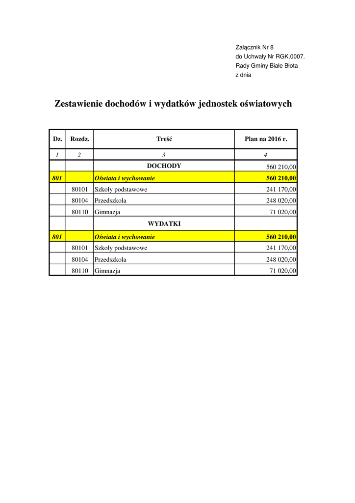 Załącznik Nr 8 do Uchwały Nr RGK.0007. Rady Gminy Białe Błota z dnia Zestawienie dochodów i wydatków jednostek oświatowych Dz. Rozdz. Treść Plan na 2016 r. 1 2 3 4 DOCHODY 801 Oświata i wychowanie 560 210,00 560 210,00 80101 Szkoły podstawowe 241 170,00 80104 Przedszkola 248 020,00 80110 Gimnazja 71 020,00 WYDATKI 801 Oświata i wychowanie 560 210,00 80101 Szkoły podstawowe 241 170,00 80104 Przedszkola 248 020,00 80110 Gimnazja 71 020,00