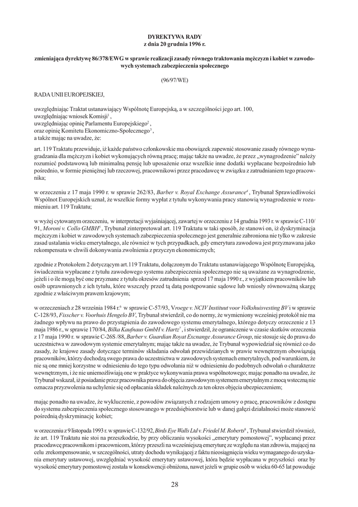 DYREKTYWA RADY z dnia 20 grudnia 1996 r. zmieniaj¹ca dyrektywê 86/378/EWG w sprawie realizacji zasady równego traktowania mê¿czyzn i kobiet w zawodowych systemach zabezpieczenia spo³ecznego (96/97/WE) RADA UNII EUROPEJSKIEJ, uwzglêdniaj¹c Traktat ustanawiaj¹cy Wspólnotê Europejsk¹, a w szczególnoci jego art. 100, uwzglêdniaj¹c wniosek Komisji1 , uwzglêdniaj¹c opiniê Parlamentu Europejskiego2 , oraz opiniê Komitetu Ekonomiczno-Spo³ecznego 3 , a tak¿e maj¹c na uwadze, ¿e: art. 119 Traktatu przewiduje, i¿ ka¿de pañstwo cz³onkowskie ma obowi¹zek zapewniæ stosowanie zasady równego wynagradzania dla mê¿czyzn i kobiet wykonuj¹cych równ¹ pracê; maj¹c tak¿e na uwadze, ¿e przez wynagrodzenie nale¿y rozumieæ podstawow¹ lub minimaln¹ pensjê lub uposa¿enie oraz wszelkie inne dodatki wyp³acane bezporednio lub porednio, w formie pieniê¿nej lub rzeczowej, pracownikowi przez pracodawcê w zwi¹zku z zatrudnianiem tego pracownika; w orzeczeniu z 17 maja 1990 r. w sprawie 262/83, Barber v. Royal Exchange Assurance4 , Trybuna³ Sprawiedliwoci Wspólnot Europejskich uzna³, ¿e wszelkie formy wyp³at z tytu³u wykonywania pracy stanowi¹ wynagrodzenie w rozumieniu art. 119 Traktatu; w wy¿ej cytowanym orzeczeniu, w interpretacji wyjaniaj¹cej, zawartej w orzeczeniu z 14 grudnia 1993 r. w sprawie C-110/ 91, Moroni v. Collo GMBH5 , Trybuna³ zinterpretowa³ art. 119 Traktatu w taki sposób, ¿e stanowi on, i¿ dyskryminacja mê¿czyzn i kobiet w zawodowych systemach zabezpieczenia spo³ecznego jest generalnie zabroniona nie tylko w zakresie zasad ustalania wieku emerytalnego, ale równie¿ w tych przypadkach, gdy emerytura zawodowa jest przyznawana jako rekompensata w chwili dokonywania zwolnienia z przyczyn ekonomicznych; zgodnie z Protoko³em 2 dotycz¹cym art.119 Traktatu, do³¹czonym do Traktatu ustanawiaj¹cego Wspólnotê Europejsk¹, wiadczenia wyp³acane z tytu³u zawodowego systemu zabezpieczenia spo³ecznego nie s¹ uwa¿ane za wynagrodzenie, je¿eli i o ile mog¹ byæ one przyznane z tytu³u okresów zatrudnienia sprzed 17 maja 1990 r., z wyj¹tkiem pracowników lub osób uprawnionych z ich tytu³u, które wszczê³y przed t¹ dat¹ postêpowanie s¹dowe lub wnios³y równowa¿n¹ skargê zgodnie z w³aciwym prawem krajowym; w orzeczeniach z 28 wrzenia 1984 r.6 w sprawie C-57/93, Vroege v. NCIV Instituut voor Volkshuisvesting BV i w sprawie C-128/93, Fisscher v. Voorhuis Hengelo BV, Trybuna³ stwierdzi³, co do normy, ¿e wymieniony wczeniej protokó³ nie ma ¿adnego wp³ywu na prawo do przyst¹pienia do zawodowego systemu emerytalnego, którego dotyczy orzeczenie z 13 maja 1986 r., w sprawie 170/84, Bilka Kaufnaus GmbH v. Hartz7 , i stwierdzi³, ¿e ograniczenie w czasie skutków orzeczenia z 17 maja 1990 r. w sprawie C-26S /88, Barber v. Guardian Royat Excnange Assurance Group, nie stosuje siê do prawa do uczestnictwa w zawodowym systemie emerytalnym; maj¹c tak¿e na uwadze, ¿e Trybuna³ wypowiedzia³ siê równie¿ co do zasady, ¿e krajowe zasady dotycz¹ce terminów sk³adania odwo³añ przewidzianych w prawie wewnêtrznym obowi¹zuj¹ pracowników, którzy dochodz¹ swego prawa do uczestnictwa w zawodowych systemach emerytalnych, pod warunkiem, ¿e nie s¹ one mniej korzystne w odniesieniu do tego typu odwo³ania ni¿ w odniesieniu do podobnych odwo³añ o charakterze wewnêtrznym, i ¿e nie uniemo¿liwiaj¹ one w praktyce wykonywania prawa wspólnotowego; maj¹c ponadto na uwadze, ¿e Trybuna³ wskaza³, i¿ posiadanie przez pracownika prawa do objêcia zawodowym systemem emerytalnym z moc¹ wsteczn¹ nie oznacza przyzwolenia na uchylenie siê od op³acania sk³adek nale¿nych za ten okres objêcia ubezpieczeniem; maj¹c ponadto na uwadze, ¿e wykluczenie, z powodów zwi¹zanych z rodzajem umowy o pracê, pracowników z dostêpu do systemu zabezpieczenia spo³ecznego stosowanego w przedsiêbiorstwie lub w danej ga³êzi dzia³alnoci mo¿e stanowiæ poredni¹ dyskryminacjê kobiet; w orzeczeniu z 9 listopada 1993 r. w sprawie C-132/92, Birds Eye Walls Ltd v. Friedel M. Roberts8 , Trybuna³ stwierdzi³ równie¿, ¿e art. 119 Traktatu nie stoi na przeszkodzie, by przy obliczaniu wysokoci emerytury pomostowej, wyp³acanej przez pracodawcê pracownikom i pracownicom, którzy przeszli na wczeniejsz¹ emeryturê ze wzglêdu na stan zdrowia, maj¹cej na celu zrekompensowanie, w szczególnoci, utraty dochodu wynikaj¹cej z faktu nieosi¹gniêcia wieku wymaganego do uzyskania emerytury ustawowej, uwzglêdniaæ wysokoæ emerytury ustawowej, która bêdzie wyp³acana w przysz³oci oraz by wysokoæ emerytury pomostowej zosta³a w konsekwencji obni¿ona, nawet je¿eli w grupie osób w wieku 60-65 lat powoduje 28 to, ¿e by³a pracownica najemna otrzymuje emeryturê pomostow¹ ni¿sz¹ ni¿ ta, któr¹ otrzymuje mê¿czyzna spe³niaj¹cy te same warunki co ona, przy czym ró¿nica ta równa jest wysokoci emerytury ustawowej, o której przyznanie kobieta mog³aby wyst¹piæ po ukoñczeniu 60 r. ¿ycia z powodu wype³nienia okresu zatrudnienia u tego pracodawcy; w orzeczeniu z 6 padziernika 1993 r. w sprawie C-109/91, Ter Oever v. Stichting Bedrijfpensioenfonds voor het Glazenwassers en Schoonmaakbedrijf9 oraz w orzeczeniach z 14 grudnia 19S3 r. w sprawie C-110/91, Moroni, z 22 grudnia 1993 r., w sprawie C-125/91, Neath v. Hugh Steeper Ltd10 , i z 28 wrzenia 1394 r. w sprawie C-200/91, Coloroll Pension Trustees Limited v. Russell i inni11 , Trybuna³ potwierdzi³, ¿e na mocy orzeczenia z 17 maja 1990 r. w sprawie C-262/88, Barber v. Guardian Royal Exchange Assurance Group, zasada bezporedniej skutecznoci art. 119 Traktatu mo¿e byæ powo³ywana w celu wymuszenia przestrzegania zasady równego traktowania w sprawach emerytur zawodowych tylko w odniesieniu do wiadczeñ nale¿nych z tytu³u okresów zatrudnienia wype³nionych po 17 maja 1990 r., z wyj¹tkiem pracowników lub osób dochodz¹cych roszczeñ na ich podstawie, które wszczê³y przed t¹ dat¹ po