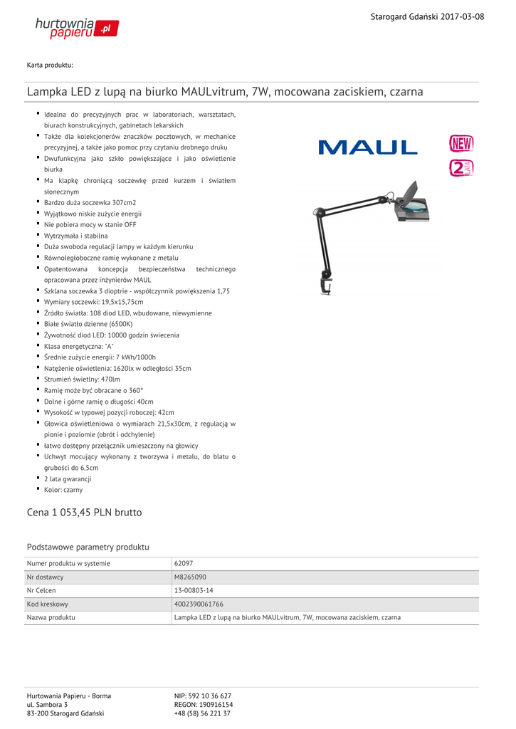 Starogard Gdański 2017-03-08 Karta produktu: Lampka LED z lupą na biurko MAULvitrum, 7W, mocowana zaciskiem, czarna Idealna do precyzyjnych prac w laboratoriach, warsztatach, biurach konstrukcyjnych, gabinetach lekarskich Także dla kolekcjonerów znaczków pocztowych, w mechanice precyzyjnej, a także jako pomoc przy czytaniu drobnego druku Dwufunkcyjna jako szkło powiększające i jako oświetlenie biurka Ma klapkę chroniącą soczewkę przed kurzem i światłem słonecznym Bardzo duża soczewka 307cm2 Wyjątkowo niskie zużycie energii Nie pobiera mocy w stanie OFF Wytrzymała i stabilna Duża swoboda regulacji lampy w każdym kierunku Równoległoboczne ramię wykonane z metalu Opatentowana koncepcja bezpieczeństwa technicznego opracowana przez inżynierów MAUL Szklana soczewka 3 dioptrie - współczynnik powiększenia 1,75 Wymiary soczewki: 19,5x15,75cm Źródło światła: 108 diod LED, wbudowane, niewymienne Białe światło dzienne (6500K) Żywotność diod LED: 10000 godzin świecenia Klasa energetyczna: "A" Średnie zużycie energii: 7 kWh/1000h Natężenie oświetlenia: 1620lx w odległości 35cm Strumień świetlny: 470lm Ramię może być obracane o 360° Dolne i górne ramię o długości 40cm Wysokość w typowej pozycji roboczej: 42cm Głowica oświetleniowa o wymiarach 21,5x30cm, z regulacją w pionie i poziomie (obrót i odchylenie) łatwo dostępny przełącznik umieszczony na głowicy Uchwyt mocujący wykonany z tworzywa i metalu, do blatu o grubości do 6,5cm 2 lata gwarancji Kolor: czarny Cena 1 053,45 PLN brutto Podstawowe parametry produktu Numer produktu w systemie 62097 Nr dostawcy M8265090 Nr Celcen 13-00803-14 Kod kreskowy 4002390061766 Nazwa produktu Lampka LED z lupą na biurko MAULvitrum, 7W, mocowana zaciskiem, czarna Hurtowania Papieru - Borma ul. Sambora 3 83-200 Starogard Gdański NIP: 592 10 36 627 REGON: 190916154 +48 (58) 56 221 37 Starogard Gdański 2017-03-08 Karta katalogowa produktu cd. Lampka LED z lupą na biurko MAULvitrum, 7W, mocowana zaciskiem, czarna Opis Idealna do precyzyjnych prac w laboratoriach, warsztatach, biurach konstrukcyjnych, gabinetach lekarskich; także dla kolekcjonerów znaczków pocztowych, w mechanice precyzyjnej, a także jako pomoc przy czytaniu drobnego druku; dwufunkcyjna jako szkło powiększające i jako oświetlenie biurka; ma klapkę chroniącą soczewkę przed kurzem i światłem słonecznym; bardzo duża soczewka 307cm2; wyjątkowo niskie zużycie energii; nie pobiera mocy w stanie OFF; wytrzymała i stabilna; duża swoboda regulacji lampy w każdym kierunku; równoległoboczne ramię wykonane z metalu; opatentowana koncepcja bezpieczeństwa technicznego opracowana przez inżynierów MAUL; szklana soczewka 3 dioptrie - współczynnik powiększenia 1,75; wymiary soczewki: 19,5x15,75cm; źródło światła: 108 diod LED, wbudowane, niewymienne; białe światło dzienne (6500K); żywotność diod LED: 10000 godzin świecenia; klasa energetyczna: "A"; średnie zużycie energii: 7 kWh/1000h; natężenie oświetlenia: 1620lx w odległości 35cm; strumień świetlny: 470lm; ramię może być obracane o 360°; dolne i górne ramię o długości 40cm; wysokość w typowej pozycji roboczej: 42cm; głowica oświetleniowa o wymiarach 21,5x30cm, z regulacją w pionie i poziomie (obrót i odchylenie); łatwo dostępny przełącznik umieszczony na głowicy; uchwyt mocujący wykonany z tworzywa i metalu, do blatu o grubości do 6,5cm; 2 lata gwarancji; kolor: czarny Kategoria Lampki Klasa Premium Marka MAUL Cecha Natężenie światła LUMEN 470 Natężenie światła LUX 1620 Cykl życia (h) 10 000 W ofercie od 2016-10 Klasa energetyczna A Rodzaj 7W Typ LED Produkt Lampka mocowana do blatu Materiał Metal/plastik Wymiary Wysokość (mm) 420 Wspólny słownik zamówień CPV 31521100-5 Certyfikaty Ilość lat gwarancji 2 Hit Standard Hurtowania Papieru - Borma ul. Sambora 3 83-200 Starogard Gdański NIP: 592 10 36 627 REGON: 190916154 +48 (58) 56 221 37 Starogard Gdański 2017-03-08 Karta katalogowa produktu cd. Lampka LED z lupą na biurko MAULvitrum, 7W, mocowana zaciskiem, czarna Nowy produkt w ofercie Nowość Kolor Kolor Czarny Pozostałe zdjęcia produktu Serdecznie zapraszamy do współpracy Hurtowania Papieru - Borma zespół. Hurtowania Papieru - Borma ul. Sambora 3 83-200 Starogard Gdański NIP: 592 10 36 627 REGON: 190916154 +48 (58) 56 221 37