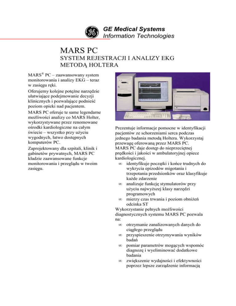 GE Medical Systems Information Technologies MARS PC SYSTEM REJESTRACJI I ANALIZY EKG METODĄ HOLTERA MARS® PC – zaawansowany system monitorowania i analizy EKG – teraz w zasięgu ręki. Oferujemy kolejne potęŜne narzędzie ułatwiające podejmowanie decyzji klinicznych i pozwalające podnieść poziom opieki nad pacjentem. MARS PC oferuje te same legendarne moŜliwości analizy co MARS Holter, wykorzystywane przez renomowane ośrodki kardiologiczne na całym świecie – wszystko przy uŜyciu wygodnych, łatwo dostępnych komputerów PC. Zaprojektowany dla szpitali, klinik i gabinetów prywatnych, MARS PC kładzie zaawansowane funkcje monitorowania i przeglądu w twoim zasięgu. Prezentuje informacje pomocne w identyfikacji pacjentów ze schorzeniami serca podczas jednego badania metodą Holtera. Wykorzystaj przewagę oferowaną przez MARS PC. MARS PC daje dostęp do nieprzeciętnej prędkości i jakości w ambulatoryjnej opiece kardiologicznej. • identyfikuje początki i końce trudnych do wykrycia epizodów migotania i trzepotania przedsionków oraz klasyfikuje kaŜde zdarzenie • analizuje funkcję stymulatorów przy uŜyciu najwyŜszej klasy narzędzi programowych • mierzy czas trwania i poziom obniŜeń odcinka ST Wykorzystanie pełnych moŜliwości diagnostycznych systemu MARS PC pozwala na: • otrzymanie zanalizowanych danych do ciągłego przeglądu • przyspieszenie otrzymywania wyników badań • pomiar parametrów mogących wspomóc diagnozę i wyeliminować dodatkowe badania • zwiększenie wydajności i efektywności poprzez lepsze zarządzenie informacją