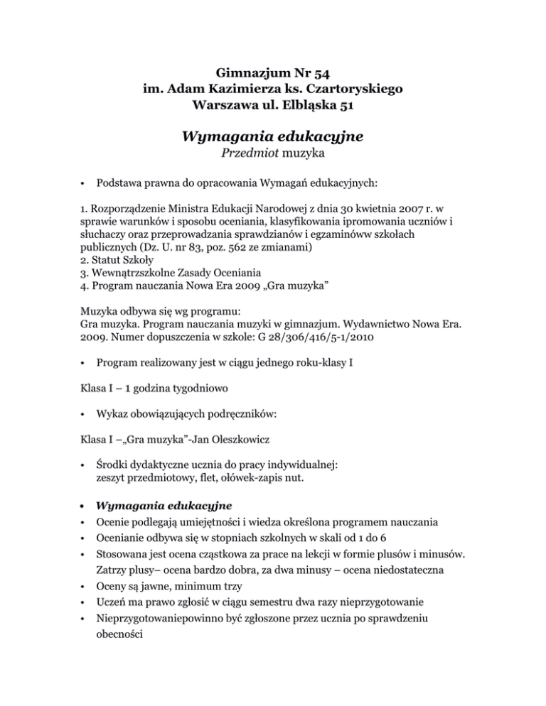 Gimnazjum Nr 54 im. Adam Kazimierza ks. Czartoryskiego Warszawa ul. Elbląska 51 Wymagania edukacyjne Przedmiot muzyka • Podstawa prawna do opracowania Wymagań edukacyjnych: 1. Rozporządzenie Ministra Edukacji Narodowej z dnia 30 kwietnia 2007 r. w sprawie warunków i sposobu oceniania, klasyfikowania ipromowania uczniów i słuchaczy oraz przeprowadzania sprawdzianów i egzaminóww szkołach publicznych (Dz. U. nr 83, poz. 562 ze zmianami) 2. Statut Szkoły 3. Wewnątrzszkolne Zasady Oceniania 4. Program nauczania Nowa Era 2009 „Gra muzyka” Muzyka odbywa się wg programu: Gra muzyka. Program nauczania muzyki w gimnazjum. Wydawnictwo Nowa Era. 2009. Numer dopuszczenia w szkole: G 28/306/416/5-1/2010 • Program realizowany jest w ciągu jednego roku-klasy I Klasa I – 1 godzina tygodniowo • Wykaz obowiązujących podręczników: Klasa I –„Gra muzyka”-Jan Oleszkowicz • Środki dydaktyczne ucznia do pracy indywidualnej: zeszyt przedmiotowy, flet, ołówek-zapis nut. • • • • Wymagania edukacyjne Ocenie podlegają umiejętności i wiedza określona programem nauczania Ocenianie odbywa się w stopniach szkolnych w skali od 1 do 6 Stosowana jest ocena cząstkowa za prace na lekcji w formie plusów i minusów. Zatrzy plusy– ocena bardzo dobra, za dwa minusy – ocena niedostateczna Oceny są jawne, minimum trzy Uczeń ma prawo zgłosić w ciągu semestru dwa razy nieprzygotowanie Nieprzygotowaniepowinno być zgłoszone przez ucznia po sprawdzeniu obecności • • • • • • • • • • • Uczeń ma obowiązek zaliczenia zapowiedzianych sprawdzianów wiadomości naocenę pozytywną. W przypadku nieobecności ucznia, ma on obowiązek zaliczyćmateriał z zasad muzyki lub historii muzyki a także wybranego utworu wokalnego czy gry na flecie prostym w ciągu dwóchtygodni od terminu jego przeprowadzenia, ew. w ciągu tygodnia od powrotu do szkoły Formy kontroli bieżącej tj.: kartkówki, odpowiedzi ustne, prace domowe nie podlegają poprawie.Każdy uczeń ma prawo do otrzymania dodatkowych ocen, które może uzyskać, biorącudział w konkursach, wykonując i przygotowując dodatkowe zadanie, opracowującreferaty na temat określony przez nauczyciela lub tworząc własny projekt pracy (pouzgodnieniu z nauczycielem) Ocena środroczna jest wystawiana na podstawie wszystkich ocen cząstkowych obejmujących prace ucznia w całym półroczu. Nie jest jednak średnią arytmetyczną tych ocen. W przypadku uzyskania oceny niedostatecznej na I półrocze uczeń jest zobowiązany zaliczyć materiał z I półrocza na ocenę dopuszczającą w terminie ustalonym z nauczycielem. Wskazówki dotyczące minimum obowiązującego do zaliczenia materiału są przekazywane uczniowi przez nauczyciela pisemnie. Zaliczenie materiału odbywa się ustnie. W przypadku zagrożenia otrzymaniem oceny niedostatecznej na II półrocze uczeń jest zobowiązany zaliczyć materiał z II półrocza na ocenę dopuszczającą w ustalonym terminie ,przed Radą Klasyfikacyjną . Wskazówki dotyczące minimum obowiązującego do zaliczenia materiału przekazywane są uczniowi przez nauczyciela pisemnie. Jest to egzamin praktyczny. W przypadku uzyskania oceny niedostatecznej na I półrocze i nie zaliczenie w wyżej wymieniony sposób materiału z tego półrocza oraz uzyskanie oceny niedostatecznej w II półroczu, powoduje uzyskanie oceny niedostatecznej na koniec roku szkolnego. Uczniowie z dysfunkcjami oceniani są wg odrębnych zasad zalecanych przez PPP Pomiar osiągnięć uczniów odbywa się za pomocą następujących narzędzi: • Wypowiedzi ustne (3 ostatnie tematy, utwór obowiązkowy-tydzien po przedstawieniu; utwór dowolny-dwa tygodnie po poznaniu uwzględnione zostaną pewne okoliczności: uroczystości i konkursy-wtedy termin może ulec zmianie • • • • • • Dyskusje(burza mózgów) Aktywność na lekcji (system plusów, minusów) Zadania domowe Praca pozalekcyjna Prowadzenie zeszytu przedmiotowego/uczeń ma obowiązek prowadzić zeszyt przedmiotowy, w którym powinny znajdować się zapisy: notatki, zapisy poleceń ustnych lub pisemnych prac domowych, zeszyt powinien być prowadzony systematycznie, w przypadku nieobecności ucznia w szkole, powinien go uzupełnić Kartkówki z 3 ostatnich tematów • Kryteria oceny przy realizacji konkretnych zadań: 1. Umiejętności pracy w grupie: a) Podział zadań: -członkowie zespołu równomiernie dzielą się pracą, -każdy uczeń, choćby w minimalnym stopniu, uczestniczy w realizacji zadania wykonywanego przez drużynę b) Podejmowanie decyzji: -każda osoba ma prawo głosu -opinie wszystkich członków grupy są równoprawne i uwzględniane w podejmowaniu decyzji końcowej -mało aktywni uczniowie są zachęcani do wypowiedzi przez pozostałe osoby c) Stopień zgodnego współdziałania w grupie: -umiejętność skutecznego rozwiązywania konfliktów -wzajemne wysłuchiwanie swoich argumentów przez osoby z danej drużyny, -zachowywanie podstawowych zasad kultury, nawet w czasie sporów. d) Postawa podczas pracy: -grupa jest skupiona na zadaniu, które ma wykonać -wszyscy uczniowie należący do zespołu są zaangażowani w osiągnięcie wspólnego celu -osoby wchodzące w skład drużyny dbają o dobrą jakość rezultatów pracy 3. Praca ucznia na lekcji: a) Sprawdzanie przygotowania do lekcji, uczeń powinien posiadać podręcznik, zeszyt przedmiotowy b) Udział w lekcji: częstotliwości zgłaszania się do odpowiedzi na zadane przez nauczyciela pytania lub w wypadku wykonywania zadania pisemnego c) Stosunek ucznia do poruszanej tematyki (w ogóle nie interesuje się tematem, biernie uczestniczy tylko na wyraźne polecenie nauczyciela, aktywnie uczestniczy – sam, nie będąc zachęcany przez nauczyciela, wykazuje inicjatywę – zadaje pytania, zabiera głos, dyskutuje) d) Wykazywania się ponadprogramową wiedzą i dociekliwością (np. przynoszenie na lekcje materiałów pomocniczych) 4. Wypowiedzi ustne: a) Ocen