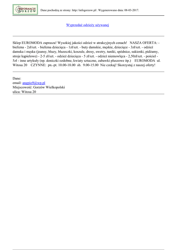 Dane pochodzą ze strony: http://infogorzow.pl/. Wygenerowano dnia: 08-03-2017. Wyprzedaż odzieży używanej Sklep EUROMODA zaprasza! Wysokiej jakości odzież w atrakcyjnych cenach! NASZA OFERTA: bielizna - 2zł/szt. - bielizna dziecięca - 1zł/szt. - buty damskie, męskie, dziecięce - 3zł/szt. - odzież damska i męska (jeansy, bluzy, bluzeczki, koszule, dresy, swetry, tuniki, spódnice, sukienki, pidżamy, stroje kąpielowe) - 2-5 zł/szt. - odzież dziecięca - 5 zł/szt. - odzież niemowlęca - 2,50zł/szt. - pościel 5zł - inne artykuły (np. doniczki ozdobne, kwiaty sztuczne, zabawki pluszowe itp.) EUROMODA ul. Witosa 20 CZYNNE: pn.-pt. 10.00-18.00 sb. 9.00-15.00 Nie czekaj! Skorzystaj z naszej oferty! Dane: email: [email protected] Miejscowość: Gorzów Wielkopolski ulica: Witosa 20