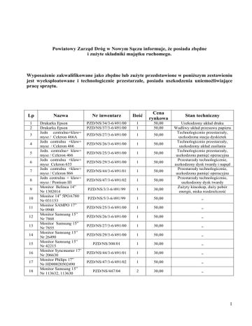 Powiatowy Zarz¹d Dróg w Nowym S¹czu informuje, ¿e posiada zbêdne i zu¿yte skùadniki maj¹tku ruchomego. Wyposa¿enie zakwalifikowane jako zbêdne lub zu¿yte przedstawione w poni¿szym zestawieniu jest wyeksploatowane i technologicznie przestarzaùe, posiada uszkodzenia uniemo¿liwiaj¹ce pracê sprzêtu. Lp Nazwa Nr inwentarz Iloœã Cena rynkowa 1 2 Drukarka Epson Drukarka Epson Jedn centralna+klaw+ mysz / Celeron 466A Jedn centralna +klaw+ mysz / Celeron 466 Jedn. centralna+ klaw+ mysz / Celeron 466 Jedn centralna +klaw+ mysz Celeron 633 Jedn centralna +klaw+ mysz / Celeron 866 Jedn centralna + klaw+ mysz / Pentium III Monitor Belinea 14” Nr 1302014 Monitor 14” 5POA780 Nr 031153 Monitor SAMPO 17” Nr 0940 Monitor Samsung 15” Nr 7868 Monitor Samsung 15” Nr 7855 Monitor Samsung 15” Nr 26490 Monitor Samsung 15” Nr 42215 Monitor Syncmaster 17’ Nr 206630 Monitor Philips 17” Nr HD00020502490 Monitor Samsung 15” Nr 113632, 113630 PZD/NS/34/3-6/491/00 PZD/NS/37/3-6/491/00 1 1 50,00 50,00 PZD/NS/27/3-6/491/00 1 50,00 PZD/NS/26/3-6/491/00 1 50,00 PZD/NS/25/3-6/491/00 1 50,00 PZD/NS/29/3-6/491/00 1 50,00 PZD/NS/44/3-6/491/01 1 50,00 PZD/NS/47/3-6/491/02 1 50,00 PZD/NS/3/3-6/491/99 1 30,00 PZD/NS/5/3-6/491/99 1 50,00 „ PZD/NS/25/3-6/491/00 1 50,00 „ PZD/NS/26/3-6/491/00 1 50,00 „ PZD/NS/27/3-6/491/00 1 30,00 „ PZD/NS/29/3-6/491/00 1 50,00 „ PZD/NS/308/01 1 30,00 „ PZD/NS/44/3-6/491/01 1 30,00 „ PZD/NS/47/3-6/491/02 1 50,00 „ PZD/NS/447/04 2 30,00 „ 3 4 5 6 7 8 9 10 11 12 13 14 15 16 17 18 Stan techniczny Uszkodzony ukùad druku Wadliwy ukùad przesuwu papieru Technologicznie przestarzaùy, uszkodzona stacja dyskietek Technologicznie przestarzaùy, uszkodzony ukùad zasilania Technologicznie przestarzaùy, uszkodzona pamiêã operacyjna Przestarzaùy technologicznie, uszkodzony dysk twardy i napêd Przestarzaùy technologicznie, uszkodzona pamiêã operacyjna Przestarzaùy technologicznie, uszkodzony dysk twardy Zu¿yty kineskop, du¿y pobór energii, niska rozdzielczoœã 1 Stosownie do Rozporz¹dzenia Rady Ministrów z dnia 11 sierpnia 2004 r. w sprawie sposobu i trybu gospodarowania skùadnikami maj¹tku ruchomego powierzonego jednostkom bud¿etowym, zakùadom bud¿etowym i gospodarstwom pomocniczym (Dz. U. Nr 191, poz. 1957): 1. Jednostki bud¿etowe, zakùady bud¿etowe i gospodarstwa pomocnicze zainteresowane otrzymaniem skùadników maj¹tku ruchomego w formie nieodpùatnego przekazania, mog¹ skùadaã pisemne wnioski zawieraj¹ce: a/ nazwê, siedzibê adres jednostki. b/ informacjê o zadaniach publicznych realizowanych przez jednostkê. c/ wskazanie skùadnika maj¹tku ruchomego, o który wystêpuje jednostka. d/ uzasadnienie potrzeb i sposobu wykorzystania skùadnika maj¹tku ruchomego. 2. Jednostki organizacyjne lub osoby fizyczne zainteresowane nabyciem poszczególnych skùadników maj¹tku ruchomego mog¹ skùadaã pisemne oferty zawieraj¹ce: a/ dane oferenta – w przypadku osób fizycznych (nazwisko, imiê dokùadny adres zamieszkania) natomiast w przypadku pozostaùych osób i jednostek - nazwê, adres i siedzibê. b/ wykaz skùadników maj¹tku ruchomego objêtych ofert¹. c/ ceny za poszczególne skùadniki maj¹tku ruchomego. 3. Jednostki wymienione w § 39 ust. 1 ww. Rozporz¹dzenia zainteresowane nabyciem w formie darowizny skùadników maj¹tku ruchomego, mog¹ skùadaã pisemne wnioski zawieraj¹ce: a/ nazwê, siedzibê i adres jednostki. b/ statut. c/ informacjê o zadaniach publicznych realizowanych przez jednostkê. d/ wskazanie skùadnika maj¹tku ruchomego, o który wystêpuje jednostka z uzasadnieniem potrzeb i sposobu wykorzystania skùadnika maj¹tku ruchomego. Wnioski lub oferty, o których mowa wy¿ej nale¿y skùadaã do dnia 14.08.2009 r. do godz. 12.00 do siedziby Powiatowego Zarz¹du Dróg w Nowym S¹czu ul. Wiœniowieckiego 136, 33-300 Nowy S¹cz Szczegóùowych informacji dotycz¹cych stanu technicznego wyszczególnionych powy¿ej skùadników maj¹tku ruchomego udzieli Anna Leœniak tel. (018) 448 40 65 2