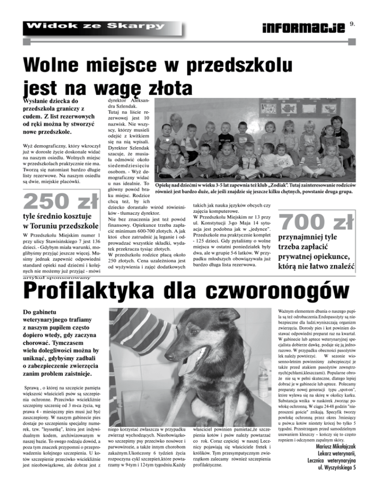 Widok ze Skarpy informacje 9. Wolne miejsce w przedszkolu jest na wagę złota Wysłanie dziecka do przedszkola graniczy z cudem. Z list rezerwowych od ręki można by stworzyć nowe przedszkole. Wyż demograficzny, który wkroczył już w dorosłe życie doskonale widać na naszym osiedlu. Wolnych miejsc w przedszkolach praktycznie nie ma. Tworzą się natomiast bardzo długie listy rezerwowe. Na naszym osiedlu są dwie, miejskie placówki. 250 zł tyle średnio kosztuje w Toruniu przedszkole W Przedszkolu Miejskim numer 1 przy ulicy Stawisińskiego 7 jest 136 dzieci. - Gdybym miała warunki, moglibyśmy przyjąć jeszcze więcej. Musimy jednak zapewnić odpowiedni standard opieki nad dziećmi i kolejnych nie możemy już przyjąć - mówi dyrektor Aleksandra Szlendak. Tutaj na liście rezerwowej jest 10 nazwisk. Nie wszyscy, którzy musieli odejść z kwitkiem się na nią wpisali. Dyrektor Szlendak szacuje, że musiała odmówić około siedemdziesięciu osobom. - Wyż demograficzny widać u nas idealnie. To Opiekę nad dziećmi w wieku 3-5 lat zapewnia też klub „Zodiak”. Tutaj zainteresowanie rodziców główny powód bra- również jest bardzo duże, ale jeśli znajdzie się jeszcze kilku chętnych, powstanie druga grupa. ku miejsc. Rodzice chcą też, by ich dziecko dorastało wśród rówieśni- takich jak nauka języków obcych czy zajęcia komputerowe. ków - tłumaczy dyrektor. Nie bez znaczenia jest też powód W Przedszkolu Miejskim nr 13 przy finansowy. Opiekunce trzeba zapła- ul. Konstytucji 3-go Maja 14 sytucić minimum 600-700 złotych. A jak acja jest podobna jak w „jedynce”. ktoś chce zatrudnić ją leganie i od- Przedszkole ma praktycznie komplet prowadzać wszystkie składki, wyda- - 125 dzieci. Gdy pytaliśmy o wolne miejsca w ostatni poniedziałek były tek przekracza tysiąc złotych. W przedszkolu rodzice płacą około dwa, ale w grupie 5-6 latków. W przy250 złotych. Cena uzależniona jest padku młodszych obowiązywała już od wyżywienia i zajęć dodatkowych bardzo długa lista rezerwowa. 700 zł przynajmniej tyle trzeba zapłacić prywatnej opiekunce, którą nie łatwo znaleźć artykuł sponsorowany Profilaktyka dla czworonogów Do gabinetu weterynaryjnego trafiamy z naszym pupilem często dopiero wtedy, gdy zaczyna chorować. Tymczasem wielu dolegliwości można by uniknąć, gdybyśmy zadbali o zabezpieczenie zwierzęcia zanim problem zaistnieje. Sprawą , o której na szczęście pamięta większość właścicieli psów są szczepienia ochronne. Przeciwko wściekliźnie szczepimy szczenię od 3 m-ca życia, wg prawa 4 - miesięczny pies musi już być zaszczepiony. W naszym gabinecie pies dostaje po szczepieniu specjalny numerek, tzw. "leyssetkę”, która jest indywidualnym kodem, archiwizowanym w naszej bazie. To swego rodzaju dowód, a poza tym znaczek przypomni o przeprowadzeniu kolejnego szczepienia. U kotów szczepienie przeciwko wściekliźnie jest nieobowiązkowe, ale dobrze jest z niego korzystać zwłaszcza w przypadku zwierząt wychodzących. Nieobowiązkowo szczepimy psy przeciwko nosówce i parwowirozie, a także innym chorobom zakaźnym.Ukończony 6 tydzień życia rozpoczyna cykl szczepień,które powtarzamy w 9-tym i 12-tym tygodniu.Każdy właściciel powinien pamietać,że szczepienia kotów i psów należy powtarzać co rok. Coraz częściej w naszej Lecznicy pojawiają się właściciele fretek i królików. Tym przesympatycznym zwierzątkom zalecamy również szczepienia profilaktyczne. Ważnym elementem dbania o naszego pupila są też odrobaczenia.Endopasożyty są niebezpieczne dla ludzi,wyniszczają organizm zwierzęcia. Dorosły pies i kot powinien dostawać odpowiedni preparat raz na kwartał. W gabinecie lub aptece weterynaryjnej specjalista dobierze dawkę, podaje się ją jednorazowo. W przypadku obecności pasożytów lek należy powtórzyć. W sezonie wiosenno-letnim powinniśmy zabezpieczyć je także przed atakiem pasożytów zewnętrznych(pchłami,kleszczami). Popularne obroże nie są w pełni skuteczne, dlatego lepiej dobrać je w gabinecie lub aptece. Polecamy preparaty nowej generacji typu „spot-on”, które wylewa się na skórę w okolicy karku. Substancja wnika w naskórek ,tworząc powłokę ochronną. W ciągu 24-48 godzin "nieproszeni goście" znikają. Specyfik tworzy powłokę ochronną przez okres 3miesięcy u psów,u kotów niestety krócej bo tylko 5 tygodni. Przestrzegam przed samodzielnym usuwaniem kleszczy – kończy się to często ropniem i odczynem zapalnym skóry. Mariusz Mikołajczak Lekarz weterynarii, Lecznica weterynaryjna ul. Wyszyńskiego 5