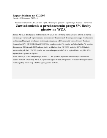 Raport bieŜący nr 47/2007 (środa, 28 listopada 2007 r.) Podstawa prawna : Art. 56 ust. 1 pkt 2 Ustawy o ofercie – informacje bieŜące i okresowe Zawiadomienie o przekroczeniu progu 5% liczby głosów na WZA Zarząd AB S.A. działając na podstawie art. 69 ust. 1 pkt 1 Ustawy z dnia 29 lipca 2005 r. o ofercie publicznej i warunkach wprowadzania instrumentów finansowych do zorganizowanego obrotu oraz o spółkach publicznych, przekazuje informację otrzymaną od Commercial Union Otwarty Fundusz Emerytalny BPH CU WBK (dalej CU OFE) o przekroczeniu 5% głosów na WZA Spółki. W wyniku dokonanego 20 listopada 2007 zakupu akcji, w skład portfela CU OFE wchodzi 1.278.590 akcji, uprawniających do 1.278.590 głosów, co stanowi odpowiednio 7,41% ogólnej ilości akcji i 8,02% ogólnej ilości głosów w Spółce. Przed zmianą w skład zarządzanego przez CU OFE portfela papierów wartościowych wchodziło łącznie 518.590 sztuk akcji AB S.A., uprawniających do 518.590 głosów, co stanowiło odpowiednio 3,25% ogólnej ilości akcji i 3,00% ogółu głosów na WZA.