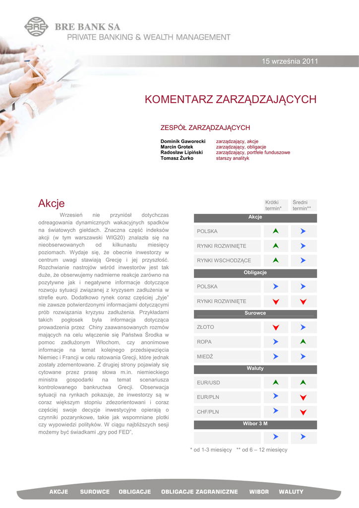 15 września 2011 KOMENTARZ ZARZĄDZAJĄCYCH ZESPÓŁ ZARZĄDZAJĄCYCH Dominik Gaworecki Marcin Grotek Radosław Lipiński Tomasz Żurko zarządzający, akcje zarządzający, obligacje zarządzający, portfele funduszowe starszy analityk Akcje Wrzesień nie przyniósł dotychczas odreagowania dynamicznych wakacyjnych spadków na światowych giełdach. Znaczna część indeksów akcji (w tym warszawski WIG20) znalazła się na nieobserwowanych od kilkunastu miesięcy poziomach. Wydaje się, że obecnie inwestorzy w centrum uwagi stawiają Grecję i jej przyszłość. Rozchwianie nastrojów wśród inwestorów jest tak duże, że obserwujemy nadmierne reakcje zarówno na pozytywne jak i negatywne informacje dotyczące rozwoju sytuacji związanej z kryzysem zadłużenia w strefie euro. Dodatkowo rynek coraz częściej „żyje” nie zawsze potwierdzonymi informacjami dotyczącymi prób rozwiązania kryzysu zadłużenia. Przykładami takich pogłosek była informacja dotycząca prowadzenia przez Chiny zaawansowanych rozmów mających na celu włączenie się Państwa Środka w pomoc zadłużonym Włochom, czy anonimowe informacje na temat kolejnego przedsięwzięcia Niemiec i Francji w celu ratowania Grecji, które jednak zostały zdementowane. Z drugiej strony pojawiały się cytowane przez prasę słowa m.in. niemieckiego ministra gospodarki na temat scenariusza kontrolowanego bankructwa Grecji. Obserwacja sytuacji na rynkach pokazuje, że inwestorzy są w coraz większym stopniu zdezorientowani i coraz częściej swoje decyzje inwestycyjne opierają o czynniki pozarynkowe, takie jak wspomniane plotki czy wypowiedzi polityków. W ciągu najbliższych sesji możemy być świadkami „gry pod FED”, Krótki termin* Średni termin** Akcje POLSKA RYNKI ROZWINIĘTE RYNKI WSCHODZĄCE POLSKA RYNKI ROZWINIĘTE ZŁOTO ROPA MIEDŹ EUR/USD EUR/PLN CHF/PLN Obligacje Surowce Waluty Wibor 3 M * od 1-3 miesięcy ** od 6 – 12 miesięcy 15 września 2011 KOMENTARZ ZARZĄDZAJĄCYCH który za kilka dni rozpocznie przedłużone, dwudniowe posiedzenie. Warto zwrócić uwagę na fakt, że wrzesień będzie obfitował w kilka innych, ważnych w świecie finansów spotkań: 22.IX - spotkanie ministrów finansów bloku BRIC (Brazylia, Rosja, Indie, Chiny); 23-25 IX - spotkanie Banku Światowego oraz Międzynarodowego Funduszu Walutowego w Waszyngtonie. Z pewnością inwestorzy z uwagą będą przyglądać się komunikatom z tych spotkań dotyczących pomysłów na rozwiązania obecnego kryzysu. Duża nerwowość inwestorów jest w opozycji do fundamentalnej sytuacji spółek i ich wycen, które z perspektywy historycznej są relatywnie tanie. Wskaźnik S&P 500/złoto, wskazujący relatywną wycenę instrumentów ryzykownych w postaci amerykańskich spółek do złota, jest obecnie na najniższym poziomie od 23 lat. Wydaje się więc, że spadki w dużej mierze spowodowane są niepewnością i chęcią ucieczki w bezpieczne aktywa (gotówka, złoto) niż negatywną oceną perspektyw spółek. Z punktu widzenia analizy technicznej, indeks WIG20 po raz kolejny znalazł się w okolicy wsparcia wyznaczonego przez 61,8% zniesienia hossy (2). Jeśli bykom uda się obronić ten poziom, można oczekiwać prób ukształtowania formacji podwójnego dna. . Obligacje polskie Korekta, na którą czekaliśmy od kilku tygodni stałą się faktem. Rentowność polskich obligacji 10-letnich wzrosła o przeszło 30 pb. Przekłada się to na spadek ich ceny o niespełna 3%. Mniejsze wzrosty rentowności odnotowały także pozostałe segmenty krzywej. Najmocniej (w rozumieniu zmian rentowności) trzyma się krótki koniec, co wynika między innymi z utrzymujących się oczekiwań na niezbyt odległy początek cyklu rozluźniania polityki monetarnej. Krzywa uległa więc wystromieniu, co wpłynęło pozytywnie na relatywną atrakcyjność środka i końca krzywej rentowności. W obecnej sytuacji nie śpieszymy się ze zwiększaniem duracji na prowadzonych portfelach, jednak zbliżamy się do poziomów przy których oczekiwany zysk do ryzyka będzie na 2 KOMENTARZ ZARZĄDZAJĄCYCH satysfakcjonujących nas poziomach. Wartości będziemy szukali na dłuższym końcu krzywej i w segmencie 4-5 lat. Krótkie obligacje w dalszym ciągu, pomimo prawdopodobnego scenariusza rozluźnienia polityki monetarnej i ostatnich spadków cen tych 15 września 2011 papierów, nie wydaje nam się atrakcyjnym celem inwestycyjnym. . Wykres: rentowność 10, 5 i 2 -letnich benchmarkowych obligacji polskich, źródło: Bloomberg nie Obligacje zagraniczne Obligacje Grecji w dalszym ciągu nurkują. Rentowność dziesięciolatek osiągnęła okolice 25%, dwuletnie papiery oferują rentowność przeszło 70%. Konkluzja rynków jest więc prosta - Grecja już zbankrutowała i czekamy tylko na finał spektaklu, który będzie raczej wcześniej niż później. Wydaje się, że im dłużej trwa ratowanie Grecji, w tym gorszej pozycji znajduje się kraj i coraz mniejsze są szansę na powrót do normalności. Ogromny deficyt i przeszło siedmioprocentowe spadki PKB rok do roku nie umożliwią szybkiej poprawy sytuacji. Dodatkowo cały czas pogarsza się sytuacja na rynku pracy i tym samym wszelkie wsparcie dla bolesnych reform mających na celu oszczędności będzie trudne do pozyskania. Implikuje to prawdopodobnie ciąg dalszy nie tylko finansowego i politycznego, ale też społecznego napięcia. Naszym zdaniem jak długo by trwałą kroplówka dla Grecji, restrukturyzacja długu będzie koniec końców nieunikniona. W dalszym ciągu na rekordowo niskich poziomach pozostają rentowności obligacji niemieckich. Liczymy na ich wzrosty w kilkumiesięcznym horyzoncie, jednak zdajemy sobie sprawę, że w oczekiwaniu na taki ruch cierpliwość może być wystawiona na długą próbę. Na rynku amerykańskich papierów skarbowych prawdopodobnie zagrały ostatnio oczekiwania na kolejną rundę zakupów obligacji przez Fed. Rynek oczekuje, że amerykańskie władze moneta