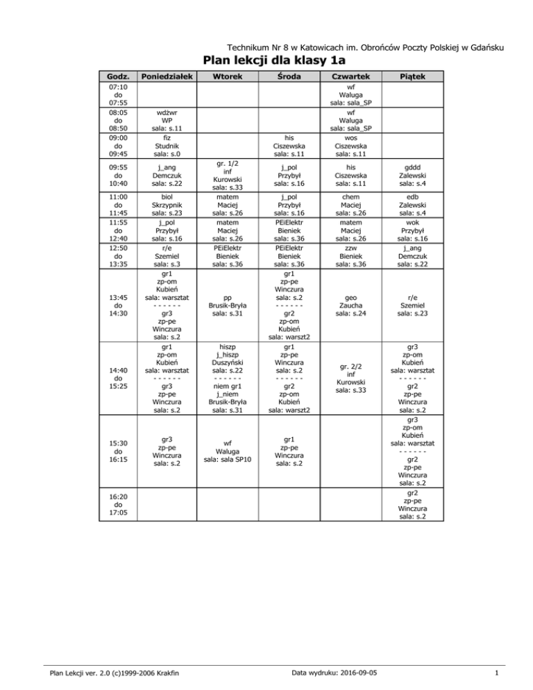 Plan lekcji dla klasy 1a - Szkoły Lotnicze w Katowicach