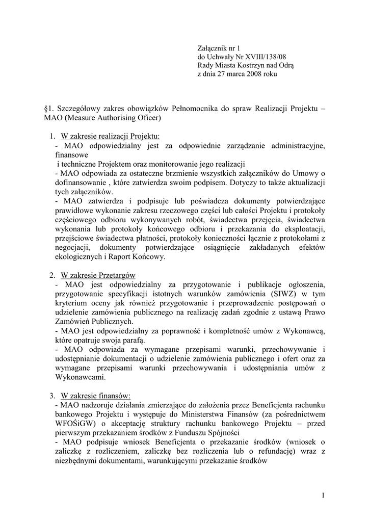 Załącznik nr 1 do Uchwały Nr XVIII/138/08 Rady Miasta Kostrzyn nad Odrą z dnia 27 marca 2008 roku §1. Szczegółowy zakres obowiązków Pełnomocnika do spraw Realizacji Projektu – MAO (Measure Authorising Oficer) 1. W zakresie realizacji Projektu: - MAO odpowiedzialny jest za odpowiednie zarządzanie administracyjne, finansowe i techniczne Projektem oraz monitorowanie jego realizacji - MAO odpowiada za ostateczne brzmienie wszystkich załączników do Umowy o dofinansowanie , które zatwierdza swoim podpisem. Dotyczy to także aktualizacji tych załączników. - MAO zatwierdza i podpisuje lub poświadcza dokumenty potwierdzające prawidłowe wykonanie zakresu rzeczowego części lub całości Projektu i protokoły częściowego odbioru wykonywanych robót, świadectwa przejęcia, świadectwa wykonania lub protokoły końcowego odbioru i przekazania do eksploatacji, przejściowe świadectwa płatności, protokoły konieczności łącznie z protokołami z negocjacji, dokumenty potwierdzające osiągnięcie zakładanych efektów ekologicznych i Raport Końcowy. 2. W zakresie Przetargów - MAO jest odpowiedzialny za przygotowanie i publikacje ogłoszenia, przygotowanie specyfikacji istotnych warunków zamówienia (SIWZ) w tym kryterium oceny jak również przygotowanie i przeprowadzenie postępowań o udzielenie zamówienia publicznego na realizację zadań zgodnie z ustawą Prawo Zamówień Publicznych. - MAO jest odpowiedzialny za poprawność i kompletność umów z Wykonawcą, które opatruje swoja parafą. - MAO odpowiada za wymagane przepisami warunki, przechowywanie i udostępnianie dokumentacji o udzielenie zamówienia publicznego i ofert oraz za wymagane przepisami warunki przechowywania i udostępniania umów z Wykonawcami. 3. W zakresie finansów: - MAO nadzoruje działania zmierzające do założenia przez Beneficjenta rachunku bankowego Projektu i występuje do Ministerstwa Finansów (za pośrednictwem WFOŚiGW) o akceptację struktury rachunku bankowego Projektu – przed pierwszym przekazaniem środków z Funduszu Spójności - MAO podpisuje wniosek Beneficjenta o przekazanie środków (wniosek o zaliczkę z rozliczeniem, zaliczkę bez rozliczenia lub o refundację) wraz z niezbędnymi dokumentami, warunkującymi przekazanie środków 1 - MAO podpisuje dokumenty rozliczeniowe, w tym faktury, dotyczące ponoszonych przez beneficjenta wydatków kwalifikowanych Projektu, a następnie zwraca się do SUZ (Sektorowy Urzędnik Zatwierdzający) poprzez WFOŚiGW o uznanie wydatków za kwalifikowane. - MAO podpisuje wniosek o płatność pośrednią wraz z niezbędnymi dokumentami, warunkującymi przekazanie przez KE płatności pośredniej na rachunek w instytucji Płatniczej dla Funduszu Spójności. Wniosek składany jest w WFOŚiGW i po weryfikacji przez SUZ oraz Instytucję Płatniczą przekazywane jest do KE. - MAO podpisuje zestawienie faktur do refundacji; które dostarczane jest wraz z wnioskiem o refundację. MAO podpisuje Wniosek o płatność końcową wraz z niezbędnymi dokumentami warunkującymi przekazanie środków. 4. W zakresie monitoringu: - MAO monitoruje rzeczowy i finansowy postęp w realizacji Projektu oraz zgodność realizacji Projektu z przepisami prawa krajowego i wspólnotowego, a w szczególności zasadami określonymi w Umowie Finansowania oraz wymogami SUZ i instytucji Płatniczej. - MAO zatwierdza i podpisuje miesięczne sprawozdanie finansowe, a także parafuje wstępną wersję półrocznych i rocznych raportów monitorujących dla Komitetu Monitorującego. - MAO reprezentuje Beneficjenta na posiedzeniach komitetu Monitorującego. 5. W zakresie kontroli: - MAO reprezentuje Beneficjenta przed organami kontrolującymi wykonanie Projektu w tym również kontrolę Umowy o dofinansowanie zawartej z WFOŚiGW i NFOŚiGW. 2