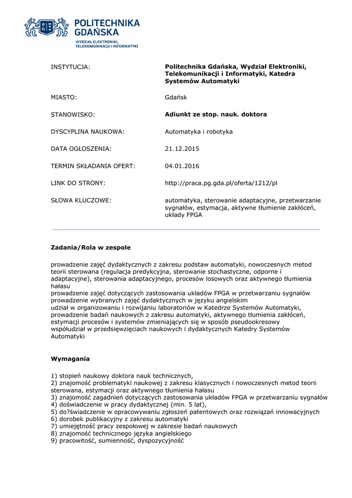INSTYTUCJA: Politechnika Gdańska, Wydział Elektroniki, Telekomunikacji i Informatyki, Katedra Systemów Automatyki MIASTO: Gdańsk STANOWISKO: Adiunkt ze stop. nauk. doktora DYSCYPLINA NAUKOWA: Automatyka i robotyka DATA OGŁOSZENIA: 21.12.2015 TERMIN SKŁADANIA OFERT: 04.01.2016 LINK DO STRONY: http://praca.pg.gda.pl/oferta/1212/pl SŁOWA KLUCZOWE: automatyka, sterowanie adaptacyjne, przetwarzanie sygnałów, estymacja, aktywne tłumienie zakłóceń, układy FPGA Zadania/Rola w zespole prowadzenie zajęć dydaktycznych z zakresu podstaw automatyki, nowoczesnych metod teorii sterowana (regulacja predykcyjna, sterowanie stochastyczne, odporne i adaptacyjne), sterowania adaptacyjnego, procesów losowych oraz aktywnego tłumienia hałasu prowadzenie zajęć dotyczących zastosowania układów FPGA w przetwarzaniu sygnałów prowadzenie wybranych zajęć dydaktycznych w języku angielskim udział w organizowaniu i rozwijaniu laboratoriów w Katedrze Systemów Automatyki, prowadzenie badań naukowych z zakresu automatyki, aktywnego tłumienia zakłóceń, estymacji procesów i systemów zmieniających się w sposób pseudookresowy współudział w przedsięwzięciach naukowych i dydaktycznych Katedry Systemów Automatyki Wymagania 1) stopień naukowy doktora nauk technicznych, 2) znajomość problematyki naukowej z zakresu klasycznych i nowoczesnych metod teorii sterowana, estymacji oraz aktywnego tłumienia hałasu 3) znajomość zagadnień dotyczących zastosowania układów FPGA w przetwarzaniu sygnałów 4) doświadczenie w pracy dydaktycznej (min. 5 lat), 5) do?świadczenie w opracowywaniu zgłoszeń patentowych oraz rozwiązań innowacyjnych 6) dorobek publikacyjny z zakresu automatyki 7) umiejętność pracy zespołowej w zakresie badań naukowych 8) znajomość technicznego języka angielskiego 9) pracowitość, sumienność, dyspozycyjność Dokumenty 1) odpis dyplomu uzyskania stopnia naukowego doktora nauk technicznych, 2) podanie skierowane do Prorektora ds. Nauki Politechniki Gdańskiej 3) życiorys, 4) kwestionariusz osobowy, 5) informacja o dorobku naukowym i dydaktycznym wraz ze spisem publikacji, 6) opinia co najmniej jednego nauczyciela akademickiego z tytułem naukowym profesora lub stopniem naukowym doktora habilitowanego TERMIN ROZSTRZYGNIĘCIA KONKURSU: 05.01.2016 r. PLANOWANY TERMIN ZATRUDNIENIA: 29.02.2016 Dokumenty należy złożyć do 04.01.2016 r. w Katedrze Systemów Automatyki, Wydział Elektroniki, Telekomunikacji i Informatyki Politechniki Gdańskiej, pok. 552 Prosimy o umieszczenie klauzuli "Wyrażam zgodę na przetwarzanie danych osobowych zawartych w mojej ofercie dla potrzeb niezbędnych przy procesie rekrutacji (zgodnie z Ustawą z dnia 29.08.1997 o Ochronie Danych Osobowych Dz.Ust. nr 133 poz. 883)". Konkurs może zostać zamknięty bez wyłonienia kandydata. Skontaktujemy się z wybranymi osobami. Nadesłanych pocztą ofert nie odsyłamy. Zlecający zastrzegają sobie prawo do odpowiedzi jedynie na wybrane oferty.