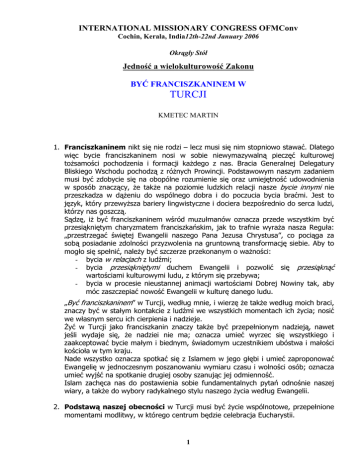 INTERNATIONAL MISSIONARY CONGRESS OFMConv Cochin, Kerala, India12th-22nd January 2006 Okrągły Stół Jedność a wielokulturowość Zakonu BYĆ FRANCISZKANINEM W TURCJI KMETEC MARTIN 1. Franciszkaninem nikt się nie rodzi – lecz musi się nim stopniowo stawać. Dlatego więc bycie franciszkaninem nosi w sobie niewymazywalną pieczęć kulturowej tożsamości pochodzenia i formacji każdego z nas. Bracia Generalnej Delegatury Bliskiego Wschodu pochodzą z różnych Prowincji. Podstawowym naszym zadaniem musi być zdobycie się na obopólne rozumienie się oraz umiejętność udowodnienia w sposób znaczący, że także na poziomie ludzkich relacji nasze bycie innymi nie przeszkadza w dążeniu do wspólnego dobra i do poczucia bycia braćmi. Jest to język, który przewyższa bariery lingwistyczne i dociera bezpośrednio do serca ludzi, którzy nas goszczą. Sądzę, iż być franciszkaninem wśród muzułmanów oznacza przede wszystkim być przesiąkniętym charyzmatem franciszkańskim, jak to trafnie wyraża nasza Reguła: „przestrzegać świętej Ewangelii naszego Pana Jezusa Chrystusa”, co pociąga za sobą posiadanie zdolności przyzwolenia na gruntowną transformację siebie. Aby to mogło się spełnić, należy być szczerze przekonanym o ważności: - bycia w relacjach z ludźmi; - bycia przesiąkniętymi duchem Ewangelii i pozwolić się przesiąknąć wartościami kulturowymi ludu, z którym się przebywa; - bycia w procesie nieustannej animacji wartościami Dobrej Nowiny tak, aby móc zaszczepiać nowość Ewangelii w kulturę danego ludu. „Być franciszkaninem” w Turcji, według mnie, i wierzę że także według moich braci, znaczy być w stałym kontakcie z ludźmi we wszystkich momentach ich życia; nosić we własnym sercu ich cierpienia i nadzieje. Żyć w Turcji jako franciszkanin znaczy także być przepełnionym nadzieją, nawet jeśli wydaje się, że nadziei nie ma; oznacza umieć wyrzec się wszystkiego i zaakceptować bycie małym i biednym, świadomym uczestnikiem ubóstwa i małości kościoła w tym kraju. Nade wszystko oznacza spotkać się z Islamem w jego głębi i umieć zaproponować Ewangelię w jednoczesnym poszanowaniu wymiaru czasu i wolności osób; oznacza umieć wyjść na spotkanie drugiej osoby szanując jej odmienność. Islam zachęca nas do postawienia sobie fundamentalnych pytań odnośnie naszej wiary, a także do wybory radykalnego stylu naszego życia według Ewangelii. 2. Podstawą naszej obecności w Turcji musi być życie wspólnotowe, przepełnione momentami modlitwy, w którego centrum będzie celebracja Eucharystii. 1 Musimy posiadać ducha otwartości i gościnności wobec tych, którzy pukają do naszych drzwi. Oni chcą nas poznać i dowiedzieć się kim my jesteśmy. Poprzez taki kontakt powinniśmy szukać dróg uwydatnienia naszej chrześcijańskiej tożsamości. W Turcji możliwości pracy apostolskiej są szczególnie ograniczone i zamykają się do trzech sposobów: a) Posługa w kościele, w miejscu kultu: nasze kościoły – św. Antoniego w Istambule, św. Heleny w Izmirze, Zwiastowania w Iskenderum – w których aktualnie spełniamy posługę, są parafiami. Liczba parafian, którym usługujemy jest bardzo niska. Sam Istambuł jest pewnym unikatem: do naszego kościoła bez przerwy pielgrzymują muzułmanie (ok. 8000 na tydzień) pragnący odwiedzić sanktuarium św. Antoniego, odmówić w nim określoną modlitwę i zapalić świecę. Podobnie w Izmirze nie brakuje ciekawskich, którzy odwiedzają nasz kościół i czasem zapytują o naszą wiarę. Pytania takie mogą być pierwszym krokiem do pogłębienia wiedzy o chrześcijaństwie. Należy wiedzieć, że w Turcji Kościół Katolicki nie jest uznawany przez rząd. W Libanie sytuacja jest całkowicie odmienna. Nasza wspólnota w Sin-el-fil służy dość liczebnej parafii rytu łacińskiego i ma wielkie pole do działania duszpastersko. Oprócz liturgicznej posługi – 4 Msze św. niedzielne z uczestnictwem ok. 900 wiernych przeróżnych rytów – zajmujemy się słuchaniem spowiedzi, kierownictwem duchowym i spotkaniami grup modlitewnych, katechizmem dzieci, apostolstwem młodzieżowym i rodzinnym, które wymagają od nas szczególnie dużo czasu i energii. b) Kontakty osobiste: innym ważnym polem naszej posługi bycia franciszkanami w Turcji są kontakty osobiste. Aspekty przyjaźni są bardzo drogie tutejszym ludziom i sprzyjają wzajemnemu poznawaniu się. Pomoc, którą okazujemy studentom jest bardzo żyzną glebą, gdyż w ten sposób jesteśmy bardziej znani i doceniani przez samą młodzież a także przez ich rodziny. Stąd może wypłynąć okazja do dialogu również z tematyki wiary, do wygłoszenia konferencji na tematy teologiczne w muzułmańskich fakultetach i centrach kulturowych oraz do między-religijnych i ekumenicznych spotkań. Należy tu docenić szczególne zaangażowanie fr. Alfonso Sammuta. c) Druk: O. Luigi Iannito, przy całkowitym poparciu wspólnoty w ciągu ostatnich 30 lat zdołał przetłumaczyć i wydrukować ponad 50 książek i innych publikacji o tematyce religijnej dotyczącej wiary chrześcijańskiej. Ten rodzaj posługi jest dla nas jednym z ważniejszych, gdyż w bardzo efektywny sposób może przybliżyć prawdy wiary chrześcijańskiej muzułmanom – w kraju, gdzie faktycznie jest zabronione wolne i publiczne przepowiadanie Ewangelii. 3. Żyjąc w Turcji można ubogacić swój własny bagaż kultury spotkając się z drugą odmienną religijnie osobą; przede wszystkim można zostać ubogaconym duchem przecudnej gościnności tego ludu; można się ubogacić stykając się z ubóstwem duchowym osób wciąż poszukujących, ponieważ wówczas docenia się bogactwo i bezcenność własnej wiary. Czujemy się bogatsi poprzez możliwość poznania nowego języka, ich języka – tureckiego, i staramy się żyć ich stylem życia – żyć wpośród nich. Największym jednak darem ubogacającym nas samych są k