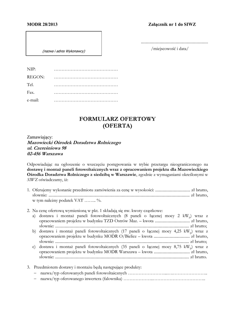 Załącznik nr 1 do SIWZ MODR 28/2013 (nazwa i adres Wykonawcy) NIP: …………………………………… REGON: …………………………………… Tel. …………………………………… Fax. …………………………………… e-mail: …………………………………… ................................................................... /miejscowość i data/ FORMULARZ OFERTOWY (OFERTA) Zamawiający: Mazowiecki Ośrodek Doradztwa Rolniczego ul. Czereśniowa 98 02-456 Warszawa Odpowiadając na ogłoszenie o wszczęciu postępowania w trybie przetargu nieograniczonego na dostawę i montaż paneli fotowoltaicznych wraz z opracowaniem projektu dla Mazowieckiego Ośrodka Doradztwa Rolniczego z siedzibą w Warszawie, zgodnie z wymaganiami określonymi w SIWZ oświadczamy, iż: 1. Oferujemy wykonanie przedmiotu zamówienia za cenę w wysokości: ................................... zł brutto, słownie: ............................................................................................................................................. zł brutto, w tym należny podatek VAT …….. %. 2. Na cenę ofertową wymienioną w pkt. 1 składają się nw. kwoty cząstkowe: a) dostawa i montaż paneli fotowoltaicznych (8 paneli o łącznej mocy 2 kWp) wraz z opracowaniem projektu w budynku TZD Ostrów Maz. – kwota ................................... zł brutto, słownie: ...................................................................................................................................... zł brutto; b) dostawa i montaż paneli fotowoltaicznych (17 paneli o łącznej mocy 4,25 kWp) wraz z opracowaniem projektu w budynku MODR O/Bielice – kwota .................................... zł brutto, słownie: ...................................................................................................................................... zł brutto; c) dostawa i montaż paneli fotowoltaicznych (35 paneli o łącznej mocy 8,75 kWp) wraz z opracowaniem projektu w budynku MODR Warszawa – kwota .................................... zł brutto, słownie: ...................................................................................................................................... zł brutto. 3. Przedmiotem dostawy i montażu będą następujące produkty: nazwa/typ oferowanych paneli fotowoltaicznych ……………………...….………………….. nazwa/typ oferowanego inwertera (falownika) ………………..…………………………….. 4. Udzielamy następujących gwarancji: a) na zamontowane panele fotowoltaiczne ………….. lat (Zamawiający wymaga aby Wykonawca udzielił min. 8 lat gwarancji na zamontowane panele), b) na konstrukcję nośną paneli ………… lat (Zamawiający wymaga aby Wykonawca udzielił min. 2 lata gwarancji na konstrukcję nośną paneli), c) na wady fizyczne zmniejszające wartość użytkową, techniczną i estetyczną wykonanych robót …………. lat (Zamawiający wymaga aby Wykonawca udzielił min. 3 lata gwarancji na wady fizyczne zmniejszające wartość użytkową, techniczną i estetyczną wykonanych robót), liczone od daty odbioru końcowego wykonanych prac będących przedmiotem umowy. 4. Wykonanie przedmiotu zamówienia zrealizujemy do dnia 20.12.2013 r. 5. W cenie naszej oferty zostały uwzględnione wszystkie koszty wykonania zamówienia. 6. Oświadczamy, że spełniamy warunki określone w art. 22 ust. 1 ustawy z dnia 29 stycznia 2004 r. Prawo zamówień publicznych (t.j. Dz. U. z 2013 r., poz. 907). 7. Wadium w kwocie ........................... zł zostało wniesione w dniu ................................ w formie .................................................................... Potwierdzenie wniesienia wymaganego wadium stanowi załącznik do złożonej oferty. Zwrotu wadium należy dokonać na nr rachunku bankowego: ................................................................. …………………………………………………………………………………………………… 8. Zapoznaliśmy się z treścią Specyfikacji Istotnych Warunków Zamówienia, w tym ze wzorem umowy i nie wnosimy do niej zastrzeżeń oraz przyjmujemy warunki w niej zawarte. 9. Oświadczamy, że uzyskaliśmy wszelkie informacje niezbędne do prawidłowego przygotowania i złożenia niniejszej oferty. 10. Wykonanie niżej wskazanych części zamówienia powierzymy podwykonawcom: (wypełnić jeżeli dotyczy) a) ……………………………………………………………………………………..……; b) ……………………………………………………………………………………….….; c) ……………………………………………………………………………….………….. 11. Uważamy się za związanych niniejszą ofertą na czas wskazany w SIWZ. 12. W przypadku przyznania nam zamówienia, zobowiązujemy się do zawarcia umowy w miejscu i terminie wskazanym przez Zamawiającego. 13. Oświadczamy, że niniejsza oferta zawiera na stronach nr od …...... do …...... informacje stanowiące tajemnicę przedsiębiorstwa w rozumieniu przepisów o zwalczaniu nieuczciwej konkurencji. 14. Oferta została złożona na …..... stronach, kolejno ponumerowanych od nr …….... do nr …….... ______________________________________ podpis Wykonawcy (osoby upoważnionej)