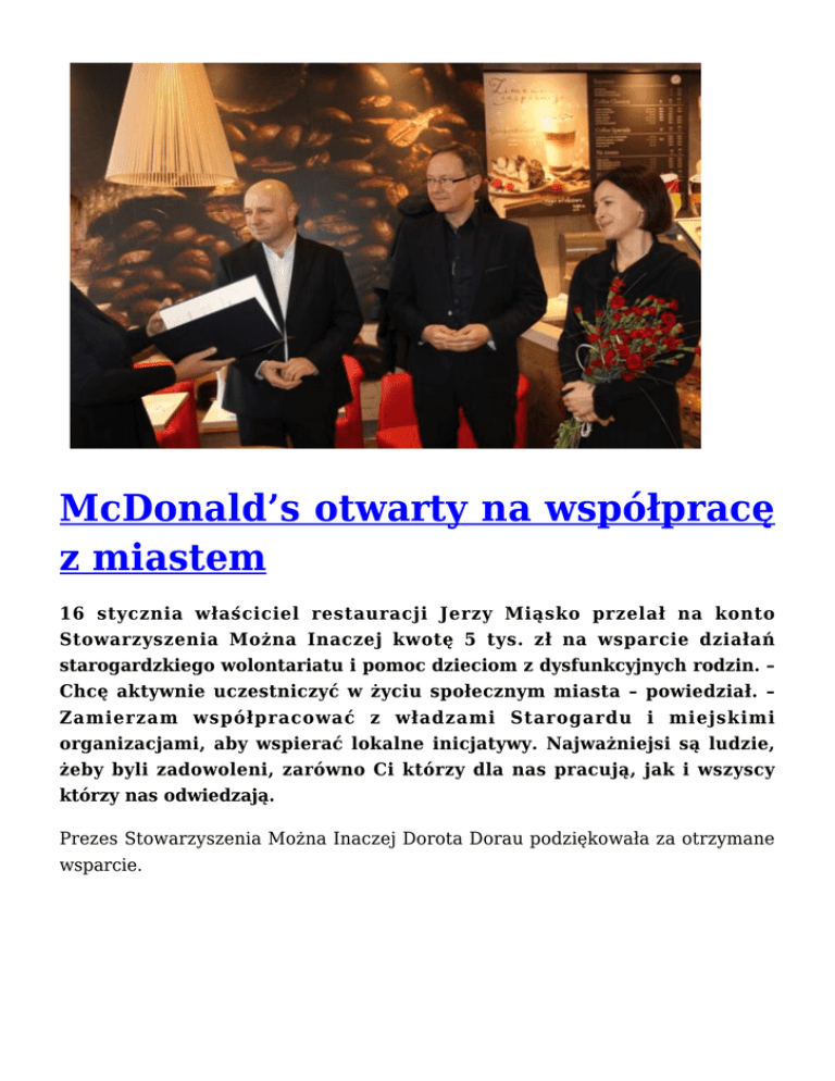 McDonald’s otwarty na współpracę z miastem 16 stycznia właściciel restauracji Jerzy Miąsko przelał na konto Stowarzyszenia Można Inaczej kwotę 5 tys. zł na wsparcie działań starogardzkiego wolontariatu i pomoc dzieciom z dysfunkcyjnych rodzin. – Chcę aktywnie uczestniczyć w życiu społecznym miasta – powiedział. – Zamierzam współpracować z władzami Starogardu i miejskimi organizacjami, aby wspierać lokalne inicjatywy. Najważniejsi są ludzie, żeby byli zadowoleni, zarówno Ci którzy dla nas pracują, jak i wszyscy którzy nas odwiedzają. Prezes Stowarzyszenia Można Inaczej Dorota Dorau podziękowała za otrzymane wsparcie. Prezes Stowarzyszenia Można Inaczej Dorota Dorau dziękuje właścicielowi McDonald’s Jerzemu Miąsko ” za wsparcie i pomoc. – To dla nas wielkie wyróżnienie, pomoc i zobowiązanie do jeszcze większej pracy na rzecz osób potrzebujących – powiedziała. W podziękowaniu wręczyła właścicielom ręcznie wykonane anioły dla pracowników oraz „słoik świata pozytywnych myśli” z cytatami motywującymi do działania. Jerzy i Anetta Miąsko nie kryli zaskoczenia i podziwu dla otrzymanych podarunków. Tego dnia gościem McDonald’s był również prezydent Janusz Stankowiak. Prezydent Janusz Stankowiak przygotowuje się do pracy na kasie w McDonald’s, którą wylicytował właściciel restauracji Jerzy Miąsko w 25. Finale WOŚP. Właściciel pokazał mu restaurację „od kuchni”. Prezydent przymierzył się do obsługi kasy, zadania które będzie wykonywał prawdopodobnie na wiosnę. Jerzy Miąsko wylicytował cztery godziny pracy prezydenta podczas wczorajszego 25. Finału Wielkiej Orkiestry Świątecznej Pomocy za sumę 2500 zł. – Po tym co zobaczyłem, zaczynam mieć obawy – stwierdził Janusz Stankowiak – Ta praca tylko pozornie wydaje się prosta. Nie wiem, czy zdołam nauczyć się tych wszystkich nazw, aby nie zawieść gości restauracji. Właściciel uspokoił włodarza miasta, zapewniając, że na pewno nie pozostawi go bez pomocy. – Cztery godziny to zdecydowanie za mało, aby wszystkiego się nauczyć – przyznał Jerzy Miąsko – ale na pewno damy radę i będzie wesoło. Myślę, że dla pracowników McD to będzie wielka frajda popracować ramię w ramię z prezydentem miasta. A my postaramy się dostarczyć panu prezydentowi mnóstwo nowych doświadczeń i wrażeń – dodał. Przy okazji opowiedział o pracy w McDonald’s, zatrudnieniu (również osób niepełnosprawnych), sposobach motywowania pracowników i budowania Jerzy Miąsko Właściciel starogardzkiego Maka pokazuje prezydentowi Januszowi Stankowiakowi restaurację „od kuchni”. przyjaznej atmosfery wewnątrz i na zewnątrz lokalu. Wspomniał też o swoich planach na przyszłość, o tym jak chce zagospodarować obejście wokół restauracji i co wymaga jeszcze poprawy. Podkreślił, że bardzo cieszy go, że starogardzianie tak pozytywnie i życzliwie przyjęli nową restaurację. – Widać, że naprawdę czekali na McDonald’sa – powiedział z uśmiechem. – Mamy nadzieję, że ta wzajemna przyjaźń będzie się rozwijać i że będziemy mogli aktywnie i skutecznie włączać się w życie miasta, wspierając różne jego inicjatywy na rzecz mieszkańców. Podczas spotkania, w którym uczestniczyła również żona właściciela i jego współpracownik Anetta Miąsko, ksiądz proboszcz Parafii pw. Św. Mateusza Eugeniusz Stencel pobłogosławił i poświęcił nową restaurację. ngg_shortcode_0_placeholder” order_by=”sortorder” order_direction=”ASC” returns=”included” maximum_entity_count=”500″]
