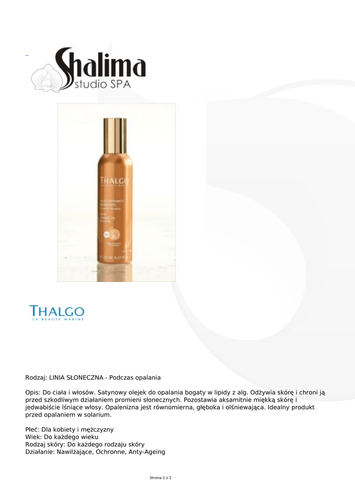 Rodzaj: LINIA SŁONECZNA - Podczas opalania Opis: Do ciała i włosów. Satynowy olejek do opalania bogaty w lipidy z alg. Odżywia skórę i chroni ją przed szkodliwym działaniem promieni słonecznych. Pozostawia aksamitnie miękką skórę i jedwabiście lśniące włosy. Opalenizna jest równomierna, głęboka i olśniewająca. Idealny produkt przed opalaniem w solarium. Płeć: Dla kobiety i mężczyzny Wiek: Do każdego wieku Rodzaj skóry: Do każdego rodzaju skóry Działanie: Nawilżające, Ochronne, Anty-Ageing Strona 1 z 2 Kategoria: Pozostałe Strona 2 z 2