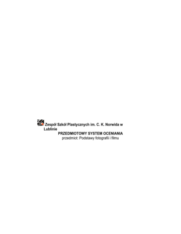 Zespół Szkół Plastycznych im. C. K. Norwida w Lublinie PRZEDMIOTOWY SYSTEM OCENIANIA przedmiot: Podstawy fotografii i filmu Przedmiotowy System Oceniania opracowany został w oparciu o: a. Rozporządzenie Ministra Kultury i Dziedzictwa Narodowego z dnia 24 sierpnia 2015 r. w sprawie szczegółowych warunków i sposobu oceniania, klasyfikowania i promowania uczniów w publicznych szkołach . b. Statut Zespołu Szkół Plastycznych im Cypriana Kamila Norwida w Lublinie. We wszystkich sprawach, które nie zostały szczegółowo określone w poniższym dokumencie obowiązują zapisy zawarte w Wewnątrzszkolnym Systemie Oceniania. 1. Ocenie podlegają wiadomości i umiejętności określone na podstawie programu nauczania przewidzianego dla przedmiotu Podstawy Fotografii i filmu. 2. Na początku roku szkolnego nauczyciel informuje uczniów o najważniejszych wymaganiach edukacyjnych wynikających z realizowanego przez siebie programu nauczania. 3. Zgodnie z Rozporządzeniem MKiDN stosuje się 6-stopniową skalę ocen bieżących, semestralnych i rocznych: ·celujący ·bardzo dobry ·dobry ·dostateczny ·dopuszczający ·niedostateczny Aby otrzymać klasyfikującą oceną śródroczną lub roczną uczeń musi uzyskać co najmniej 4 oceny cząstkowe w semestrze oraz obecność na zajęciach powyżej 50%. W szczególnych przypadkach (długotrwała choroba, usprawiedliwiona absencja) warunki uzyskania oceny klasyfikującej mogą zostać indywidualnie ustalone z nauczycielem. Warunki klasyfikacji szczegółowo określa statut szkoły. Ocena semestralna i roczna nie jest średnią arytmetyczną ocen cząstkowych, ale nie może być z nią sprzeczna. Dodatkowymi elementami, które wpływają na ocenę są czynniki wynikające z indywidualizacji procesu nauczania. Ocenę celującą bieżącą, semestralną lub roczną otrzymują uczniowie, których prace są zgodne z założonymi celami ćwiczeń, poszerzają spektrum przewidzianych dla danych projektów elementów. Prace są czytelne w zamyśle, perfekcyjne w wykonaniu, oryginalne, wyróżniają się walorami artystycznymi. Uczniowie w trakcie realizacji zadań korzystali z różnych źródeł informacji, wykazali dużą samodzielność i twórcze zaangażowanie. Ponadto, brali udział w zewnętrznych konkursach, przeglądach artystycznych, wystawach szkolnych lub osiągnęli inne sukcesy w dziedzinie fotografii i filmu. Średnia ocen cząstkowych wynosi powyżej 5. Ocenę bardzo dobrą bieżącą, semestralną lub roczną otrzymują uczniowie, których prace są zgodne z założonymi celami, spełniają wszystkie założone elementy składowe projektu, są czytelne w zamyśle z użyciem adekwatnych środków formalnych i wykonane zgodnie z procesem technologicznym. Uczniowie pracowali systematycznie, w trakcie pracy wykazali duże zaangażowanie i samodzielność kontrolowaną przez nauczyciela. Średnia ocen wynosi powyżej 4,6. Ocenę dobrą bieżącą, semestralną lub roczną otrzymują uczniowie, którzy pracowali systematycznie, ich prace spełniają podstawowe założenia formalne, składają się ze wszystkich założonych elementów, wykonane są estetyczne, zgodnie z procesem technologicznym. W trakcie pracy uczniowie korzystali z pomocy nauczyciela. Średnia ocen wynosi powyżej 3,6. Ocenę dostateczną bieżącą, semestralną lub roczną otrzymują uczniowie, których prace spełniają częściowo założenia kryteriów najwyższą ocenę, są poprawne pod względem estetyki wykonania. Uczniowie w trakcie pracy korzystali z dużej pomocy nauczyciela. Średnia ocen wynosi powyżej 2,6. Ocenę dopuszczającą bieżącą, semestralną lub roczną otrzymują uczniowie, których prace częściowo spełniają założone cele, składają się z części założonych elementów, ale wykonane zostały w sposób nieestetyczny. Uczniowie w trakcie realizacji zadań wymagali stałej pomocy nauczyciela. Średnia ocen wynosi powyżej 1,6. Ocenę niedostateczną bieżącą, semestralną lub roczną otrzymują uczniowie, którzy nie zdobyli minimalnej ilości wymaganych ocen pozytywnych, bądź ich prace nie spełniają założeń kryteriów oceny. Ocena niedostateczna nie promuje ucznia. 4. Obszary aktywności ucznia podlegające ocenie oraz waga oceny w 5-cio stopniowej skali: wypowiedzi ustne (waga oceny - 2): niedostateczna (1) - brak lub błędna odpowiedź dopuszczająca (2) - uczeń odpowiada jedynie na zadane pytania zamknięte; dostateczna (3) - odpowiedź ucznia nie jest samodzielna, wymaga pomocy ze strony nauczyciela; dobra (4) - odpowiedź samodzielna, ale nie wyczerpuje zagadnienia; bardzo dobra (5) - odpowiedź samodzielna i wyczerpująca; celująca (6) - odpowiedź samodzielna, wykraczająca poza program nauczania; sprawdzian pisemny (waga oceny - 2): uczeń otrzymuje ocenę pozytywną z min. 40% odpowiedzi pozytywnych, oceny wyższe są proporcjonalne w/g pozostałej skali procentowej; prowadzenie notatek (zeszyt/szkicownik) - ocenie podlega zawartość, systematyka prowadzenia notatek, dokumentacja procesu projektowania i realizacji zadań praktycznych (waga oceny - 2); aktywność ucznia na lekcjach w trakcie realizacji ćwiczeń praktycznych ocenie podlega zaangażowanie w pracy indywidualnej lub zespołowej, umiejętność praktycznego wykorzystywania wiedzy teoretycznej (waga oceny - 1); ćwiczenia odtwórcze, realizowane w celu utrwalenia wiedzy teoretycznej. Ocenie podlega stopień samodzielności realizacji zadania, poziom wykorzystanej wiedzy i adekwatność rozwiązań (waga oceny - 1); dodatkowe prace pisemne, referaty i prezentacje na zadany temat - ocenie podlega zawartość (ilość i jakość zdobytej wiedzy), sposób jej prezentacji (przekaz werbalny, przygotowany materiał poglądowy, prezentacje multimedialne) (waga oceny - 1); projekt pracy (waga oceny - 2) - ocenie podlega proces projektowania proces planowania czasu i metod realizacji zadania, poszukiwania inspiracji, przewidywania efektów pracy, w przypadk