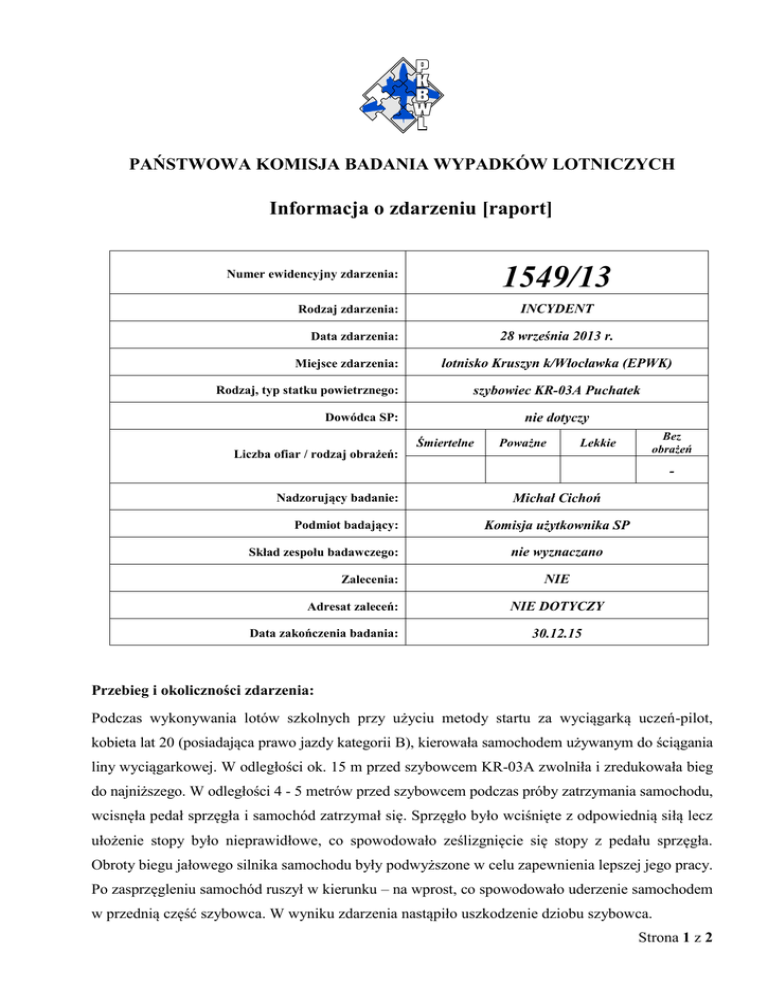 PAŃSTWOWA KOMISJA BADANIA WYPADKÓW LOTNICZYCH Informacja o zdarzeniu [raport] 1549/13 Numer ewidencyjny zdarzenia: INCYDENT Rodzaj zdarzenia: 28 września 2013 r. Data zdarzenia: Miejsce zdarzenia: Rodzaj, typ statku powietrznego: lotnisko Kruszyn k/Włocławka (EPWK) szybowiec KR-03A Puchatek Dowódca SP: Liczba ofiar / rodzaj obrażeń: nie dotyczy Śmiertelne Poważne Lekkie Bez obrażeń Nadzorujący badanie: Podmiot badający: Skład zespołu badawczego: Zalecenia: Adresat zaleceń: Data zakończenia badania: Michał Cichoń Komisja użytkownika SP nie wyznaczano NIE NIE DOTYCZY 30.12.15 Przebieg i okoliczności zdarzenia: Podczas wykonywania lotów szkolnych przy użyciu metody startu za wyciągarką uczeń-pilot, kobieta lat 20 (posiadająca prawo jazdy kategorii B), kierowała samochodem używanym do ściągania liny wyciągarkowej. W odległości ok. 15 m przed szybowcem KR-03A zwolniła i zredukowała bieg do najniższego. W odległości 4 - 5 metrów przed szybowcem podczas próby zatrzymania samochodu, wcisnęła pedał sprzęgła i samochód zatrzymał się. Sprzęgło było wciśnięte z odpowiednią siłą lecz ułożenie stopy było nieprawidłowe, co spowodowało ześlizgnięcie się stopy z pedału sprzęgła. Obroty biegu jałowego silnika samochodu były podwyższone w celu zapewnienia lepszej jego pracy. Po zasprzęgleniu samochód ruszył w kierunku – na wprost, co spowodowało uderzenie samochodem w przednią część szybowca. W wyniku zdarzenia nastąpiło uszkodzenie dziobu szybowca. Strona 1 z 2 Zdarzenie zaistniało o godz. 14:00 LMT podczas oczekiwania na lot szkolny. Kierująca samochodem została poddana badaniu alkomatem w KP we Włocławku – wynik negatywny. Wcześniej była przerwa w lotach spowodowana intensywnym, przelotnym opadem deszczu. Po opadzie była mokra, śliska trawa. Podczas chodzenia po nawierzchni trawiastej lotniska, uczeń-pilot kierująca samochodem miała mokre obuwie. Przyczyny zdarzenia lotniczego: 1. Niewłaściwa decyzja kierowcy o jeździe na wprost środka szybowca a nie w kierunku końcówki podniesionego skrzydła; 2. Nieprawidłowe ułożenie stopy na pedale sprzęgła samochodu ściągającego liny od wyciągarki; 3. Niewłaściwa reakcja kierowcy na ruszenie samochodu – brak zahamowania lub ominięcia szybowca. Okoliczności sprzyjające: Prowadzenie samochodu w obuwiu o gumo podobnej strukturze podeszwy co przy chodzeniu po mokrej trawie spowodowało utratę odpowiedniego tarcia pomiędzy podeszwą a pedałem sprzęgła. Działania profilaktyczne podjęte przez użytkownika SP: 1. Zdarzenie zostało omówione z uczniami upoważnionymi do prowadzenia pojazdów mechanicznych po lotnisku. Zwrócono uwagę na obuwie oraz odpowiednie reagowanie na sytuacje stresowe; 2. Ściąganie lin wyciągarkowych należy wykonywać w kierunku końcówki podniesionego skrzydła a nie na środek szybowca - w przypadku podobnego zdarzenia lub usterki mechanicznej samochód przejedzie pod skrzydłem. Zalecenia dotyczące bezpieczeństwa: Komisja nie formułowała zaleceń dotyczących bezpieczeństwa. Koniec Nadzorujący badanie: Imię i nazwisko Podpis Michał Cichoń podpis na oryginale Strona 2 z 2