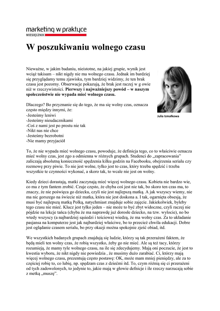 W poszukiwaniu wolnego czasu Nieważne, w jakim badaniu, nieistotne, na jakiej grupie, wynik jest wciąż takisam – nikt nigdy nie ma wolnego czasu. Jednak im bardziej się przyglądamy temu zjawisku, tym bardziej widzimy, że ten brak czasu jest pozorny. Obserwacje pokazują, że brak jest raczej w g owie niż w rzeczywistości. Pierwszy i najważniejszy powód – w naszym społeczeństwie nie wypada mieć wolnego czasu. Dlaczego? Bo przyznanie się do tego, że ma się wolny czas, oznacza często między innymi, że: -Jesteśmy leniwi -Jesteśmy nieudacznikami -Coś z nami jest po prostu nie tak -Nikt nas nie chce -Jesteśmy bezrobotni -Nie mamy przyjaciół Julia Izmałkowa To, że nie wypada mieć wolnego czasu, powoduje, że definicja tego, co to właściwie oznacza mieć wolny czas, jest zgo a odmienna w różnych grupach. Studenci do „zapracowania” zaliczają absolutną konieczność spędzenia kilku godzin na Facebooku, obejrzenia serialu czy rozmowę przy piwie. To nie jest wolne, tylko jest to czas, który trzeba spędzić i trzeba wszystkie te czynności wykonać, a skoro tak, to wcale nie jest on wolny. Kiedy dzieci dorastają, matki zaczynają mieć więcej wolnego czasu. Kobieta nie bardzo wie, co ma z tym fantem zrobić. Czuje często, że chyba coś jest nie tak, bo skoro ten czas ma, to znaczy, że nie poświęca go dziecku, czyli nie jest najlepszą matką. A jak wszyscy wiemy, nie ma nic gorszego na świecie niż matka, która nie jest doskona a. I tak, ogarnięta obsesją, że musi być najlepszą matką Polką, natychmiast znajduje sobie zajęcie. Jakiekolwiek, byleby tego czasu nie mieć. Klucz jest tylko jeden – nie może to być zbyt widoczne, czyli raczej nie pójdzie na lekcje tańca (chyba że ma naprawdę już dorosłe dziecko, na tzw. wylocie), no bo wtedy wszyscy (a najbardziej sąsiedzi i teściowa) wiedzą, że ma wolny czas. Za to układanie pasjansa na komputerze jest jak najbardziej właściwe, bo to przecież chwila edukacji. Dobre jest oglądanie czasem serialu, bo przy okazji można spokojnie zjeść obiad, itd. We wszystkich badanych grupach znajdują się ludzie, którzy są tak przerażeni faktem, że będą mieli ten wolny czas, że robią wszystko, żeby go nie mieć. Ale są też tacy, którzy rozumieją, że mamy tyle wolnego czasu, na ile się zdecydujemy. Mają oni poczucie, że jest to kwestia wyboru, że nikt nigdy nie powiedzia , że musimy dużo zarabiać. Ci, którzy mają więcej wolnego czasu, prezentują często postawę: OK, może mam mniej pieniędzy, ale za to częściej robię to, co lubię, np. spędzam czas z dziećmi itd. To, czym różnią się ci przerażeni od tych zadowolonych, to jedynie to, jakie mają w głowie defnicje i ile rzeczy narzucają sobie z metką „muszę”. „– Czy jest panu przykro, że pracuje pan w wolny dzień? – Nie, bo dla mnie wolny dzień nie jest wtedy, kiedy mam wolne”. I bardzo wszystkim tego życzę – poczucia, że to MY decydujemy, kiedy mamy wolne, a więc akceptacji faktu, że czas jest dla nas, a nie my dla czasu.