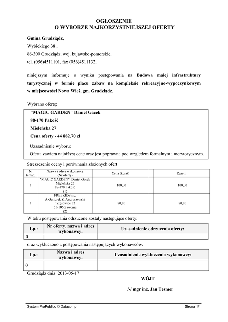 OGŁOSZENIE O WYBORZE NAJKORZYSTNIEJSZEJ OFERTY Gmina Grudziądz, Wybickiego 38 , 86-300 Grudziądz, woj. kujawsko-pomorskie, tel. (056)4511101, fax (056)4511132, niniejszym informuje o wyniku postępowania na Budowa małej infrastruktury turystycznej w formie placu zabaw na kompleksie rekreacyjno-wypoczynkowym w miejscowości Nowa Wieś, gm. Grudziądz. Wybrano ofertę: "MAGIC GARDEN" Daniel Gacek 88-170 Pakość Mieleńska 27 Cena oferty - 44 882.70 zł Uzasadnienie wyboru: Oferta zawiera najniższą cenę oraz jest poprawna pod względem formalnym i merytorycznym. Streszczenie oceny i porównania złożonych ofert Nr tematu 1 1 Nazwa i adres wykonawcy (Nr oferty) "MAGIC GARDEN" Daniel Gacek Mieleńska 27 88-170 Pakość (1) FREEKIDS s.c. A Gąsiorek Z. Andruszewski Trzęsowice 32 55-106 Zawonia (2) Cena (koszt) Razem 100,00 100,00 80,80 80,80 W toku postępowania odrzucone zostały następujące oferty: Lp.: Nr oferty, nazwa i adres wykonawcy: Uzasadnienie odrzucenia oferty: 0 oraz wykluczono z postępowania następujących wykonawców: Lp.: Nazwa i adres wykonawcy: Uzasadnienie wykluczenia wykonawcy: 0 Grudziądz dnia: 2013-05-17 WÓJT /-/ mgr inż. Jan Tesmer System ProPublico © Datacomp Strona 1/1