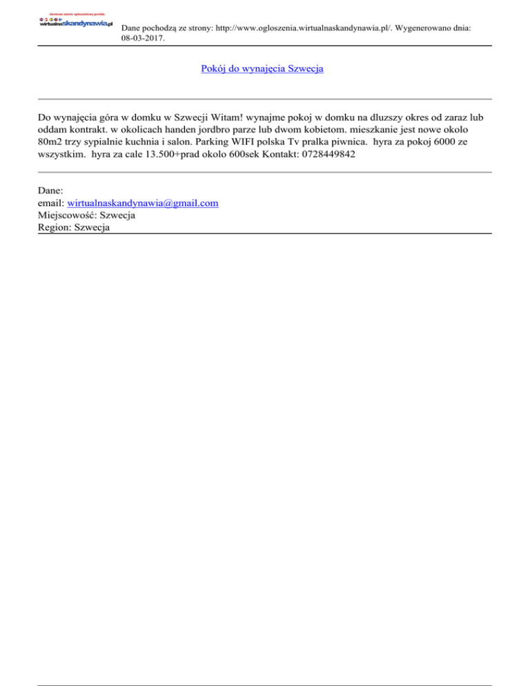 Dane pochodzą ze strony: http://www.ogloszenia.wirtualnaskandynawia.pl/. Wygenerowano dnia: 08-03-2017. Pokój do wynajęcia Szwecja Do wynajęcia góra w domku w Szwecji Witam! wynajme pokoj w domku na dluzszy okres od zaraz lub oddam kontrakt. w okolicach handen jordbro parze lub dwom kobietom. mieszkanie jest nowe okolo 80m2 trzy sypialnie kuchnia i salon. Parking WIFI polska Tv pralka piwnica. hyra za pokoj 6000 ze wszystkim. hyra za cale 13.500+prad okolo 600sek Kontakt: 0728449842 Dane: email: [email protected] Miejscowość: Szwecja Region: Szwecja