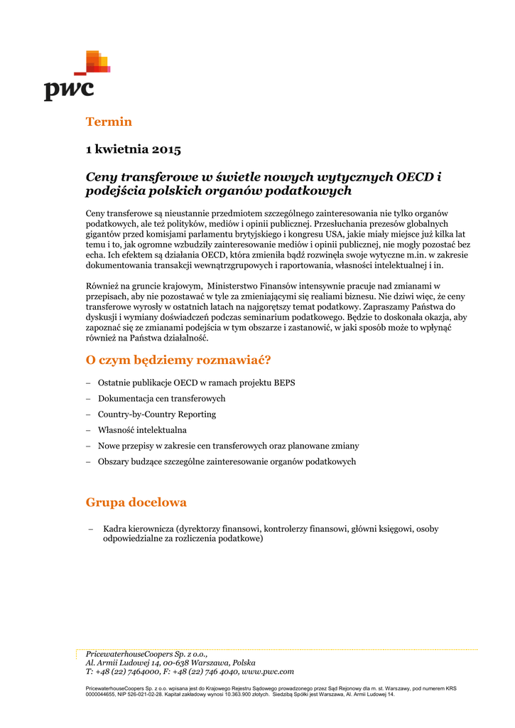 Termin 1 kwietnia 2015 Ceny transferowe w świetle nowych wytycznych OECD i podejścia polskich organów podatkowych Ceny transferowe są nieustannie przedmiotem szczególnego zainteresowania nie tylko organów podatkowych, ale też polityków, mediów i opinii publicznej. Przesłuchania prezesów globalnych gigantów przed komisjami parlamentu brytyjskiego i kongresu USA, jakie miały miejsce już kilka lat temu i to, jak ogromne wzbudziły zainteresowanie mediów i opinii publicznej, nie mogły pozostać bez echa. Ich efektem są działania OECD, która zmieniła bądź rozwinęła swoje wytyczne m.in. w zakresie dokumentowania transakcji wewnątrzgrupowych i raportowania, własności intelektualnej i in. Również na gruncie krajowym, Ministerstwo Finansów intensywnie pracuje nad zmianami w przepisach, aby nie pozostawać w tyle za zmieniającymi się realiami biznesu. Nie dziwi więc, że ceny transferowe wyrosły w ostatnich latach na najgorętszy temat podatkowy. Zapraszamy Państwa do dyskusji i wymiany doświadczeń podczas seminarium podatkowego. Będzie to doskonała okazja, aby zapoznać się ze zmianami podejścia w tym obszarze i zastanowić, w jaki sposób może to wpłynąć również na Państwa działalność. O czym będziemy rozmawiać? Ostatnie publikacje OECD w ramach projektu BEPS Dokumentacja cen transferowych Country-by-Country Reporting Własność intelektualna Nowe przepisy w zakresie cen transferowych oraz planowane zmiany Obszary budzące szczególne zainteresowanie organów podatkowych Grupa docelowa Kadra kierownicza (dyrektorzy finansowi, kontrolerzy finansowi, główni księgowi, osoby odpowiedzialne za rozliczenia podatkowe) PricewaterhouseCoopers Sp. z o.o., Al. Armii Ludowej 14, 00-638 Warszawa, Polska T: +48 (22) 7464000, F: +48 (22) 746 4040, www.pwc.com PricewaterhouseCoopers Sp. z o.o. wpisana jest do Krajowego Rejestru Sądowego prowadzonego przez Sąd Rejonowy dla m. st. Warszawy, pod numerem KRS 0000044655, NIP 526-021-02-28. Kapitał zakładowy wynosi 10.363.900 złotych. Siedzibą Spółki jest Warszawa, Al. Armii Ludowej 14. Prowadzący Piotr Wiewiórka Dyrektor Tel. +48 22 746 4645 [email protected] Piotr Wiewiórka jest Dyrektorem w zespole cen transferowych, w dziale prawno-podatkowym PwC. Posiada 16 letnie doświadczenie w realizacji projektów w obszarze podatkowym, w tym przede wszystkim w zakresie cen transferowych. Posiada szerokie doświadczenie w planowaniu oraz implementacji struktur podatkowych na każdym poziomie łańcucha wartości spółki, uwzględniając regulacje z zakresu cen transferowych. Kluczowe branże, w których działają klienci Piotra to sektor finansowy, FMCG, branża energetyczna. Piotr służy również pomocą swoim klientom w sporach z organami podatkowymi, przygotowywaniu studiów porównawczych oraz dokumentacji podatkowej. Jest współautorem publikacji: „Ceny transferowe” wydanej przez C.H. Beck oraz artykułów i komentarzy w prasie specjalistycznej. Piotr jest absolwentem Akademii Ekonomicznej w Poznaniu oraz doradcą podatkowym wpisanym na listę prowadzoną przez Ministerstwo Finansów. Bartłomiej Wajda Menedżer Tel. +48 (61) 851 1552 [email protected] Bartłomiej Wajda jest Menedżerem w zespole cen transferowych, w dziale prawno-podatkowym PwC. Tematyką cen transferowych zajmuje się od ponad 8 lat (wcześniej w innych firmach z tzw. Wielkiej Czwórki). Bartłomiej specjalizuje się w modelowaniu transakcji wewnątrzgrupowych, przygotowywaniu analiz rynku, restrukturyzacjach grupowych oraz w projektach dokumentacyjnych (w tym, z uwzględnieniem koncepcji „masterfile – local file”). W trakcie swojej pracy zajmował się również opracowywaniem dokumentacji obronnej uzasadniającej poziom rozliczeń w grupie, doradzał przy alokacji dochodu do zakładu oraz prowadził szkolenia z zakresu cen transferowych. Bartłomiej jest absolwentem Akademii Ekonomicznej w Poznaniu (Wydział Zarzadzania) oraz Uniwersytetu im. Adama Mickiewicza w Poznaniu (Wydział Prawa). Informacja o PwC PwC jest wiodącą globalną organizacją świadczącą profesjonalne usługi doradcze. Korzystając z wiedzy i kwalifikacji blisko 195.000 pracowników w 157 krajach, budujemy relacje z klientami dzięki usługom świadczonym w oparciu o zasady najwyższej jakości, przejrzystości i uczciwości w działaniu. W Polsce PwC zatrudnia zespół ponad 2000 specjalistów i kadry wspierającej w siedmiu miastach: w Gdańsku, Katowicach, Krakowie, Łodzi, Poznaniu, Wrocławiu i Warszawie. Nasza oferta jest kierowana do firm działających we wszystkich sektorach gospodarki – zarówno do największych koncernów, jak i lokalnych przedsiębiorstw rodzinnych. 2
