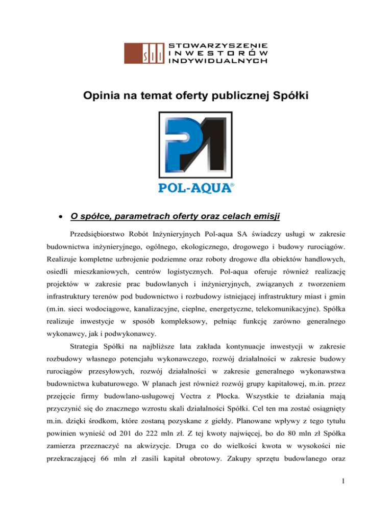 Opinia na temat oferty publicznej Spółki • O spółce, parametrach oferty oraz celach emisji Przedsiębiorstwo Robót Inżynieryjnych Pol-aqua SA świadczy usługi w zakresie budownictwa inżynieryjnego, ogólnego, ekologicznego, drogowego i budowy rurociągów. Realizuje kompletne uzbrojenie podziemne oraz roboty drogowe dla obiektów handlowych, osiedli mieszkaniowych, centrów logistycznych. Pol-aqua oferuje również realizację projektów w zakresie prac budowlanych i inżynieryjnych, związanych z tworzeniem infrastruktury terenów pod budownictwo i rozbudowy istniejącej infrastruktury miast i gmin (m.in. sieci wodociągowe, kanalizacyjne, cieplne, energetyczne, telekomunikacyjne). Spółka realizuje inwestycje w sposób kompleksowy, pełniąc funkcję zarówno generalnego wykonawcy, jak i podwykonawcy. Strategia Spółki na najbliższe lata zakłada kontynuacje inwestycji w zakresie rozbudowy własnego potencjału wykonawczego, rozwój działalności w zakresie budowy rurociągów przesyłowych, rozwój działalności w zakresie generalnego wykonawstwa budownictwa kubaturowego. W planach jest również rozwój grupy kapitałowej, m.in. przez przejęcie firmy budowlano-usługowej Vectra z Płocka. Wszystkie te działania mają przyczynić się do znacznego wzrostu skali działalności Spółki. Cel ten ma zostać osiągnięty m.in. dzięki środkom, które zostaną pozyskane z giełdy. Planowane wpływy z tego tytułu powinien wynieść od 201 do 222 mln zł. Z tej kwoty najwięcej, bo do 80 mln zł Spółka zamierza przeznaczyć na akwizycje. Druga co do wielkości kwota w wysokości nie przekraczającej 66 mln zł zasili kapitał obrotowy. Zakupy sprzętu budowlanego oraz 1 transportowego wymagać będą nakładów w wysokości nie przekraczającej 30 mln zł. Z kolei nakłady na budowę bazy sprzętowo transportowej oscylować będą maksymalnie w pobliżu 12 mln zł. Ponadto Pol-Aqua zamierza dokapitalizować firmy Kampol i Konex kwotą rzędu 34 mln zł. Ostateczny poziom inwestycji w zależny będzie od ceny emisyjnej. W ramach oferty publicznej zaoferowanych zostanie 4 mln akcji, z czego 1 mln walorów, to papiery sprzedawane, należące do największego udziałowca. Widełki ceny emisyjnej zostały zawarte w przedziale 70-77 zł. W transzy inwestorów instytucjonalnych zaoferowanych zostanie 3 mln akcji, a w transzy otwartej 1 mln walorów. Zapisy w transzy instytucjonalnej przyjmowane będą w terminie od 12 do 16 lipca 2006 roku. Zamknięcie oferty przypadnie na dzień 16 lipca, a akcje zostaną przydzielone w terminie do 6 dni roboczych od dnia zamknięcia oferty. Dyspozycje zakupu przyjmowane będą w Punktach Obsługi Klienta Domu Maklerskiego IDMSA. • Finanse, parametry wskaźników rynkowych Spółka od kilku lat notuje dość wysoką dynamikę rozwoju. Jeszcze w 2004 roku przychody Firmy sięgały poziomu 104 mln zł, zysk operacyjny 9,2 mln zł, a zysk netto 6,2 mln zł. Tymczasem już w roku 2006 Spółka wykazała 233,6 mln zł przychodów, zysk z działalności operacyjnej osiągnął wartość 29,8 mln zł, a zysk netto wyniósł 20,5 mln zł. Największa dynamika poprawy wyników miała w tym przypadku miejsce w roku 2005. Rentowność netto ukształtowała się w 2005 i 2006 roku odpowiednio na poziomie 5,9% oraz 8,8%. W okresie 2007-2008 planowany jest dalszy dynamiczny rozwój Spółki. Wpływ na to mają mieć inwestycje, pozyskane już kontrakty oraz akwizycje. Przychody w 2007 roku mają wzrosnąć aż do 935,4 mln zł. Zysk operacyjny ma wynieść 58,9 mln zł, a zysk netto 40 mln zł. Oznacza to, że rentowność netto realizowanych projektów spadnie w 2007 roku do poziomu 4,3%. Przyszły rok ma przynieść dalszy rozwój Firmy. Efektem ma być wzrost przychodów do poziomu 1,42 mld zł, wzrost zysku operacyjnego do 107,1 mln zł oraz zysku netto do poziomu 77,5 mln zł. Rentowność netto wzrośnie w 2008 roku do 5,5%. Obecnie sektor budowlany wyceniany jest przez rynek zbyt wysoko. Część Spółek wchodzących na giełdę korzysta z tej koniunktury oraz z wysokich konkurencyjnych wycen i plasuje swoje emisje na poziomie do nich zbliżonym. Przy maksymalnej cenie emisyjnej oraz po uwzględnieniu prognozy na bieżący rok, Pol-aqua będzie notowana przy wskaźniku C/Z na poziomie 53 oraz wskaźniku C/WK na poziomie 5,2. Wywiązanie się z przyszłorocznych 2 obietnic finansowych spowoduje jednak, że wskaźniki te spadną odpowiednio do poziomu 27,4 oraz 4,3. Tymczasem obecnie średnia wartość wskaźnika C/Z dla sektora budownictwo to 57, a wskaźnika C/WK 6,74*. Z kolei średnia wskaźnika C/Z dla konkurencyjnych spółek budowlanych wyliczona na bazie prognoz na rok 2007 wynosi 46,5. • Podsumowanie Pol-aqua to już trzecia spółka budowlana, która decyduje się w lipcu sięgnąć po kapitał z rynku. Sprzyja temu zarówno koniunktura giełdowa, moda na spółki z tego sektora, jak i bardzo duża szansa na pozyskanie dużej ilości środków na dalszy rozwój. Pol-aqua jest niewątpliwie dobrą Spółką, za którą stoi m.in. kapitał powiązany z Ryszardem Krauze. Od kilku lat obserwujemy dynamiczny skok skali działalności Firmy, a kolejne lata zwiastują jeszcze szybsze tempo rozwoju. Wpływ na to będą miały akwizycje oraz organiczny wzrost skali działalności, który będzie efektem m.in. pozyskanych środków oraz dobrej koniunktury w budownictwie. Ponadto Spółka wiąże duże nadzieje z przetargami związanymi z Euro 2012, a także z dużym zapotrzebowaniem na rurociągi w całej Europie. Warto tutaj podkreślić, że Pol-aqua uczestniczyła już przy realizacji m.in. odcinka rurociągu „Przyjaźń”. Do kluczowych czynników ryzyka związanych z funkcjonowaniem branży budowlanej, a tym samym Spółki należałoby zaliczyć niedobór pracowników budowlanych oraz podwykonawców, rosnącą presję na wzrost wynagrodzeń oraz galopujące ceny materiałów budowlanych. Pojawienie się jednak możliwość legalnego pozysk