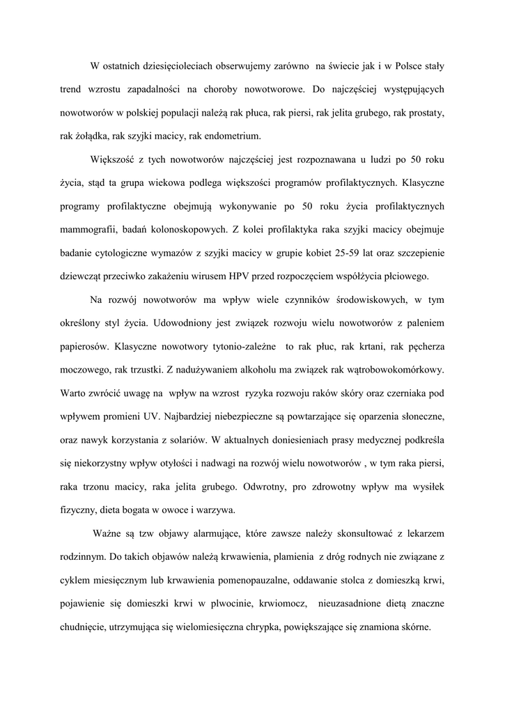W ostatnich dziesięcioleciach obserwujemy zarówno na świecie jak i w Polsce stały trend wzrostu zapadalności na choroby nowotworowe. Do najczęściej występujących nowotworów w polskiej populacji należą rak płuca, rak piersi, rak jelita grubego, rak prostaty, rak żołądka, rak szyjki macicy, rak endometrium. Większość z tych nowotworów najczęściej jest rozpoznawana u ludzi po 50 roku życia, stąd ta grupa wiekowa podlega większości programów profilaktycznych. Klasyczne programy profilaktyczne obejmują wykonywanie po 50 roku życia profilaktycznych mammografii, badań kolonoskopowych. Z kolei profilaktyka raka szyjki macicy obejmuje badanie cytologiczne wymazów z szyjki macicy w grupie kobiet 25-59 lat oraz szczepienie dziewcząt przeciwko zakażeniu wirusem HPV przed rozpoczęciem współżycia płciowego. Na rozwój nowotworów ma wpływ wiele czynników środowiskowych, w tym określony styl życia. Udowodniony jest związek rozwoju wielu nowotworów z paleniem papierosów. Klasyczne nowotwory tytonio-zależne to rak płuc, rak krtani, rak pęcherza moczowego, rak trzustki. Z nadużywaniem alkoholu ma związek rak wątrobowokomórkowy. Warto zwrócić uwagę na wpływ na wzrost ryzyka rozwoju raków skóry oraz czerniaka pod wpływem promieni UV. Najbardziej niebezpieczne są powtarzające się oparzenia słoneczne, oraz nawyk korzystania z solariów. W aktualnych doniesieniach prasy medycznej podkreśla się niekorzystny wpływ otyłości i nadwagi na rozwój wielu nowotworów , w tym raka piersi, raka trzonu macicy, raka jelita grubego. Odwrotny, pro zdrowotny wpływ ma wysiłek fizyczny, dieta bogata w owoce i warzywa. Ważne są tzw objawy alarmujące, które zawsze należy skonsultować z lekarzem rodzinnym. Do takich objawów należą krwawienia, plamienia z dróg rodnych nie związane z cyklem miesięcznym lub krwawienia pomenopauzalne, oddawanie stolca z domieszką krwi, pojawienie się domieszki krwi w plwocinie, krwiomocz, nieuzasadnione dietą znaczne chudnięcie, utrzymująca się wielomiesięczna chrypka, powiększające się znamiona skórne. W niektórych rodzinach występują uwarunkowania genetyczne chorób nowotworowych i te rodziny powinny pozostawać pod opieką Poradni Genetycznych oraz podlegać specjalnemu nadzorowi onkologicznemu.