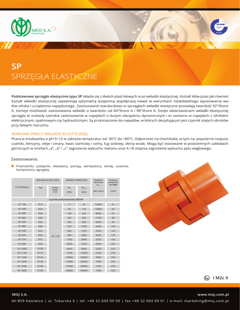 SP SPRZĘGŁA ELASTYCZNE Podstawowe sprzęgło elastyczne typu SP składa się z dwóch piast kłowych oraz wkładki elastycznej. Kształt kłów piast jak również kształt wkładki elastycznej zapewniają optymalną wzajemną współpracę nawet w warunkach niedokładnego wyosiowania wałów silnika i urządzenia napędzanego. Zastosowane standardowo w sprzęgłach wkładki elastyczne posiadają twardość 92°Shore A. Istnieje możliwość zastosowania wkładki o twardości od 64°Shore A i 98°Shore A. Dzięki właściwościom wkładki elastycznej sprzęgła te znalazły szerokie zastosowanie w napędach o dużym obciążeniu dynamicznym i to zarówno w napędach z silnikiem elektrycznym, spalinowym czy hydraulicznym. Są przeznaczone do napędów, w których decydującym jest czynnik stałych obrotów przy łatwym rozruchu. WARUNKI PRACY WKŁADKI ELASTYCZNEJ: Praca w środowisku o pH 5÷12 w zakresie temperatur od -30°C do +80°C. Odporność na chemikalia, w tym na: popularne rozpuszczalniki, benzyny, oleje i smary, kwas siarkowy i solny, ług sodowy, słoną wodę. Mogą być stosowane w podziemnych zakładach górniczych w strefach „a”, „b” i „c” zagrożenia wybuchu metanu oraz A i B stopnia zagrożenia wybuchu pyłu węglowego. Zastosowania: Przenośniki, podajniki, elewatory, pompy, wentylatory, windy, suwnice, kompresory, agregaty. WKŁADKA ELASTYCZNA TYP SPRZĘGŁA Typ Temp. pracy [OC] MOMENT OBROTOWY Mzn Mmax [Nm] [Nm] Prędkość obrotowa nmax Średnica zwnętrzna sprzęgła [obr./min.] [mm] Łącznik poliuretanowy 98ShА SP 19R R19 17 34 14000 41 SP 24R R24 60 120 10600 56 SP 28R R28 160 320 8500 65 SP 38R R38 325 650 7100 80 SP 42R R42 450 900 6000 95 SP 48R R48 525 1050 5600 105 SP 55R R55 685 1370 4750 120 SP 65R R65 940 1880 4250 135 SP 75R R75 1920 3840 3550 160 SP 90R R90 3600 7200 2800 200 SP 100R R100 4950 9900 2500 225 SP 110R R110 7200 14400 2240 255 SP 125R R125 10000 20000 2000 290 SP 140R R140 12800 25600 1800 320 SP 160R R160 19200 38400 1500 370 SP 180R R180 28000 56000 1400 420 -30÷+90 I M2c X MOJ S.A. www.moj.com.pl 40-859 Katowice | ul. Tokarska 6 | tel. +48 32 604 09 00 | fax +48 32 604 09 01 | e-mail: [email protected]