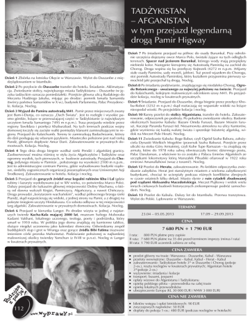 TADŻYKISTAN – AFGANISTAN w tym przejazd legendarną drogą Pamir Higway Dzień 7 Po śniadanie przejazd na północ do osady Burunkul. Przy odrobinie szczęścia dojrzymy owce Marco Polo, świstaki żyjące na tych odległych terenach. Spacer nad jeziorem Burunkul, którego wody mają przepiękny niebieski kolor. Następnie kierujemy się Autostradą Pamirską na zachód do Chorog. Droga wspina się ku przełęczy Kojtezek (4272 m n.p.m. )Mijamy stałe osady Pamirów, sady moreli, jabłoni. Tuż przed wjazdem do Chorogu, stoi pomnik Autostrady Pamirskiej, który kształtem przypomina pierwszy saDzień 1 Zbiórka na lotnisku Okęcie w Warszawie. Wylot do Duszanbe z mięmochód jaki przejechał tą drogą. Nocleg. dzylądowaniem w Istambule. Dzień 2 Po przylocie do Duszanbe transfer do hotelu. Śniadanie. Aklimatyza- Dzień 8 Po śniadaniu podziwianie, znajdującego się niedaleko Chorog, Ogrodu Botanicznego - uważanego za najwyżej położony na świecie. Przejazd cja. Zwiedzanie stolicy, największego miasta Tadżykistanu – Duszanbe (w jędo Kalaichumb, kolejnym malowniczym odcinkiem szosy M41. Po przyjeźzyku tadżyckim oznacza poniedziałek). Przejście główna ulicą Rudakiego do dzie kolacja, nocleg w kwaterach prywatnych. Meczetu Hadżiego Jakuba, mijając po drodze: pomnik Ismaila Samanida (twórcy państwa Samanidów w X w.), budynek Parlamentu, Pałac Prezydenc- Dzień 9 Śniadanie. Przejazd do Duszanbe, droga biegnie przez przełęcz Khobu-Robot (3252 m n.p.m.) skąd roztaczają się wspaniałe widoki na leżące ki. Kolacja. Nocleg. nieopodal wioski. Po przyjeździe kolacja i nocleg. Dzień 3 Wyjazd do Pamiru autostradą M41. Pamir przez miejscowych zwany jest Bam-i-Dunja, co oznacza „Dach Świata”. Jest to rozległe i wysokie pa- Dzień 10 Ranny przelot do stolicy Afganistanu, transfer do hotelu. Zakwaterowanie, odpoczynek po podroży. Po południu zwiedzanie okolicy. Badanie smo górskie, leżące w przeważającej części w Tadżykistanie (z największym okolicznych bazarów Kabulu: Bazare Omda Furuszi, Bazare Moszin furuszczytem Ismaila Samaniego 7495 m n.p.m.). Trasa przejazdu wiedzie przez szi, Kuczeje Paranda Furuszi itd. Niesamowita atmosfera na ulicy Kantorów, regiony Tawildara i przełęcz Khaburabad. Na tych terenach podczas wojny gdzie wymienia się każdą walutę świata i sprzedaje biżuterię afgańską, widomowej toczyły się zacięte walki pomiędzy klanami zamieszkującymi te redok na Meczet Pule Heszti. Nocleg. giony. Przejazd do Kalaichumb. Tereny te zamieszkują Badachrzanie, którzy do dziś posługują się własnym językiem. Miasteczko położone jest nad rzeką Dzień 11 Zwiedzanie Kabulu: Boge Babur, czyli Ogród Szaha Babura, założyPandż, głównym dopływie Amur Darii. Zakwaterowanie w prywatnych dociela Dynastii Wielkich Mogołów (prawnuk Szaha Babura). Przejście przez mostwach. Kolacja. Nocleg. uliczki na stoku Góry Armatniej, czyli Kuhe Tupe Ramazan - tu znajdują się armaty, które do 1978 roku salwą obwieszczały koniec dziennego postu, Dzień 4 Tego dnia droga biegnie wzdłuż rzeki Pendżi i afgańskiej granicy. Pałac Darulaman, a właściwie to co zostało z Pałacu Emirów Afgańskich ze Zaobserwować można różnicę w stylu życia Afgańczyków i Tadżyków oraz szczątkami lokomotywy którą Marszałek Piłsudski ofiarował w 1922 roku ogromny wysiłek, tych pierwszych, w budowie autostrady. Przyjazd do Choemirowi Amanullahowi (wraz z torami!). Nocleg. rog, jedynego miasta w Pamirze , położonego na wysokości 2100 m n.p.m.. Jest to administracyjne centrum Pamiru, gdzie wybudowano budynki rządo- Dzień 12 Przelot do Heratu, zakwaterowanie. Po krótkim odpoczynku zwiewe, siedziby zagranicznych organizacji pozarządowych oraz Uniwersytet Azji dzanie zabytków. Herat jest starożytnym miastem z wieloma zabytkowymi Środkowej. Zakwaterowanie w hotelu. Kolacja i nocleg. budynkami, chociaż te ucierpiały podczas różnych konfliktów zbrojnych w czasie ostatnich kilku dekad. Miasto słynie z ruin cytadeli zbudowanej Dzień 5 Przejazd do gorących źródeł oraz kopalni rubinów Khu i Lal (gdzie pod rządami Aleksandra Macedońskiego. Meczet Piątkowy i widok wielu rubiny i lazuryty wydobywano już w XIV wieku, co potwierdza Marco Polo). innych ciekawych budowli historycznych zrekompensuje podróż samochoDalszy przejazd do Iszkaszim głównej miejscowości Doliny Wachanu, o któdem. Nocleg. rą od dawna walczyli Kirgizi, Pamirczycy, Afgańczycy, a nawet Chińczycy. Droga prowadzi „korytarzem wachańskim”, wzdłuż północnego brzegu rzeki Dzień 13 Przelot do Kabulu. Dalszy lot do Istambułu. Przerwa tranzytowa. Piandż, skąd rozpościerają się widoki, z jednej strony na Pamir, a z drugiej na Wylot do Polski. Lądowanie w Warszawie. pokryte śniegiem szczyty Hindukuszu. Co sobota odbywa w tej miejscowości targ afgański. Zakwaterowanie w prywatnych domostwach. Kolacja. Nocleg. TERMINY Dzień 6 Przejazd w kierunku Langer. Po drodze wizyta w jednej z najstarszych twierdz Kacha-Kala mającej 2000 lat, muzeum Sufiego Muboraka Kadami Vakhani, lokalnego uczonego, teologa, poety i podróżnika, który umarł w 1910 roku. W pobliżu jego domu znajdują się kamienne tablice, służące niegdyś uczonemu jako kalendarz słoneczny. Odwiedzamy zespół buddyjskich stup i grot w Wranga oraz gorące źródła Bibi Fatima (nazwane imieniem córki proroka Mahometa). Podziwianie położonej w najbardziej malowniczej okolicy twierdzy Yamchun (z IV-III w p.n.e). Nocleg w Langer w kwaterach prywatnych. 23.04 – 05.05.2013 17.09 – 29.09.2013 CENA 7 680 PLN + 1 790 EUR I rata: 800 PLN płatne przy zapisie II rata: 7 680 PLN płatne na 35 dni przed terminem imprezy (minus I rata) III rata: 1 790 EUR uczestnik zabiera ze sobą CENA ZAWIERA · przelot główny na trasie: Warszawa - Duszanbe, Kabul - Warszawa · przeloty wewnętrzne: Duszanbe - Kabul, Kabul - Herat - Kabul ·zakwaterowanie: Tadżykistan hotele 3* w Duszanbe i C