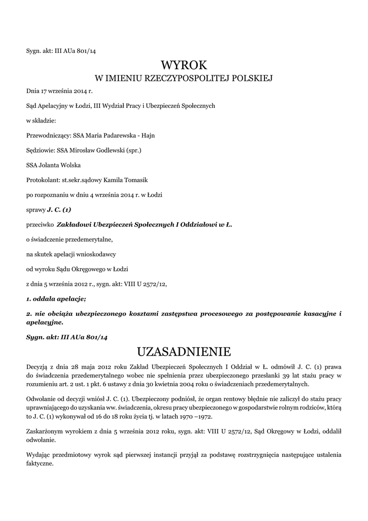 Sygn. akt: III AUa 801/14 WYROK W IMIENIU RZECZYPOSPOLITEJ POLSKIEJ Dnia 17 września 2014 r. Sąd Apelacyjny w Łodzi, III Wydział Pracy i Ubezpieczeń Społecznych w składzie: Przewodniczący: SSA Maria Padarewska - Hajn Sędziowie: SSA Mirosław Godlewski (spr.) SSA Jolanta Wolska Protokolant: st.sekr.sądowy Kamila Tomasik po rozpoznaniu w dniu 4 września 2014 r. w Łodzi sprawy J. C. (1) przeciwko Zakładowi Ubezpieczeń Społecznych I Oddziałowi w Ł. o świadczenie przedemerytalne, na skutek apelacji wnioskodawcy od wyroku Sądu Okręgowego w Łodzi z dnia 5 września 2012 r., sygn. akt: VIII U 2572/12, 1. oddala apelacje; 2. nie obciąża ubezpieczonego kosztami zastępstwa procesowego za postępowanie kasacyjne i apelacyjne. Sygn. akt: III AUa 801/14 UZASADNIENIE Decyzją z dnia 28 maja 2012 roku Zakład Ubezpieczeń Społecznych I Oddział w Ł. odmówił J. C. (1) prawa do świadczenia przedemerytalnego wobec nie spełnienia przez ubezpieczonego przesłanki 39 lat stażu pracy w rozumieniu art. 2 ust. 1 pkt. 6 ustawy z dnia 30 kwietnia 2004 roku o świadczeniach przedemerytalnych. Odwołanie od decyzji wniósł J. C. (1). Ubezpieczony podniósł, że organ rentowy błędnie nie zaliczył do stażu pracy uprawniającego do uzyskania ww. świadczenia, okresu pracy ubezpieczonego w gospodarstwie rolnym rodziców, którą to J. C. (1) wykonywał od 16 do 18 roku życia tj. w latach 1970 –1972. Zaskarżonym wyrokiem z dnia 5 września 2012 roku, sygn. akt: VIII U 2572/12, Sąd Okręgowy w Łodzi, oddalił odwołanie. Wydając przedmiotowy wyrok sąd pierwszej instancji przyjął za podstawę rozstrzygnięcia następujące ustalenia faktyczne. J. C. (1) urodził się (...) w K., gdzie zamieszkiwał do 23 lutego 1979 roku wspólnie z rodzicami oraz rodzeństwem (bratem i siostrą). W okresie od 1969 roku do 1972 roku ubezpieczony uczęszczał do (...) Szkoły Zawodowej w S. – około 30 kilometrów od K.. Do szkoły J. C. (1) dojeżdżał autobusem. Ubezpieczony wyjeżdżał z K. o godzinie 5.30 lub 6.30. Zajęcia rozpoczynały się od godziny 8.00 i trwały do godziny 13.00 – 14.00. Ubezpieczony wracał do domu około godziny 15.30 – 16.00. Wówczas to odrabiał lekcje, uczył się, a następnie pomagał w gospodarstwie rolnym prowadzonym przez rodziców, położonym w K., zajmującym obszar 10,32 ha. J. C. (1) pomagał przy inwentarzu żywym, w wakacje pracował przy żniwach, zimą doglądał zwierząt. W okresie od 2 listopada 2005 roku do 31 sierpnia 2011 roku ubezpieczony pracował w Wyższej Szkole (...) w Ł. w charakterze pracownika gospodarczego. Rozwiązanie umowy o pracę nastąpiło z powodu likwidacji zakładu pracy. W dniu 24 kwietnia 2012 roku J. C. (1) złożył wniosek o przyznanie świadczenia przedemerytalnego. W świetle tak poczynionych ustaleń faktycznych Sąd Okręgowy doszedł do przekonania, że odwołanie J. C. (1) nie zasługuje na uwzględnienie. Zdaniem Sądu I instancji ubezpieczony nie spełnił przesłanki stażu pracy w wymiarze 39 lat, udowadniając dostatecznie jedynie 38 lat 9 miesięcy i 12 dni okresów składkowych i nieskładkowych, w tym 38 lat, 6 miesięcy i 11 dni okresów składkowych oraz 3 miesiące i 1 dzień okresów nieskładkowych. J. C. (1) w okresie od 17 maja 1970 roku do 7 września 1972 roku tj. od ukończenia 16 lat, nie mógł wykonywać pracy w gospodarstwie rolnym swoich rodziców w sposób stały i w wymiarze, co najmniej 4 godzin dziennie. Ubezpieczony uczęszczał wówczas do (...) Szkoły Zawodowej w S.. Z uwagi m.in. na plan zajęć szkolnych, konieczność codziennego dojazdu do szkoły (ok. 30 km) oraz inne obowiązki ucznia, nie sposób przyjąć by praca wykonywana przez J. C. (1) mogła wynosić przynajmniej ½ pełnego wymiaru czasu pracy. Sąd I instancji przyjął, iż czynności wykonywane przez ubezpieczonego w gospodarstwie rolnym rodziców miały wyłącznie charakter doraźnej pomocy rodzinnej w wykonywaniu typowych obowiązków domowych, nie zaś pracy stałej, świadczonej w wymiarze, co najmniej 4 godzin każdego dnia. W związku z powyższym, Sąd Okręgowy na podstawie art. 477 14 § 1 k.p.c. oddalił odwołanie. Powyższe orzeczenie zaskarżył apelacją w całości J. C. (1) zarzucając mu naruszenie przepisów postępowania, które miało istotny wpływ na wynik sprawy tj.: 1. art. 379 pkt 5 k.p.c. w zw. z art. 212 § l i 2 k.p.c. i art. 5 k.p.c. poprzez zaniechanie udzielenia skarżącemu niezbędnych pouczeń tak w zakresie uzupełnienia twierdzeń oraz dowodów jak i zasadności ustanowienia pełnomocnika procesowego, mimo iż zachodziły ku temu dostateczne przesłanki, bowiem jednoznacznie z akt postępowania wynika, iż okres wymagany dla objęcia skarżącego uprawnieniami do świadczenia przedemerytalnego wynosił niespełna trzy miesiące, zaś materiał dowodowy zgromadzony w sprawie potwierdzał fakt świadczenia w latach 1970 – 1972 pracy w gospodarstwie rolnym przez skarżącego, lecz mimo to okoliczność ta nie została dostatecznie wykazana na skutek niewiedzy skarżącego, co do obowiązku powołania wszelkich dowodów na etapie postępowania przed sądem pierwszej instancji; 2. art. 227 k.p.c. i art. 233 § l i 2 k.p.c. poprzez zaniechanie wszechstronnego rozważenia materiału dowodowego, jaki w sprawie występował, a mianowicie pominięcia poza dokonaną oceną, faktu iż skarżący w latach 1970 – 1972, ukończywszy szesnasty rok życia (17 maja 1970 roku), pracował w gospodarstwie rolnym w trakcie roku szkolnego, ale również w trakcie wakacji letnich od czerwca do końca sierpnia każdego roku, co winno zostać poddane ocenie przez sąd orzekający, tym bardziej, że wspominana okoliczność została potwierdzona zeznaniami J. C., Z. G., A. Ż. i świadczy o tym, iż skarżący wyczerpał przesłanki stażu pracy w rozumieniu art. 2 ust l pkt 6 ustawy o świadczeniach przedemerytalnych; 3. art. 328 § l k.p.c. poprzez zaniechanie wskazania w uzasadnieniu zask