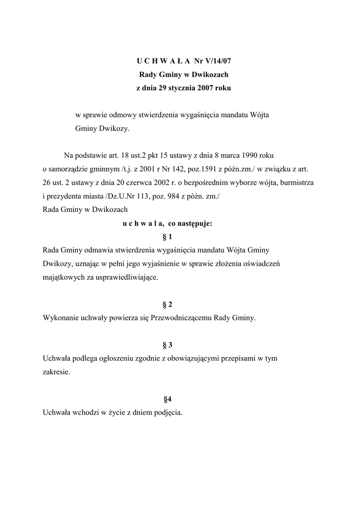 U C H W A Ł A Nr V/14/07 Rady Gminy w Dwikozach z dnia 29 stycznia 2007 roku w sprawie odmowy stwierdzenia wygaśnięcia mandatu Wójta Gminy Dwikozy. Na podstawie art. 18 ust.2 pkt 15 ustawy z dnia 8 marca 1990 roku o samorządzie gminnym /t.j. z 2001 r Nr 142, poz.1591 z późn.zm./ w związku z art. 26 ust. 2 ustawy z dnia 20 czerwca 2002 r. o bezpośrednim wyborze wójta, burmistrza i prezydenta miasta /Dz.U.Nr 113, poz. 984 z późn. zm./ Rada Gminy w Dwikozach u c h w a l a, co następuje: §1 Rada Gminy odmawia stwierdzenia wygaśnięcia mandatu Wójta Gminy Dwikozy, uznając w pełni jego wyjaśnienie w sprawie złoŜenia oświadczeń majątkowych za usprawiedliwiające. §2 Wykonanie uchwały powierza się Przewodniczącemu Rady Gminy. §3 Uchwała podlega ogłoszeniu zgodnie z obowiązującymi przepisami w tym zakresie. §4 Uchwała wchodzi w Ŝycie z dniem podjęcia. Dwikozy 2007.02.01 Znak: Or.II-OG-0150/3/07 WOJEWODA ŚWIĘTOKRZYSKI W KIELCACH W załączeniu przesyłam Uchwałę Nr V/14/07 Rady Gminy w Dwikozach z dnia 29 stycznia 2007 roku w sprawie odmowy stwierdzenia wygaśnięcia mandatu Wójta Gminy Dwikozy. Z powaŜaniem Zał.:Uchwała M.M.