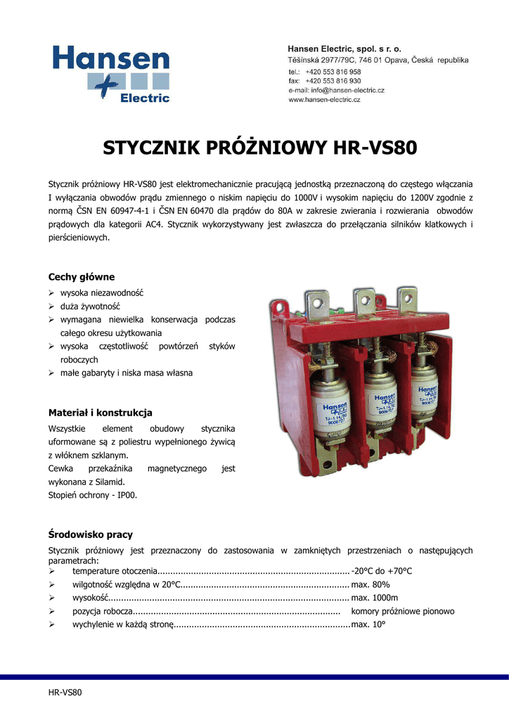 stycznik próżniowy hr-vs80 - Hansen Electric Polska Sp. z oo