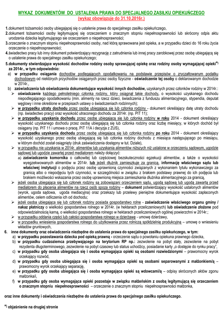 WYKAZ DOKUMENTÓW DO USTALENIA PRAWA DO SPECJALNEGO ZASIŁKU OPIEKUŃCZEGO (wykaz obowiązuje do 31.10.2016r.) 1. dokument tożsamości osoby ubiegającej się o ustalenie prawa do specjalnego zasiłku opiekuńczego, 2. dokument tożsamości osoby legitymującej się orzeczeniem o znacznym stopniu niepełnosprawności lub skrócony odpis aktu urodzenia dziecka legitymującego sie orzeczeniem o niepełnosprawności; 3. orzeczenie o znacznym stopniu niepełnosprawności osoby, nad którą sprawowana jest opieka, a w przypadku dzieci do 16 roku życia orzeczenie o niepełnosprawności; 4. świadectwo pracy lub inny dokument potwierdzający rezygnację z zatrudnienia lub innej pracy zarobkowej przez osobę ubiegającą się o ustalenie prawa do specjalnego zasiłku opiekuńczego; 5. dokumenty stwierdzające wysokość dochodów rodziny osoby sprawującej opiekę oraz rodziny osoby wymagającej opieki*) za 2014r., w tym odpowiednio: a) w przypadku osiągania dochodów podlegających opodatkowaniu na podstawie przepisów o zryczałtowanym podatku dochodowym od niektórych przychodów osiąganych przez osoby fizyczne - oświadczenie tej osoby o deklarowanym dochodzie w 2014r., b) zaświadczenia lub oświadczenia dokumentujące wysokość innych dochodów, uzyskanych przez członków rodziny w 2014r.: oświadczenie każdego pełnoletniego członka rodziny, który osiągnął takie dochody, o wysokości uzyskanego dochodu niepodlegającego opodatkowaniu (min. alimenty na rzecz dzieci, świadczenia z funduszu alimentacyjnego, stypendia, deputat węglowy i inne określone w przepisach ustawy o świadczeniach rodzinnych); w przypadku utraty dochodu przez osobę ubiegającą się lub członka rodziny - dokument określający datę utraty dochodu (np. świadectwo pracy) oraz wysokość utraconego dochodu za 2014r. (np. PIT 11); w przypadku uzyskania dochodu przez osobę ubiegającą się lub członka rodziny w roku 2014 - dokument określający wysokość uzyskanego dochodu przez osobę ubiegającą się lub członka rodziny oraz liczbę miesięcy, w których dochód był osiągany (np. PIT 11 i umowa o pracę, PIT 11A i decyzja z ZUS), w przypadku uzyskania dochodu przez osobę ubiegającą się lub członka rodziny po roku 2014 - dokument określający wysokość uzyskanego przez osobę ubiegającą się lub członka rodziny dochodu z miesiąca następującego po miesiącu, w którym dochód został osiągnięty (druk zaświadczenia dostępny w tut. Dziale), w przypadku nie uzyskania w 2014r. alimentów lub uzyskania alimentów niższych niż ustalone w orzeczeniu sądowym, ugodzie sądowej lub ugodzie zawartej przed mediatorem należy dołączyć: a) zaświadczenie komornika o całkowitej lub częściowej bezskuteczności egzekucji alimentów, a także o wysokości wyegzekwowanych alimentów w 2014r. lub jeżeli dłużnik zamieszkuje za granicą, informację właściwego sądu lub właściwej instytucji o podjęciu przez osobę uprawnioną czynności związanych z wykonaniem tytułu wykonawczego za granicą albo o niepodjęciu tych czynności, w szczególności w związku z brakiem podstawy prawnej do ich podjęcia lub brakiem możliwości wskazania przez osobę uprawnioną miejsca zamieszkania dłużnika alimentacyjnego za granicą, jeżeli osoba ubiegająca się lub członek rodziny są zobowiązani orzeczeniem sądu, ugodą sądową lub ugodą zawartą przed mediatorem do płacenia alimentów na rzecz osób spoza rodziny – dokument potwierdzający wysokość ustalonych alimentów (wyrok, ugoda sądowa, ugoda mediacyjna) oraz przekazy lub przelewy pieniężne dokumentujące wysokość zapłaconych alimentów, celem odliczenia ich od dochodu; jeżeli osoba ubiegająca się lub członek rodziny posiada gospodarstwo rolne - zaświadczenie właściwego organu gminy / nakaz płatniczy o wielkości gospodarstwa rolnego w 2014r. (w hektarach przeliczeniowych) lub oświadczenie złożone pod odpowiedzialnością karną, o wielkości gospodarstwa rolnego w hektarach przeliczeniowych ogólnej powierzchni w 2014r.; w przypadku oddania części lub całości gospodarstwa rolnego w dzierżawę - umowę dzierżawy, w przypadku wniesienia gospodarstwa rolnego do użytkowania przez rolniczą spółdzielnię produkcyjną – umowę o wniesieniu wkładów gruntowych, 6. inne dokumenty oraz oświadczenia niezbędne do ustalenia prawa do specjalnego zasiłku opiekuńczego, w tym: a) w przypadku pozostawania dziecka pod opieką prawną - orzeczenie sądu o powołaniu opiekuna prawnego dziecka, b) w przypadku cudzoziemca przebywającego na terytorium RP np.: zezwolenie na pobyt stały, zezwolenie na pobyt rezydenta długoterminowego, zezwolenie na pobyt czasowy lub status uchodźcy, posiadanie karty „o dostępie do rynku pracy”, c) w przypadku gdy osoba ubiegająca się i osoba wymagająca opieki są osobami rozwiedzionymi – prawomocny wyrok orzekający rozwód, d) w przypadku gdy osoba ubiegająca się i osoba wymagająca opieki są osobami separowanymi z małżonkiem/ą – prawomocny wyrok orzekający separację, e) w przypadku gdy osoba ubiegająca się i osoba wymagająca opieki są wdowcami/ą – odpisy skróconych aktów zgonu małżonka/i, f) w przypadku gdy osoba wymagająca opieki pozostaje w związku małżeńskim z osobą legitymującą się orzeczeniem o znacznym stopniu niepełnosprawności – orzeczenie o znacznym stopniu niepełnosprawności małżonka, oraz inne dokumenty i oświadczenia niezbędne do ustalenia prawa do specjalnego zasiłku opiekuńczego. *) objaśnienie na drugiej stronie *) za dochód rodziny osoby wymagającej opieki, uważa się dochód następujących członków rodziny: 1. w przypadku gdy osoba wymagająca opieki jest małoletnia: a) osoby wymagającej opieki, b) rodziców osoby wymagającej opieki, c) małżonka rodzica osoby wymagającej opieki, d) osoby, z którą rodzic osoby wymagającej opieki wychowuje wspólne dziecko, e) pozostających na utrzymaniu osób, o k