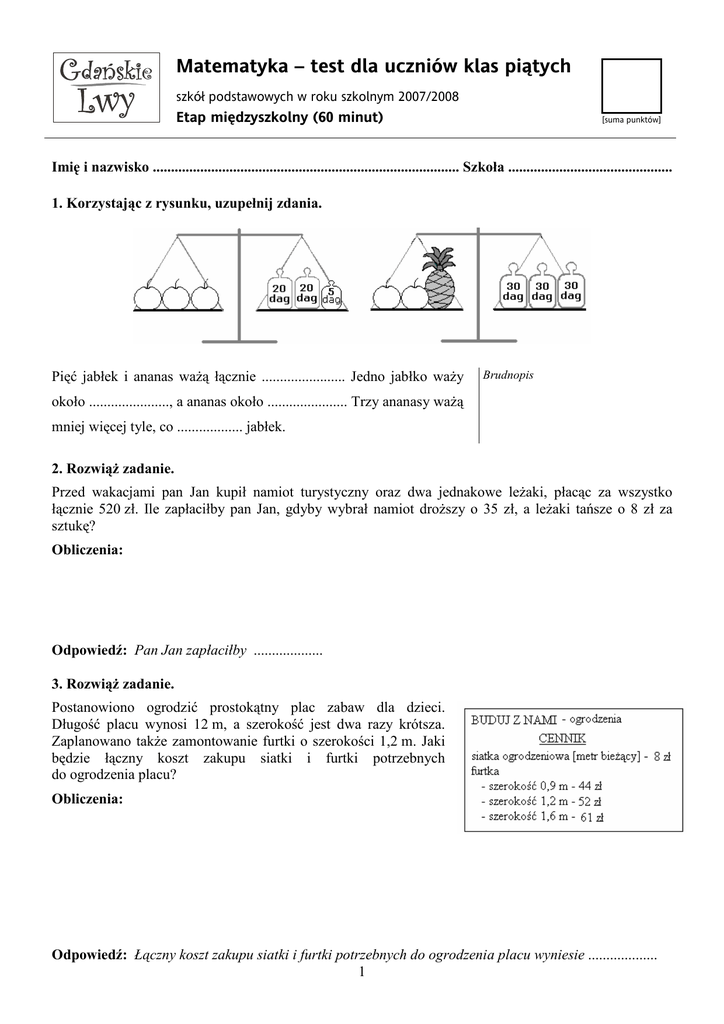 Matematyka – test dla uczniów klas piątych szkół podstawowych w roku szkolnym 2007/2008 Etap międzyszkolny (60 minut) [suma punktów] Imię i nazwisko .................................................................................... Szkoła ............................................. 1. Korzystając z rysunku, uzupełnij zdania. Pięć jabłek i ananas waŜą łącznie ....................... Jedno jabłko waŜy Brudnopis około ......................, a ananas około ...................... Trzy ananasy waŜą mniej więcej tyle, co .................. jabłek. 2. RozwiąŜ zadanie. Przed wakacjami pan Jan kupił namiot turystyczny oraz dwa jednakowe leŜaki, płacąc za wszystko łącznie 520 zł. Ile zapłaciłby pan Jan, gdyby wybrał namiot droŜszy o 35 zł, a leŜaki tańsze o 8 zł za sztukę? Obliczenia: Odpowiedź: Pan Jan zapłaciłby ................... 3. RozwiąŜ zadanie. Postanowiono ogrodzić prostokątny plac zabaw dla dzieci. Długość placu wynosi 12 m, a szerokość jest dwa razy krótsza. Zaplanowano takŜe zamontowanie furtki o szerokości 1,2 m. Jaki będzie łączny koszt zakupu siatki i furtki potrzebnych do ogrodzenia placu? Obliczenia: Odpowiedź: Łączny koszt zakupu siatki i furtki potrzebnych do ogrodzenia placu wyniesie ................... 1 W zadaniach od 4. do 12. podkreśl poprawne odpowiedzi. 4. Kąt γ na rysunku ma miarę 1200. Miara kąta α jest 2 razy większa od miary kąta β. Zatem a) b) c) d) α = 300 , β = 600 α = 600 , β = 300. α = 200 , β = 400. α = 400 , β = 200. 5. Jeden z kątów przyległych ma miarę 270. Miara drugiego kąta to a) 270 c) 1530 b) 730 d) 1630. 6. Bok kwadratu o polu 36 cm2 ma długość a) 4 cm. c) 8 cm. b) 6 cm. d) 9 cm. 7. Pan Stanisław kupił działkę budowlaną o powierzchni 0,2 ha. Pole działki wyraŜone w m2 to a) 20. c) 2000. b) 200. d) 20 000. 8. Cztery plany mają jednakowe wymiary, lecz kaŜdy z nich sporządzono w innej skali. Największy obszar terenu pokazano na planie wykonanym w skali a) 1 : 7 000. c) 1 : 5 000. b) 1 : 6 000. d) 1 : 4 000. 9. Na obszarze prostokątnego trawnika o wymiarach 3 m i 5 m postanowiono załoŜyć okrągły klomb z kwiatami. Największa moŜliwa długość promienia tego klombu to a) 1,5 m. c) 3 m. b) 2,5 m. d) 5 m. 10. Ile jest liczb naturalnych dwucyfrowych, w zapisie których występuje cyfra 5? a) 9. c) 19. b) 18. d) Inna odpowiedź. 11. Rowerzysta przejechał 3 km 60 m, czyli a) 3,6 km. c) 3,006 km b) 3, 06 km. d) 3,0006 km. 12. Spójrz na rysunek obok. Do 2 kg cukierków brakuje jeszcze a) 70 g. c) 300 g. b) 97 g. d) 970 g. 2 Brudnopis 13. RozwiąŜ zadanie. Na rysunku obok przedstawiono schematycznie trasę wyścigu kolarskiego. Długość tej trasy wynosi 40 km, przy czym z punktu A do punktu C kolarze mają do pokonania odległość równą 19 km, a z punktu B do punktu D – 16 km. Jaką długość ma fragment trasy między punktami B i C? Obliczenia: Odpowiedź: Fragment trasy między punktami B i C ma długość................... 14. RozwiąŜ zadanie. 3 KsiąŜka, którą czyta Ola, ma 480 stron. W ciągu pierwszych trzech dni Ola przeczytała 8 liczby stron tej ksiąŜki, a czwartego dnia – 72 strony. Ile stron ksiąŜki pozostało Oli do przeczytania? Obliczenia: Odpowiedź: Oli ............................................................................................................... 15. Korzystając z rysunku rozwiąŜ zadanie. Pan Jacek przeznaczył na trawnik teren w kształcie prostokąta o wymiarach 9 m i 7,5 m. Trawa sprzedawana jest w opakowaniach przedstawionych na rysunku. Ile opakowań Trawy Dekoracyjnej powinien kupić pan Jacek, aby załoŜyć trawnik? Obliczenia: Odpowiedź: Pan Jacek powinien kupić ........................................... Trawy Dekoracyjnej. 3 16. RozwiąŜ zadanie. Pusty pojemnik napełniono wodą do połowy jego objętości. Następnie dolano jeszcze połowę ilości wody nalanej wcześniej. Wówczas do pełna brakowało 9 litrów wody. Jaka jest objętość pojemnika? Obliczenia: Odpowiedź: Objętość pojemnika to ................................. W zadaniach od 17. do 21. podkreśl poprawne odpowiedzi. 17. Cyfrą jedności liczby 92008 jest a) 1. c) 7. Brudnopis b) 3. d) 9. 18. Ze szkoły do domu Adam dojeŜdŜa autobusem. Autobusy odjeŜdŜają o 13:05, 13:24, 13:36 i 13:53. Wchodząc na przystanek, Adam odczytał godzinę na zegarku (patrz rysunek). Zegarek Adama spóźnia się o 4 minuty. Według rozkładu najbliŜszy autobus powinien przyjechać za a) b) c) d) 1 minutę. 5 minut. 9 minut. 11 minut. 19. Asia urodziła się 7 grudnia 1997 roku. Julia jest o 2 lata i 15 dni starsza od Asi. Data urodzin Julii to a) 22 listopada 1995 roku. c) 23 listopada 1995 roku. b) 22 grudnia 1998 roku. d) inna niŜ podane. 20. Zuzia znalazła w bibliotece ksiąŜkę, w której brakowało pewnej liczby kartek. Kiedy ją otworzyła, z lewej strony zobaczyła numer 14, z prawej zaś numer 35. Pomiędzy tymi stronami brakowało a) 9 kartek. c) 20 kartek. b) 10 kartek. d) 21 kartek. 21. Marta i jej siostra Ola chcą kupić po jednej takiej samej piłce. Marcie brakuje 5 zł, a Oli 8 zł. Gdyby dziewczynki chciały się złoŜyć i kupić wspólnie jedną piłkę, to zostałoby im jeszcze 2 zł. Piłka kosztuje a) 13 zł. c) 17 zł. b) 15 zł. d) 19 zł. 4 Korzystając z diagramu, podkreśl poprawne odpowiedzi w zadaniach od 22. do 26. Na diagramie poniŜej przedstawiono wyniki ankiety przeprowadzonej wśród uczniów klas piątych pewnej szkoły podstawowej. Ankieta dotyczyła ulubionych form spędzania wolnego czasu. KaŜdy z ankietowanych wskazał dokładnie dwie formy. 30 28 26 24 22 liczba uczniów 20 18 16 dziewczynki 14 chłopcy 12 10 8 6 4 2 0 czytanie ksiąŜek oglądanie telewizji korzystanie z komputera uprawianie sportu słuchanie muzyki inne 22. Najbardziej popularną formą spędzania czasu wolnego wśród dziewcząt jest a) korzystanie z komputera. c) oglądanie telewizji. b) czytanie ksiąŜek. d) 