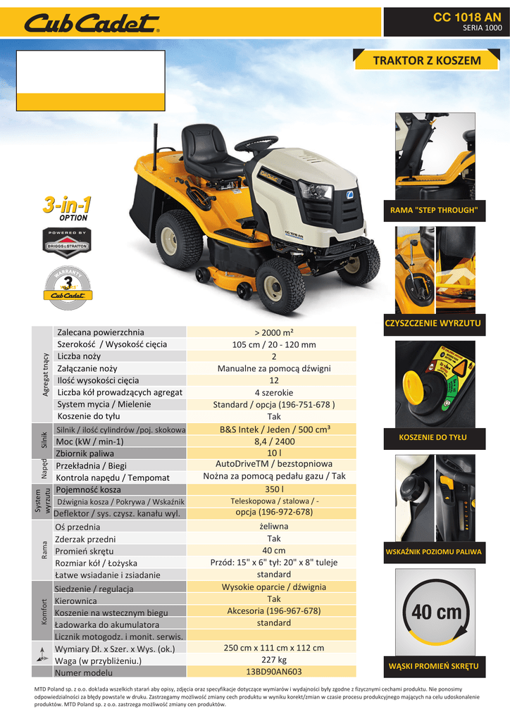 CC 1018 AN SERIA 1000 TRAKTOR Z KOSZEM *Manufacturin g gu ara nty of MT D ŐƌĞŐĂƚƚŶČĐLJ ^ŝůŶŝŬ Napħd ^LJƐƚĞŵ ǁLJƌnjƵƚƵ Rama Komfort ary performanc lement e, va lid o supp nly ited lim thr G, ou gh sA ct re du * det.eu c.cubca ://b2 ttps nh no tio ra st gi Pr o RAMA "STEP THROUGH" ĂůĞĐĂŶĂƉŽǁŝĞƌnjĐŚŶŝĂ ^njĞƌŽŬŽƑđͬtLJƐŽŬŽƑđĐŝħĐŝĂ >ŝĐnjďĂŶŽǏLJ ĂųČĐnjĂŶŝĞŶŽǏLJ /ůŽƑđǁLJƐŽŬŽƑĐŝĐŝħĐŝĂ >ŝĐnjďĂŬſųƉƌŽǁĂĚnjČĐLJĐŚĂŐƌĞŐĂƚ ^LJƐƚĞŵŵLJĐŝĂͬDŝĞůĞŶŝĞ <ŽƐnjĞŶŝĞĚŽƚLJųƵ Silnik / iloƑđ cylindrów /poj. skokowa DŽĐ;ŬtͬŵŝŶͲϭͿ ďŝŽƌŶŝŬƉĂůŝǁĂ WƌnjĞŬųĂĚŶŝĂͬŝĞŐŝ <ŽŶƚƌŽůĂŶĂƉħĚƵͬdĞŵƉŽŵĂƚ WŽũĞŵŶŽƑđŬŽƐnjĂ DǍwignia kosza / Pokrywa / WskaǍnik Deflektor / sys. czysz. kanaųu wyl. OƑ przednia Zderzak przedni Promieŷ skrħtu Rozmiar kóų / BoǏyska Batwe wsiadanie i zsiadanie Siedzenie / regulacja Kierownica Koszenie na wstecznym biegu Badowarka do akumulatora Licznik motogodz. i monit. serwis. Wymiary Dų. x Szer. x Wys. (ok.) Waga (w przybliǏeniu.) Numer modelu > 2000 mϸ 105 cm / 20 - 120 mm 2 Manualne za pomocČ dǍwigni 12 4 szerokie Standard / opcja (196-751-678 ) Tak B&S Intek / Jeden / 500 cmϹ 8,4 / 2400 10 l AutoDriveTM / bezstopniowa NoǏna za pomocČ pedaųu gazu / Tak 350 l z^E/tzZhdh <K^E/KdzBh Teleskopowa / stalowa / - opcja (196-972-678) Ǐeliwna Tak 40 cm Przód: 15" x 6" tyų: 20" x 8" tuleje standard Wysokie oparcie / dǍwignia Tak Akcesoria (196-967-678) standard 250 cm x 111 cm x 112 cm 227 kg 13BD90AN603 WSKANIK POZIOMU PALIWA WSKI PROMIEF SKR%TU MTD Poland sp. z o.o. dok!ada wszelkich staraŷ aby opisy, zdjħcia oraz specyfikacje dotyczČce wymiarów i wydajnoƑci byųy zgodne z fizycznymi cechami produktu. Nie ponosimy odpowiedzialnoƑci za bųħdy powsta!e w druku. Zastrzegamy moǏliwoƑđ zmiany cech produktu w wyniku korekt/zmian w czasie procesu produkcyjnego majČcych na celu udoskonalenie produktów. MTD Poland sp. z o.o. zastrzega moǏliwoƑđ zmiany cen produktów.