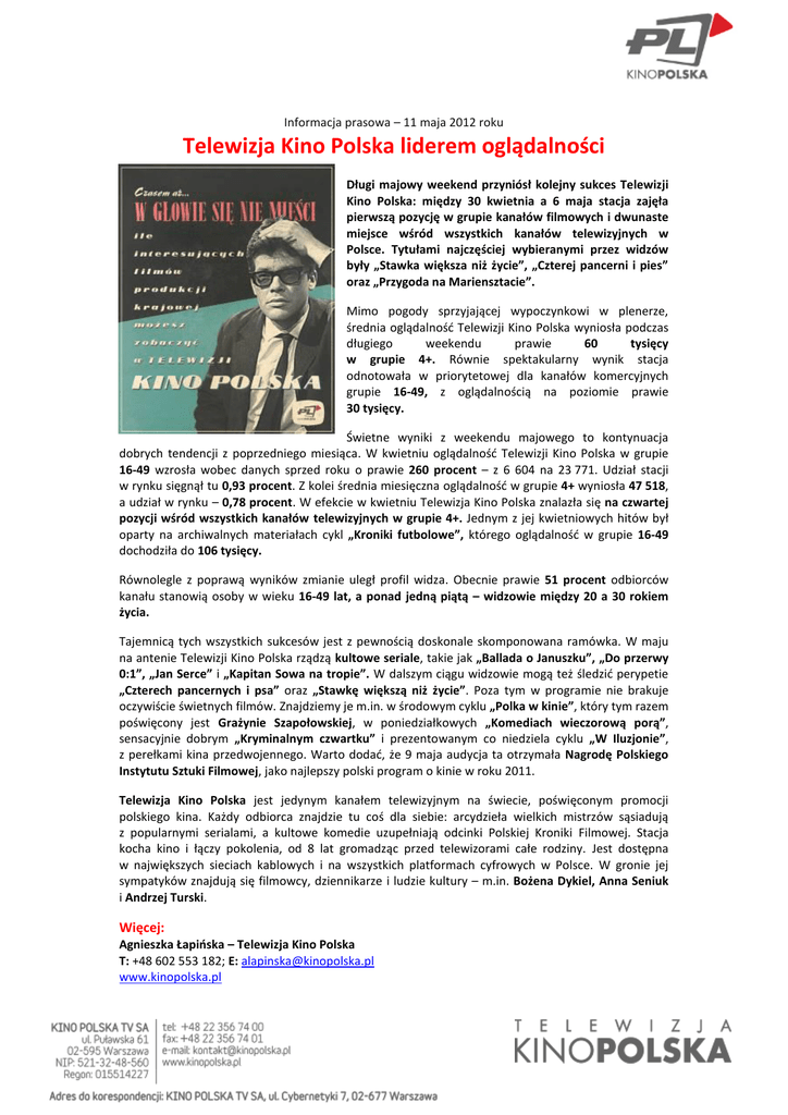 Informacja prasowa – 11 maja 2012 roku Telewizja Kino Polska liderem oglądalności Długi majowy weekend przyniósł kolejny sukces Telewizji Kino Polska: między 30 kwietnia a 6 maja stacja zajęła pierwszą pozycję w grupie kanałów filmowych i dwunaste miejsce wśród wszystkich kanałów telewizyjnych w Polsce. Tytułami najczęściej wybieranymi przez widzów były „Stawka większa niż życie”, „Czterej pancerni i pies” oraz „Przygoda na Mariensztacie”. Mimo pogody sprzyjającej wypoczynkowi w plenerze, średnia oglądalność Telewizji Kino Polska wyniosła podczas długiego weekendu prawie 60 tysięcy w grupie 4+. Równie spektakularny wynik stacja odnotowała w priorytetowej dla kanałów komercyjnych grupie 16-49, z oglądalnością na poziomie prawie 30 tysięcy. Świetne wyniki z weekendu majowego to kontynuacja dobrych tendencji z poprzedniego miesiąca. W kwietniu oglądalność Telewizji Kino Polska w grupie 16-49 wzrosła wobec danych sprzed roku o prawie 260 procent – z 6 604 na 23 771. Udział stacji w rynku sięgnął tu 0,93 procent. Z kolei średnia miesięczna oglądalność w grupie 4+ wyniosła 47 518, a udział w rynku – 0,78 procent. W efekcie w kwietniu Telewizja Kino Polska znalazła się na czwartej pozycji wśród wszystkich kanałów telewizyjnych w grupie 4+. Jednym z jej kwietniowych hitów był oparty na archiwalnych materiałach cykl „Kroniki futbolowe”, którego oglądalność w grupie 16-49 dochodziła do 106 tysięcy. Równolegle z poprawą wyników zmianie uległ profil widza. Obecnie prawie 51 procent odbiorców kanału stanowią osoby w wieku 16-49 lat, a ponad jedną piątą – widzowie między 20 a 30 rokiem życia. Tajemnicą tych wszystkich sukcesów jest z pewnością doskonale skomponowana ramówka. W maju na antenie Telewizji Kino Polska rządzą kultowe seriale, takie jak „Ballada o Januszku”, „Do przerwy 0:1”, „Jan Serce” i „Kapitan Sowa na tropie”. W dalszym ciągu widzowie mogą też śledzić perypetie „Czterech pancernych i psa” oraz „Stawkę większą niż życie”. Poza tym w programie nie brakuje oczywiście świetnych filmów. Znajdziemy je m.in. w środowym cyklu „Polka w kinie”, który tym razem poświęcony jest Grażynie Szapołowskiej, w poniedziałkowych „Komediach wieczorową porą”, sensacyjnie dobrym „Kryminalnym czwartku” i prezentowanym co niedziela cyklu „W Iluzjonie”, z perełkami kina przedwojennego. Warto dodać, że 9 maja audycja ta otrzymała Nagrodę Polskiego Instytutu Sztuki Filmowej, jako najlepszy polski program o kinie w roku 2011. Telewizja Kino Polska jest jedynym kanałem telewizyjnym na świecie, poświęconym promocji polskiego kina. Każdy odbiorca znajdzie tu coś dla siebie: arcydzieła wielkich mistrzów sąsiadują z popularnymi serialami, a kultowe komedie uzupełniają odcinki Polskiej Kroniki Filmowej. Stacja kocha kino i łączy pokolenia, od 8 lat gromadząc przed telewizorami całe rodziny. Jest dostępna w największych sieciach kablowych i na wszystkich platformach cyfrowych w Polsce. W gronie jej sympatyków znajdują się filmowcy, dziennikarze i ludzie kultury – m.in. Bożena Dykiel, Anna Seniuk i Andrzej Turski. Więcej: Agnieszka Łapińska – Telewizja Kino Polska T: +48 602 553 182; E: [email protected] www.kinopolska.pl