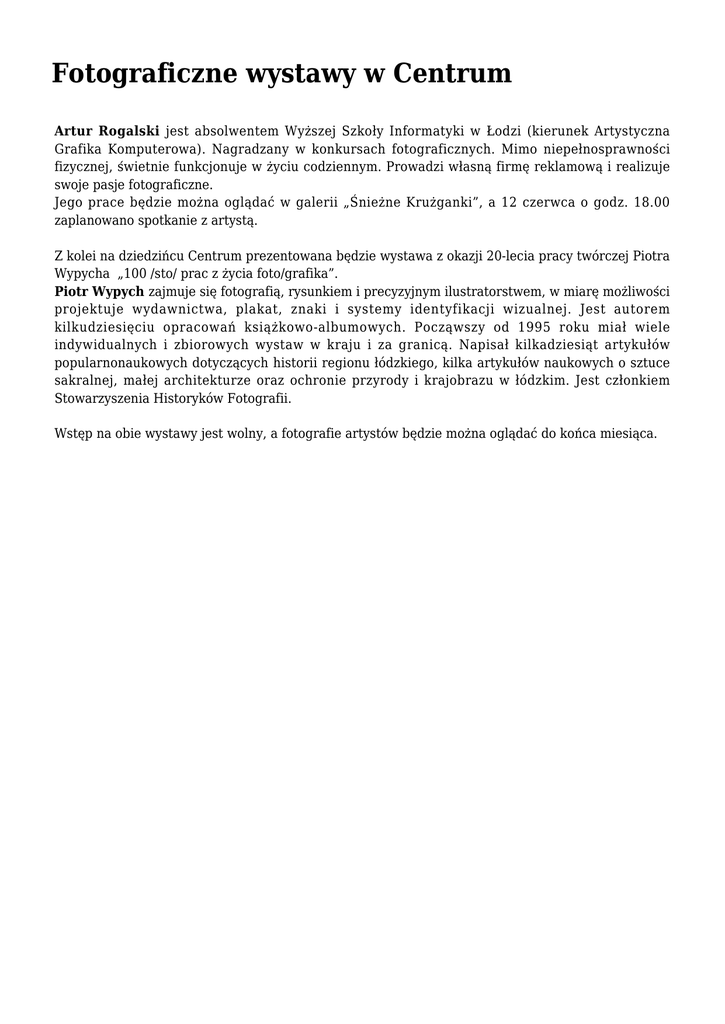 Fotograficzne wystawy w Centrum Artur Rogalski jest absolwentem Wyższej Szkoły Informatyki w Łodzi (kierunek Artystyczna Grafika Komputerowa). Nagradzany w konkursach fotograficznych. Mimo niepełnosprawności fizycznej, świetnie funkcjonuje w życiu codziennym. Prowadzi własną firmę reklamową i realizuje swoje pasje fotograficzne. Jego prace będzie można oglądać w galerii „Śnieżne Krużganki”, a 12 czerwca o godz. 18.00 zaplanowano spotkanie z artystą. Z kolei na dziedzińcu Centrum prezentowana będzie wystawa z okazji 20-lecia pracy twórczej Piotra Wypycha „100 /sto/ prac z życia foto/grafika”. Piotr Wypych zajmuje się fotografią, rysunkiem i precyzyjnym ilustratorstwem, w miarę możliwości projektuje wydawnictwa, plakat, znaki i systemy identyfikacji wizualnej. Jest autorem kilkudziesięciu opracowań książkowo-albumowych. Począwszy od 1995 roku miał wiele indywidualnych i zbiorowych wystaw w kraju i za granicą. Napisał kilkadziesiąt artykułów popularnonaukowych dotyczących historii regionu łódzkiego, kilka artykułów naukowych o sztuce sakralnej, małej architekturze oraz ochronie przyrody i krajobrazu w łódzkim. Jest członkiem Stowarzyszenia Historyków Fotografii. Wstęp na obie wystawy jest wolny, a fotografie artystów będzie można oglądać do końca miesiąca.