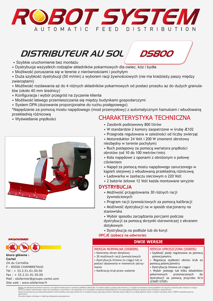 DS800 DISTRIBUTEUR AU SOL • Szybkie uruchomienie bez montażu • Dystrybucja wszystkich rodzajów składników pokarmowych dla owiec, kóz i bydła • Możliwość poruszania się w terenie z nierównościami i pochyłym • Duża szybkość dystrybucji (50 m/min) z wyborem racji żywnościowych (nie ma kradzieży paszy między zwierzętami) • Możliwość rozdawania aż do 4 różnych składników pokarmowych od postaci proszku az do dużych granulatów (około 40 mm średnicy) • Konfiguracja i wybór przegród na życzenie klienta • Możliwość łatwego przemieszczania się między budynkami gospodarczymi • System DPA (dozowanie proporcjonalne do ruchu postępowego) *Napędzanie za pomocą mostu napędowego (most przemysłowy) z automatycznym hamulcem i wbudowaną przekładnią różnicową CHARAKTERYSTYKA TECHNICZNA • Wyświetlanie prędkości • Zasobnik podstawowy 800 litrów • W standardzie 2 komory zaopatrzone w śrubę Æ102 • Przegroda regulowana w zależności od liczby zwierząt • Motoreduktor 24 Volt i 200 W (moment obrotowy niezbędny w terenie pochyłym) • Ruch postępowy za pomocą wariatora prędkości obrotów (od 10 do 100 metrów/min) • Koła napędowe z oponami z obniżonym o połowę ciśnieniem • Napęd za pomocą mostu napędowego zanurzonego w kąpieli olejowej z wbudowaną przekładnią różnicową • Ładowarka w zasilaczu sieciowym o 220 Volt • 2 baterie żelowe 12 Volt każda montowane seryjnie DYSTRYBUCJA • Możliwość przygotowania 30 różnych racji żywnościowych • Program racji żywnościowych za pomocą kalibracji • Możliwość dystrybucji na w sposób stacjonarny na stanowiska • Wybór sposobu zarządzania porcjami podczas dystrybucji za pomocą skrzynki sterowniczej z ekranem dotykowym • Dystrybucja na podłoże lub do koryt OPCJE (zobacz na odwrocie) DWIE WERSJE biuro główne : Cartel ZA du Cormélia F - 85500 CHAMBRETAUD Tél : + 33.2.51.61.50.50 Fax : + 33.2.51.91.50.00 Mail : [email protected] Site web : www.silofarmer.fr WERSJA NORMALNA (DS800N) WERSJA UPROSZCZONA (DS800S) • Kontrolny ekran dotykowy • 30 możliwych racji żywnościowych • Dystrybucja liniowa (w ciągu) lub w postaci dozowania w momencie zatrzymania • Kalibracja śrub przez ważenie • S zybkość jazdy regulowana za pomocą potencjometru • Regulacja szybkości obrotu śrub za pomocą potencjometru • Dystrybucja liniowa (w ciągu) • Wybór jednego lub kilku składników pokarmowych przeznaczonych do dystrybucji za pomocą przycisku M/A (START/STOP) Ważne: ten dokument przedstawia maszyny z ich opisami technicznymi w momencie publikacji dokumentu. Te ostatnie podane są jedynie jako umowne i ze względu na nieustanny rozwój produktów nie mogą być uznawane jako ostateczne i wiążące. Przed wszystkimi zamówieniami, zaleca się, konsultację z naszą firmą w celu zapoznania się z ewentualnie wniesionymi udoskonaleniami i nową specyfikacją techniczną sprzętu, którym są Państwo zainteresowani. Sprzęt ten przeznaczony jest dla profesjonalistów, którzy potrafią ocenić jego możliwości w stosunku do pracy jaką mają wykonać. Sprzedaż maszyn odbywa się według ogólnych zasad i warunków sprzedaży firmy CARTEL sformułowanych na zamówieniu. Wszystkie zdjęcia wchodzące w skład tego dokumentu są pozaumowne. OPCJA DLA DYSTRYBUTORA NAZIEMNEGO DS800 OPCJE STANDARDOWE • 1 lub 2 dodatkowe składniki pokarmowe ze śrubą o średnicy dostosowanej do rodzaju składników • Zewnętrzny zasobnik na składniki mineralne • Możliwość dostosowania do indywidualnych potrzeb • Listwa zgarniająca podnoszona zamontowana z przodu dystrybutora dla podgarniania niedojadów (listwa nastawna) OPCJE SPECYFICZNE DLA ZIAREN KUKURYDZY (aż do 35% wilgotności) • Zbiornik stożkowy 350L z maks. jednym dodatkowym składnikiem pokarmowym (1 dodatkowa komora) biuro główne : Cartel ZA du Cormélia F - 85500 CHAMBRETAUD Tél : + 33.2.51.61.50.50 Fax : + 33.2.51.91.50.00 Mail : [email protected] Site web : www.silofarmer.fr Ważne: ten dokument przedstawia maszyny z ich opisami technicznymi w momencie publikacji dokumentu. Te ostatnie podane są jedynie jako umowne i ze względu na nieustanny rozwój produktów nie mogą być uznawane jako ostateczne i wiążące. Przed wszystkimi zamówieniami, zaleca się, konsultację z naszą firmą w celu zapoznania się z ewentualnie wniesionymi udoskonaleniami i nową specyfikacją techniczną sprzętu, którym są Państwo zainteresowani. Sprzęt ten przeznaczony jest dla profesjonalistów, którzy potrafią ocenić jego możliwości w stosunku do pracy jaką mają wykonać. Sprzedaż maszyn odbywa się według ogólnych zasad i warunków sprzedaży firmy CARTEL sformułowanych na zamówieniu. Wszystkie zdjęcia wchodzące w skład tego dokumentu są pozaumowne.