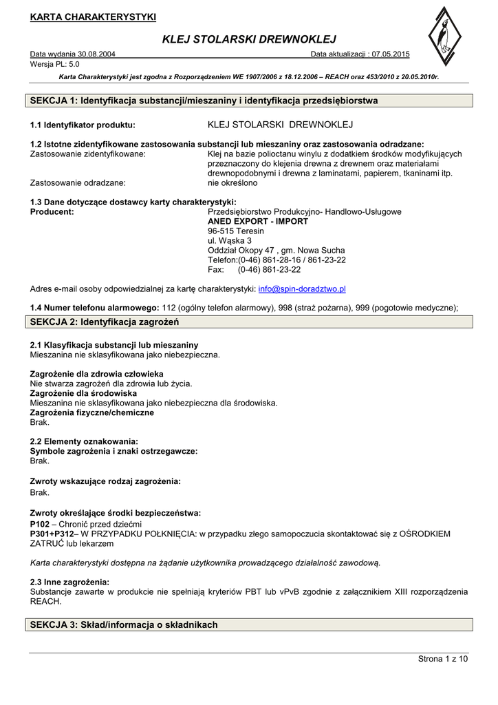 KARTA CHARAKTERYSTYKI KLEJ STOLARSKI DREWNOKLEJ Data wydania 30.08.2004 Wersja PL: 5.0 Data aktualizacji : 07.05.2015 Karta Charakterystyki jest zgodna z Rozporządzeniem WE 1907/2006 z 18.12.2006 – REACH oraz 453/2010 z 20.05.2010r. SEKCJA 1: Identyfikacja substancji/mieszaniny i identyfikacja przedsiębiorstwa 1.1 Identyfikator produktu: KLEJ STOLARSKI DREWNOKLEJ 1.2 Istotne zidentyfikowane zastosowania substancji lub mieszaniny oraz zastosowania odradzane: Zastosowanie zidentyfikowane: Klej na bazie polioctanu winylu z dodatkiem środków modyfikujących przeznaczony do klejenia drewna z drewnem oraz materiałami drewnopodobnymi i drewna z laminatami, papierem, tkaninami itp. Zastosowanie odradzane: nie określono 1.3 Dane dotyczące dostawcy karty charakterystyki: Producent: Przedsiębiorstwo Produkcyjno- Handlowo-Usługowe ANED EXPORT - IMPORT 96-515 Teresin ul. Wąska 3 Oddział Okopy 47 , gm. Nowa Sucha Telefon:(0-46) 861-28-16 / 861-23-22 Fax: (0-46) 861-23-22 Adres e-mail osoby odpowiedzialnej za kartę charakterystyki: [email protected] 1.4 Numer telefonu alarmowego: 112 (ogólny telefon alarmowy), 998 (straż pożarna), 999 (pogotowie medyczne); SEKCJA 2: Identyfikacja zagrożeń 2.1 Klasyfikacja substancji lub mieszaniny Mieszanina nie sklasyfikowana jako niebezpieczna. Zagrożenie dla zdrowia człowieka Nie stwarza zagrożeń dla zdrowia lub życia. Zagrożenie dla środowiska Mieszanina nie sklasyfikowana jako niebezpieczna dla środowiska. Zagrożenia fizyczne/chemiczne Brak. 2.2 Elementy oznakowania: Symbole zagrożenia i znaki ostrzegawcze: Brak. Zwroty wskazujące rodzaj zagrożenia: Brak. Zwroty określające środki bezpieczeństwa: P102 – Chronić przed dziećmi P301+P312– W PRZYPADKU POŁKNIĘCIA: w przypadku złego samopoczucia skontaktować się z OŚRODKIEM ZATRUĆ lub lekarzem Karta charakterystyki dostępna na żądanie użytkownika prowadzącego działalność zawodową. 2.3 Inne zagrożenia: Substancje zawarte w produkcie nie spełniają kryteriów PBT lub vPvB zgodnie z załącznikiem XIII rozporządzenia REACH. SEKCJA 3: Skład/informacja o składnikach Strona 1 z 10 KARTA CHARAKTERYSTYKI KLEJ STOLARSKI DREWNOKLEJ Data wydania 30.08.2004 Wersja PL: 5.0 Data aktualizacji : 07.05.2015 Karta Charakterystyki jest zgodna z Rozporządzeniem WE 1907/2006 z 18.12.2006 – REACH oraz 453/2010 z 20.05.2010r. 3.1 Substancje: nie dotyczy 3.2 Mieszaniny: Niebezpieczne składniki: Identyfikator produktu Zawartość % Toluen CAS: 108-88-3 WE: 203-625-9 Nr indeksowy: 601-021-00-3 Nr REACH: 01-2119471310-510001 0–3 Octan winylu CAS: 108-05-4 WE: 203-545-4 Nr indeksowy: 607-023-00-0 Nr REACH: 01-2119471301-50XXXX < 0,5 Kwas mrówkowy CAS: 64-18-6 WE: 200-579-1 Nr indeksowy: 607-001-00-0. Nr REACH: wymieniona substancja nie < 0,1 Klasyfikacja CLP Kody zwrotów Klasa zagrożenia i wskazujących kody kategorii rodzaj zagrożenia Flam. Liq. 2 H225 Repr.2 H361d Asp.Tox.1 H304 STOT RE 2 H373 Skin Irrit. 2 H315 STOT SE 3 H336 Flam. Liq. 2; Skin Corr. 1A; H225 H314 posiada w chwili obecnej numeru rejestracyjnego zgodnie z rozporządzeniem REACH, podlega przepisom okresu przejściowego Pełna treść zwrotów R i H w sekcji 16 SEKCJA 4: Środki pierwszej pomocy 4.1 Opis środków pierwszej pomocy Uwagi ogólne W przypadku wystąpienia jakichkolwiek objawów lub w przypadku wątpliwości zasięgnąć porady lekarza. W przypadku kontaktu ze skórą: Umyć zabrudzoną skórę wodą z mydłem, spłukać dokładnie wodą, w przypadku pojawienia się podrażnienia, rumieni skontaktować się z lekarzem. W przypadku kontaktu z oczami: Przepłukać oczy przez kilkanaście minut (ok. 15) dużą ilością wody, trzymając powieki szeroko rozwarte. Unikać silnego strumienia, ze względu na niebezpieczeństwo uszkodzenia rogówki, skontaktować się z lekarzem. Narażenie inhalacyjne: W razie zawrotów głowy lub nudności wyprowadzić poszkodowanego na świeże powietrze, w razie braku szybkiej poprawy zasięgnąć porady lekarza. Przytomnego ułożyć w pozycji półsiedzącej, zapewnić spokój i ciepło; nieprzytomnego ułożyć w pozycji bocznej ustalonej, oczyścić jamę ustną i nos z wydzieliny, usunąć z niej ciała obce. W przypadku zaburzeń w oddychaniu podawać tlen; w przypadku braku oddechu stosować sztuczne oddychanie. W przypadku połknięcia: Nie wywoływać wymiotów, natychmiast skontaktować się z lekarzem. Nie podawać niczego doustnie osobie nieprzytomnej. Nie podawać mleka, tłuszczów, alkoholu. Skontaktować się z lekarzem. 4.2 Najważniejsze ostre i opóźnione objawy oraz skutki narażenia: Brak dostępnych informacji. Strona 2 z 10 KARTA CHARAKTERYSTYKI KLEJ STOLARSKI DREWNOKLEJ Data wydania 30.08.2004 Wersja PL: 5.0 Data aktualizacji : 07.05.2015 Karta Charakterystyki jest zgodna z Rozporządzeniem WE 1907/2006 z 18.12.2006 – REACH oraz 453/2010 z 20.05.2010r. 4.3 Wskazania dotyczące wszelkiej natychmiastowej pomocy lekarskiej i szczególnego postępowania z poszkodowanym: Decyzję o sposobie postępowania podejmuje lekarz po ocenie stanu poszkodowanego. SEKCJA 5: Postępowanie w przypadku pożaru 5.1 Środki gaśnicze: Odpowiednie środki gaśnicze: piana alkoholoodporna lub suche proszki gaśnicze (A,B,C), dwutlenek węgla (gaśnica śniegowa), piasek lub ziemia, mgła wodna. Stosować metody gaśnicze odpowiednie do warunków otoczenia. Niewłaściwe środki gaśnicze: Silny strumień wody. 5.2 Szczególne zagrożenia związane z substancją lub mieszaniną: W trakcie pożaru, pod wpływem działania wysokich temperatur mogą uwalniać się toksyczne produkty rozkładu. 5.3 Informacje dla straży pożarnej: Pojemniki znajdujące się w strefie pożaru chłodzić rozproszonym strumieniem wody, o ile jest to możliwe usunąć ze strefy zagrożenia. W przypadku pożaru w zamkniętym pomieszczeniu należy stosować odzież ochronną i aparat oddechowy na sprężone powietrze. Nie dopuszczać do przedostania się wody gaśniczej do wód powierzchniow