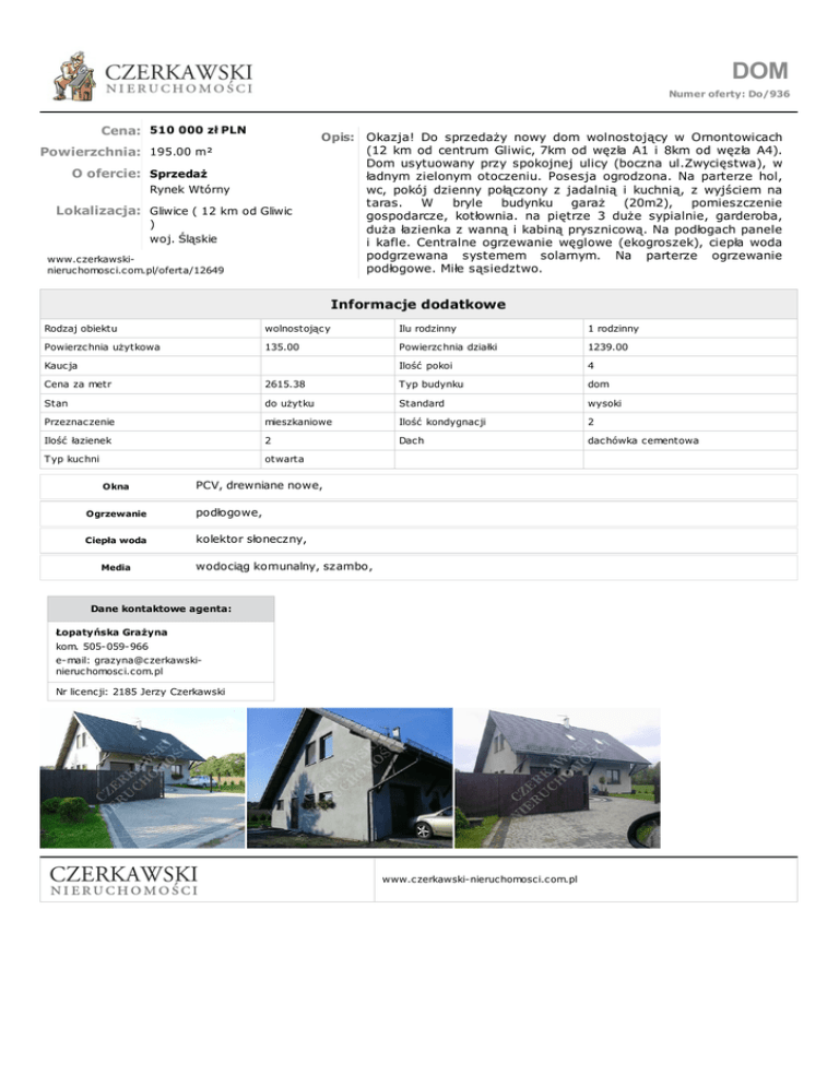 DOM Numer oferty: Do/936 Cena: 510 000 zł PLN Powierzchnia: 195.00 m² O ofercie: Sprzedaż Rynek Wtórny Lokalizacja: Gliwice ( 12 km od Gliwic ) woj. Śląskie www.czerkawskinieruchomosci.com.pl/oferta/12649 Opis: Okazja! Do sprzedaży nowy dom wolnostojący w Ornontowicach (12 km od centrum Gliwic, 7km od węzła A1 i 8km od węzła A4). Dom usytuowany przy spokojnej ulicy (boczna ul.Zwycięstwa), w ładnym zielonym otoczeniu. Posesja ogrodzona. Na parterze hol, wc, pokój dzienny połączony z jadalnią i kuchnią, z wyjściem na taras. W bryle budynku garaż (20m2), pomieszczenie gospodarcze, kotłownia. na piętrze 3 duże sypialnie, garderoba, duża łazienka z wanną i kabiną prysznicową. Na podłogach panele i kafle. Centralne ogrzewanie węglowe (ekogroszek), ciepła woda podgrzewana systemem solarnym. Na parterze ogrzewanie podłogowe. Miłe sąsiedztwo. Informacje dodatkowe Rodzaj obiektu wolnostojący Ilu rodzinny 1 rodzinny Powierzchnia użytkowa 135.00 Powierzchnia działki 1239.00 Ilość pokoi 4 Kaucja Cena za metr 2615.38 Typ budynku dom Stan do użytku Standard wysoki Przeznaczenie mieszkaniowe Ilość kondygnacji 2 Ilość łazienek 2 Dach dachówka cementowa Typ kuchni otwarta Okna PCV, drewniane nowe, Ogrzewanie podłogowe, Ciepła woda kolektor słoneczny, Media wodociąg komunalny, szambo, Dane kontaktowe agenta: Łopatyńska Grażyna kom. 505-059-966 e-mail: [email protected] Nr licencji: 2185 Jerzy Czerkawski www.czerkawski-nieruchomosci.com.pl
